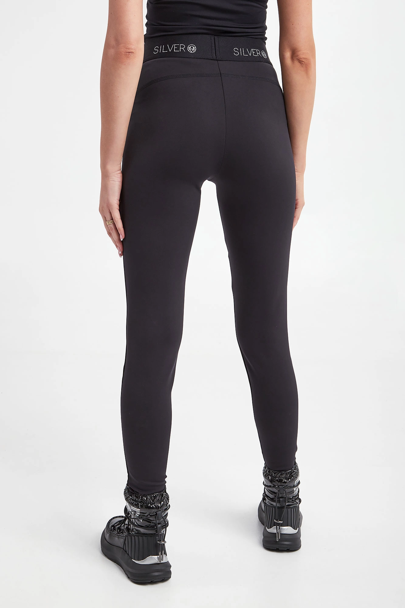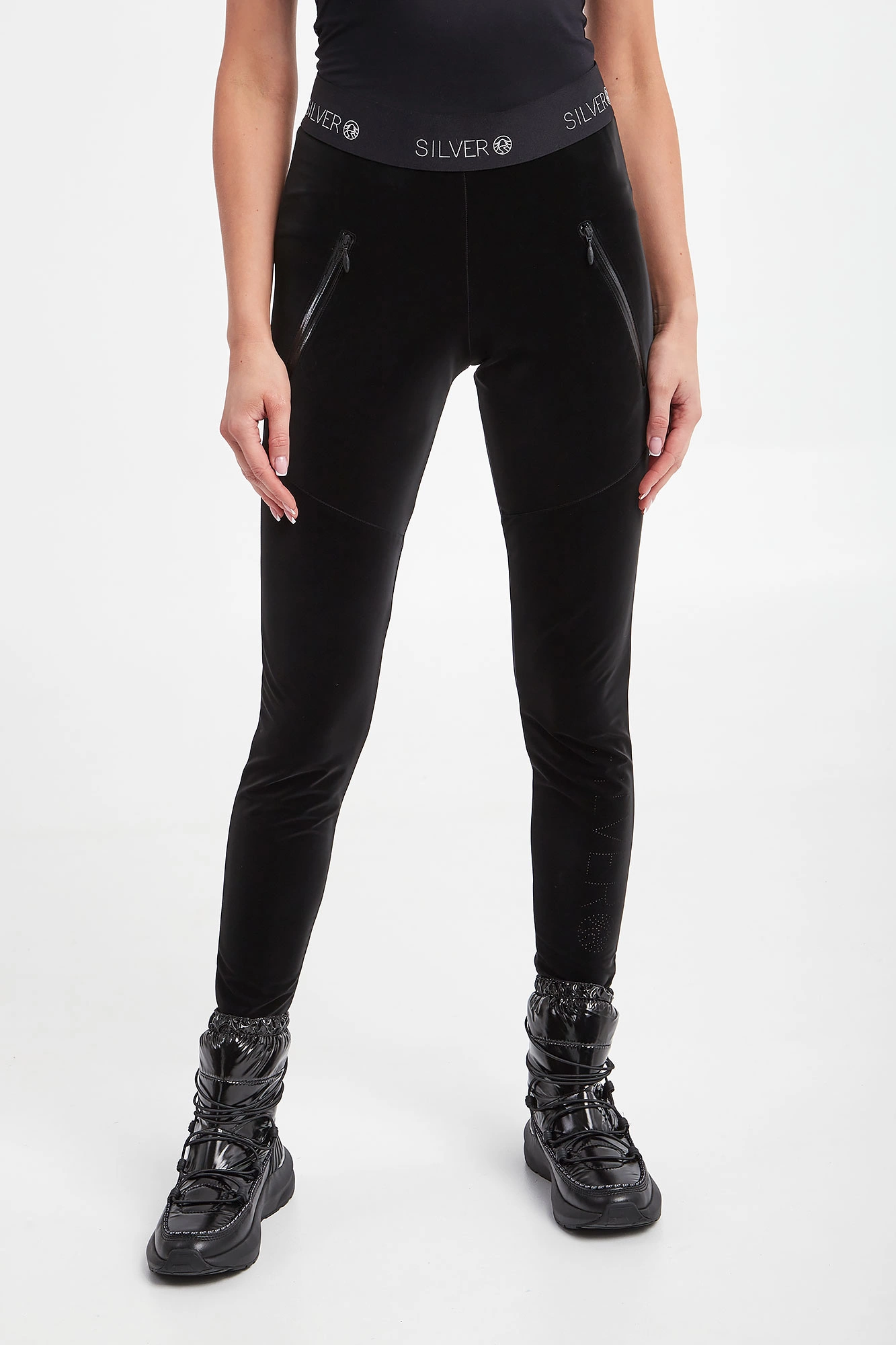 Legginsy marki Sportalm w czarnym kolorze. Fason typu skinny. Z przodu wykonane z tkaniny o aksamitnym wykończeniu. W pasie elastyczny, sygnowany ściągacz. Dwie boczne, zamykane kieszenie z logowanymi zawieszkami. Nogawki wykończone lamówką.