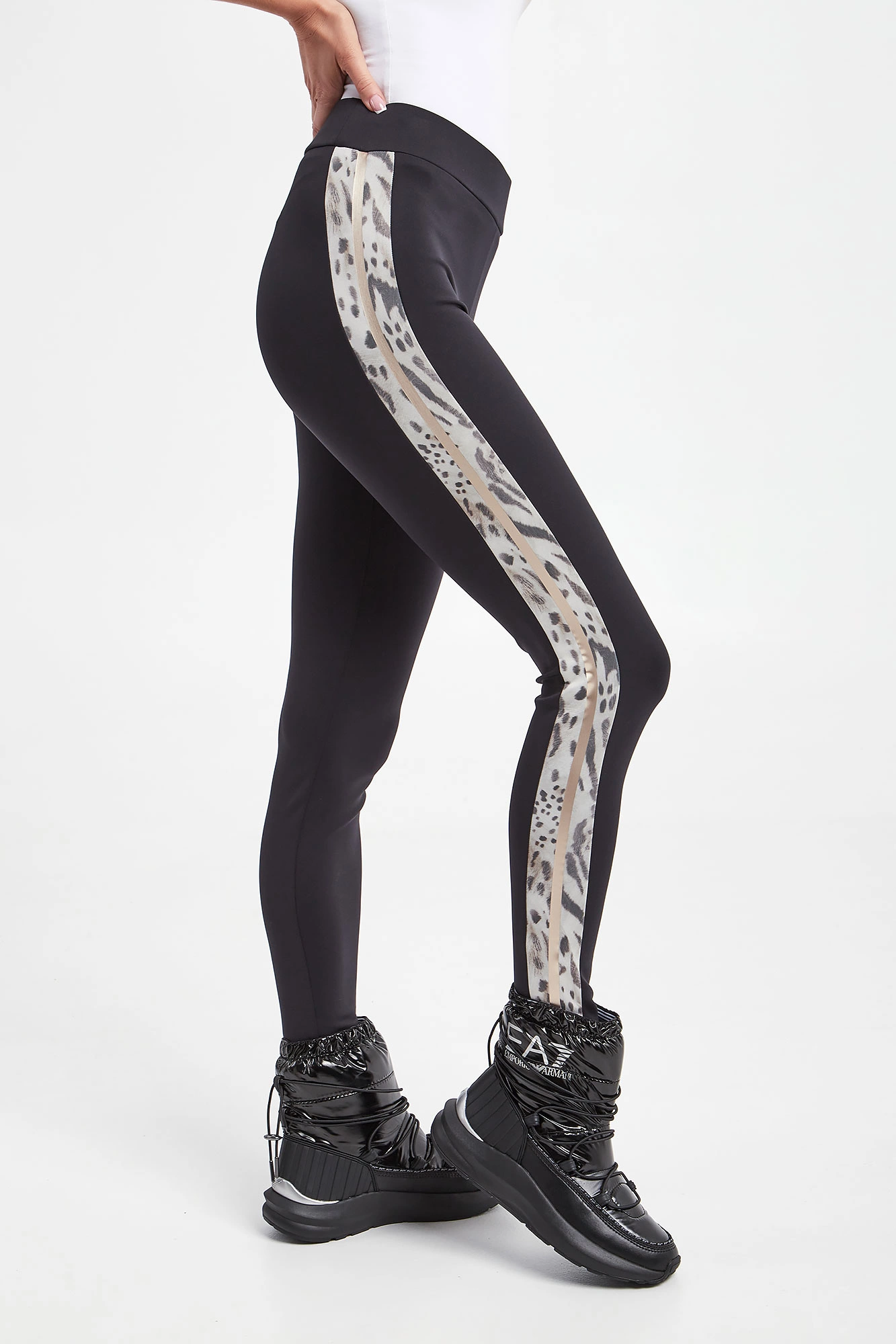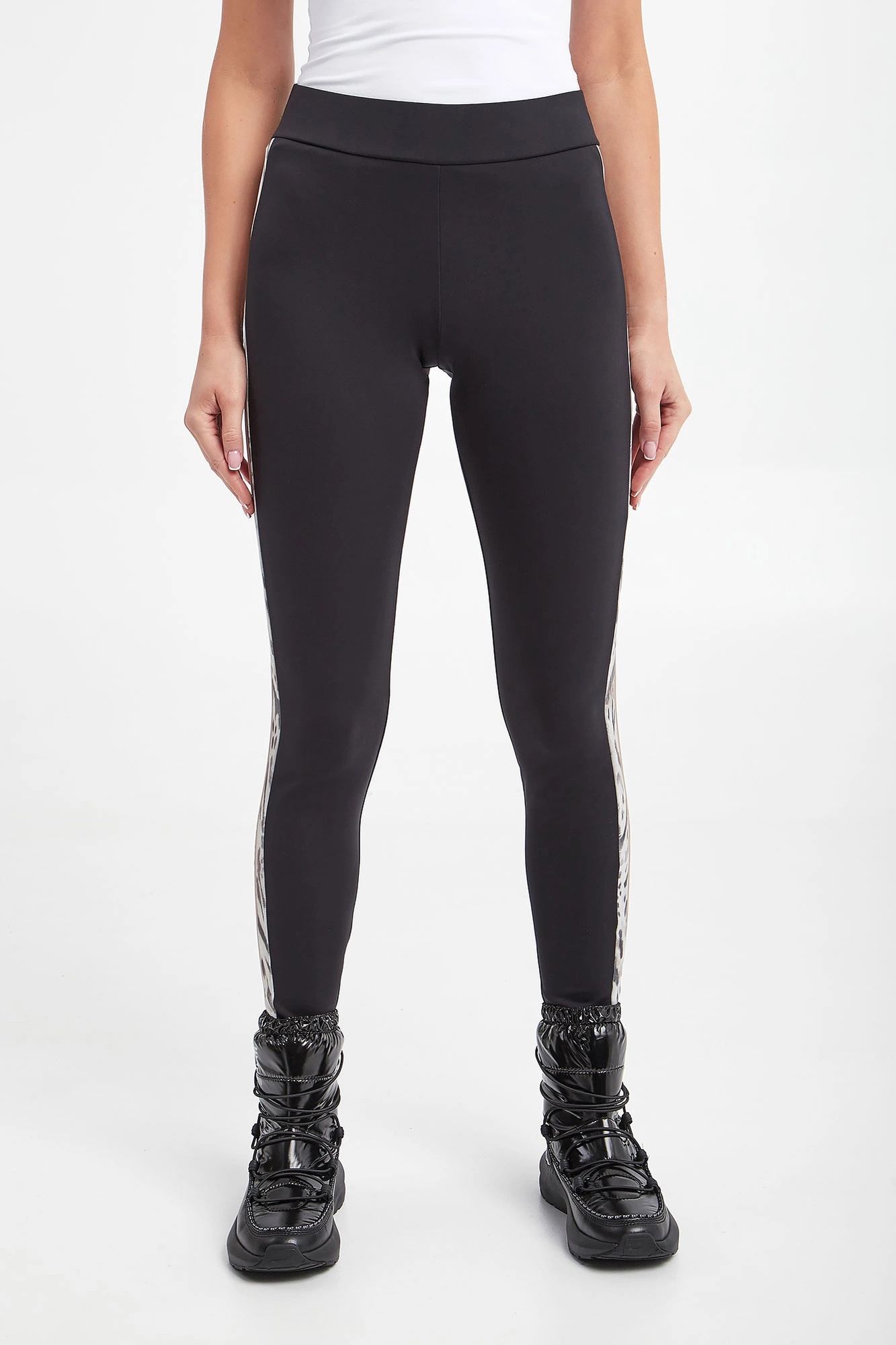 Legginsy marki Sportalm w czarnym kolorze. Po bokach beżowe lampasy w zwierzęcy wzór z ozdobnym, połyskującym paskiem. W pasie elastyczny ściągacz. Nogawki zakończone lamówką. Fason typu skinny. Wykonane z gładkiej, elastycznej tkaniny.