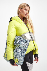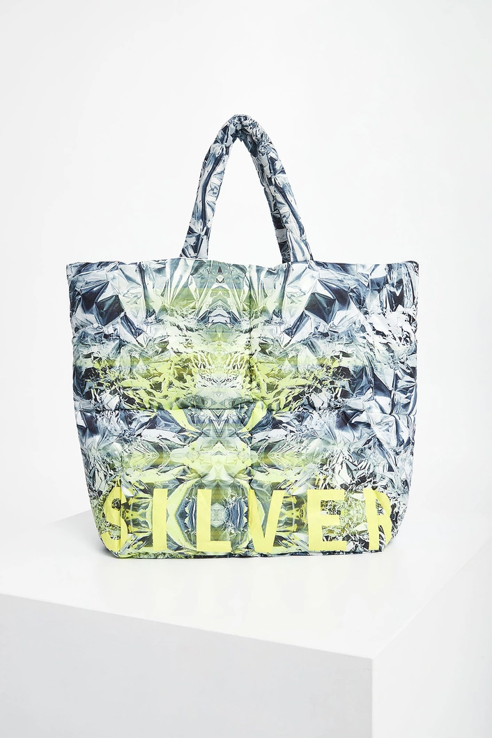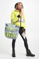 Torebka pikowana marki Sportalm. Na całości wielokolorowy wzór. Z przodu nadruk w żółtym kolorze. Środek wypełniony srebrnym połyskującym materiałem. Wewnątrz otwarte małe kieszenie oraz kieszonka na suwak. Do noszenia na podwójnych rączkach. Zapięcie na zatrzask.