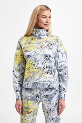 Bluza marki Sportalm w srebrnym kolorze. Na całości kolorowy, geometryczny wzór. Dekolt wykończony golfem. Obniżona linia ramion. Długie rękawy i dół wykończone ściągaczem. Z przodu kangurkowa kieszeń. Fason typu relaxed. Wykonana z elastycznej tkaniny.