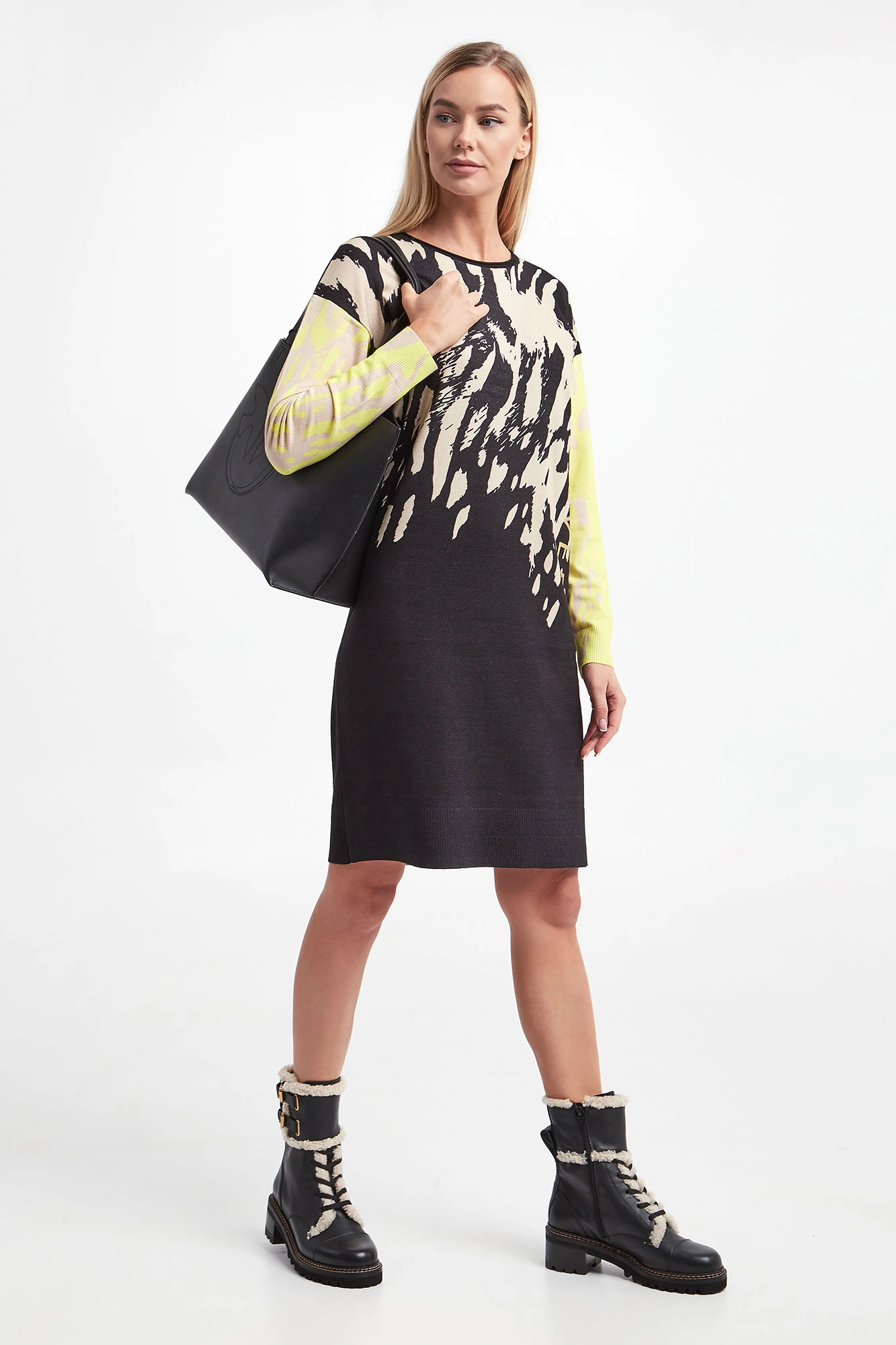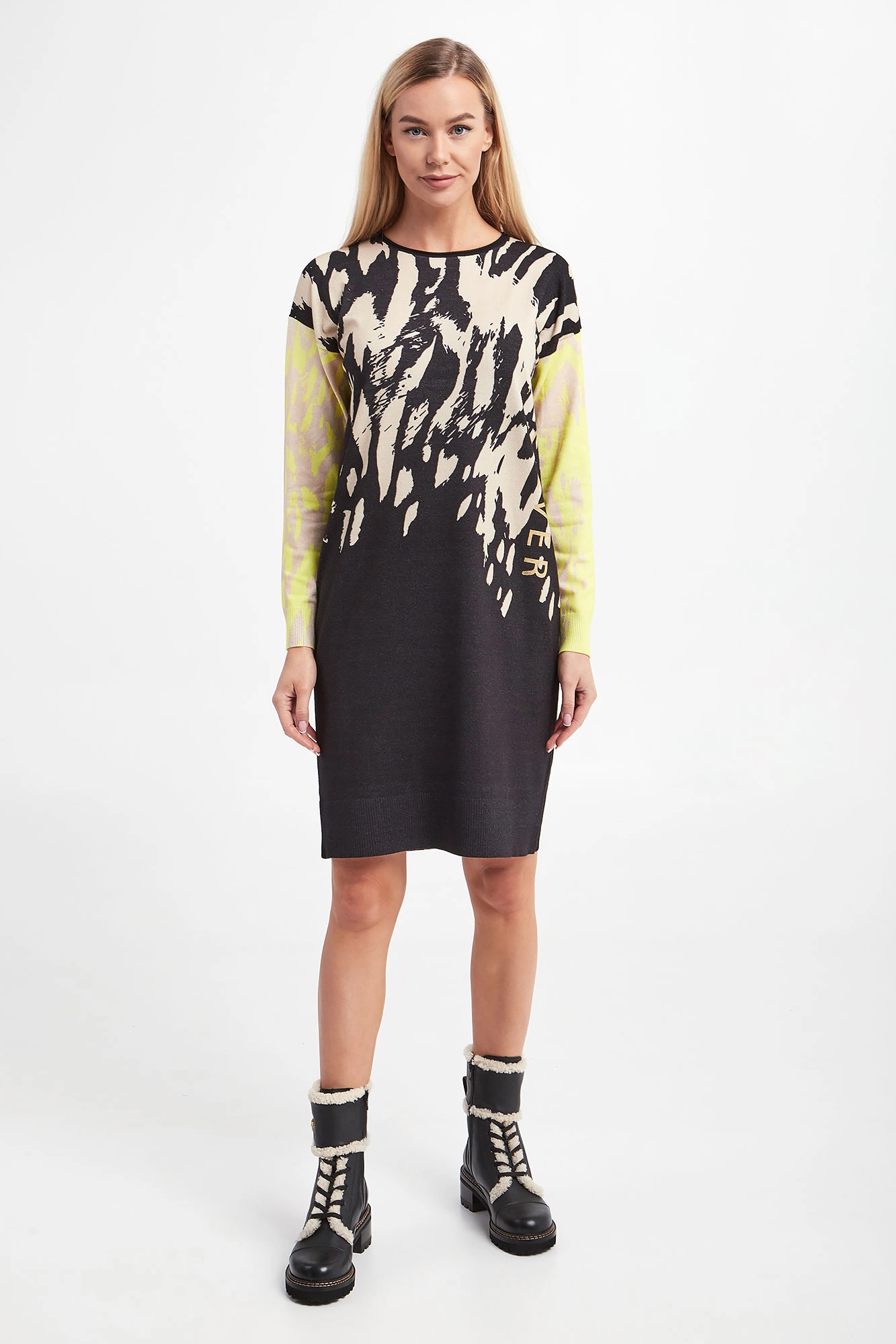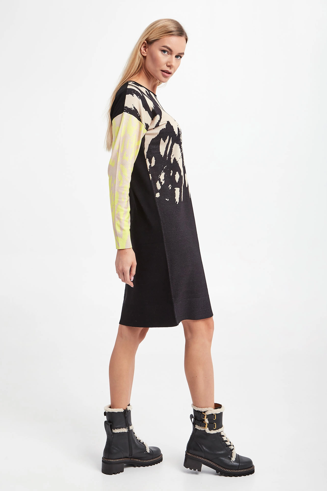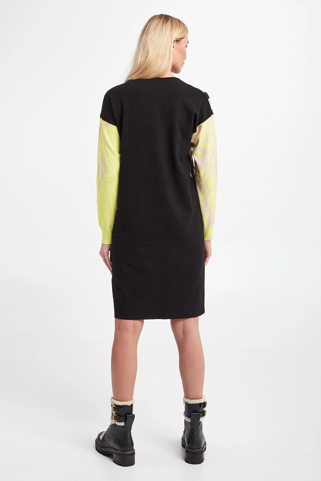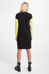 Sukienka marki Sportalm w czarnym kolorze. Dekolt typu o-neck. Obniżona linia ramion. Z przodu i na rękawach beżowy wzorzysty nadruk. Rękawy w żółtym neonowym kolorze. Zakończona prążkowanymi ściągaczami. Fason typu relaxed.