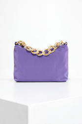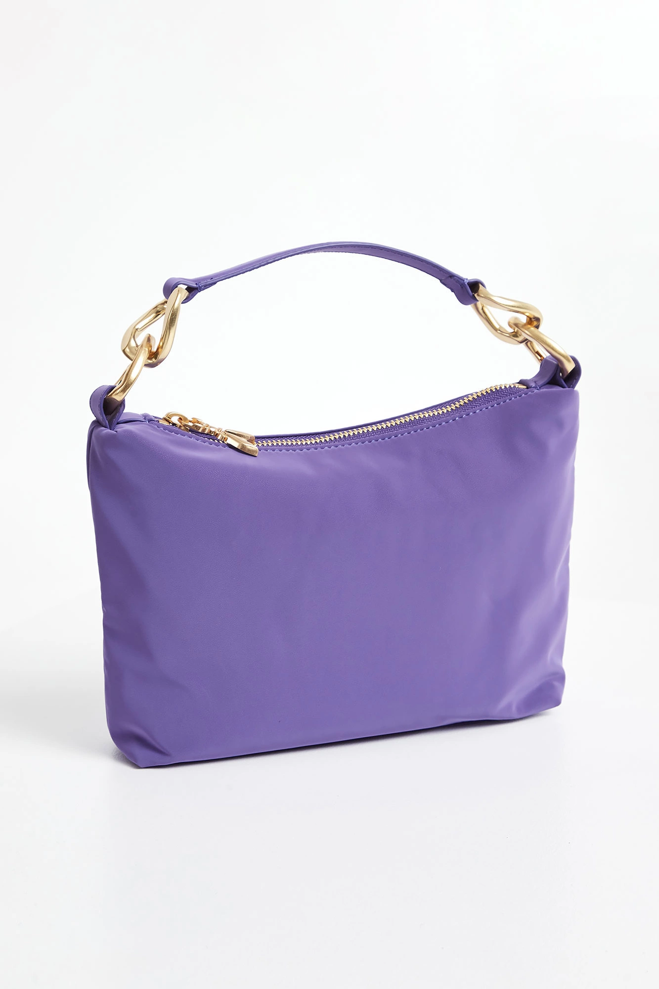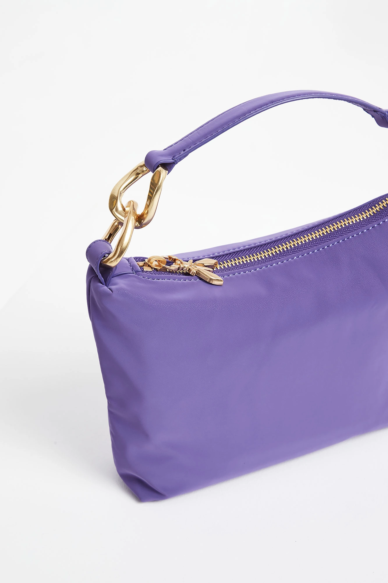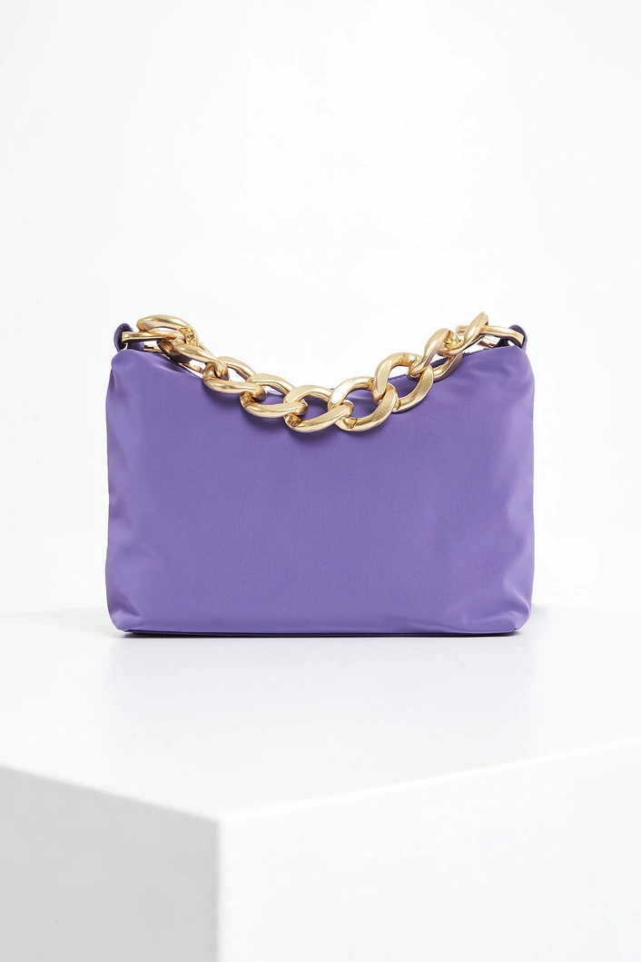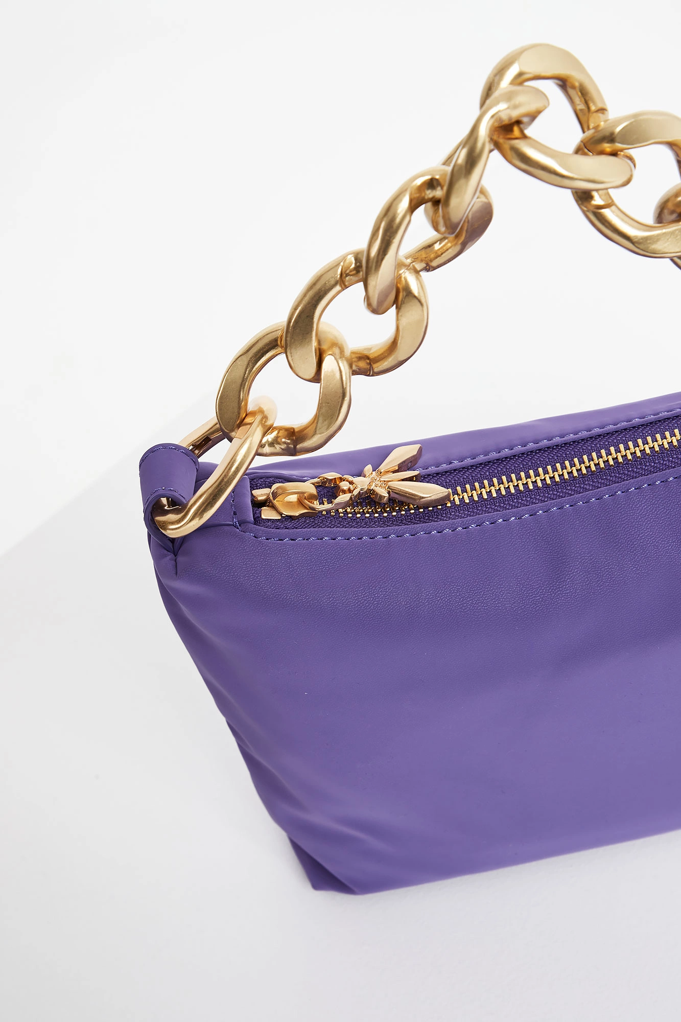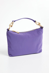Torebka marki Patrizia Pepe w kolorze fioletowym. Typu hobo. Wykonana z nylonu z efektem aksamitu. Wymienne rączki, jedna w formie paska, druga łańcucha. Jednokomorowa. Czarna logowana podszewka. Zapinana za pomocą zamka błyskawicznego w złotym kolorze z przywieszką Fly.