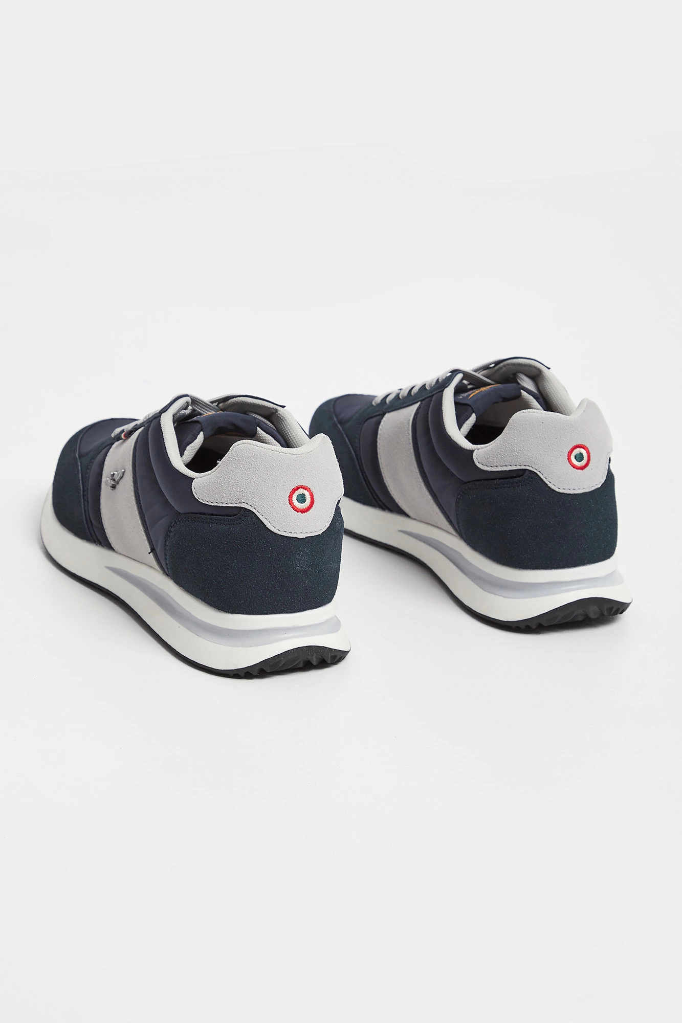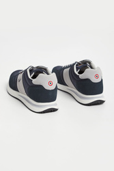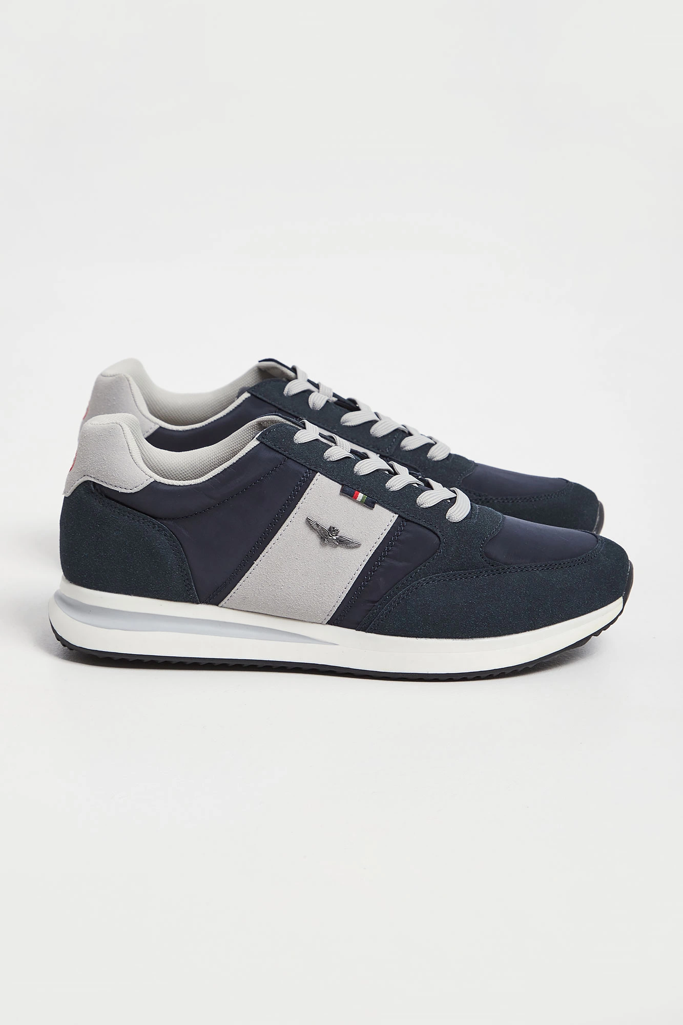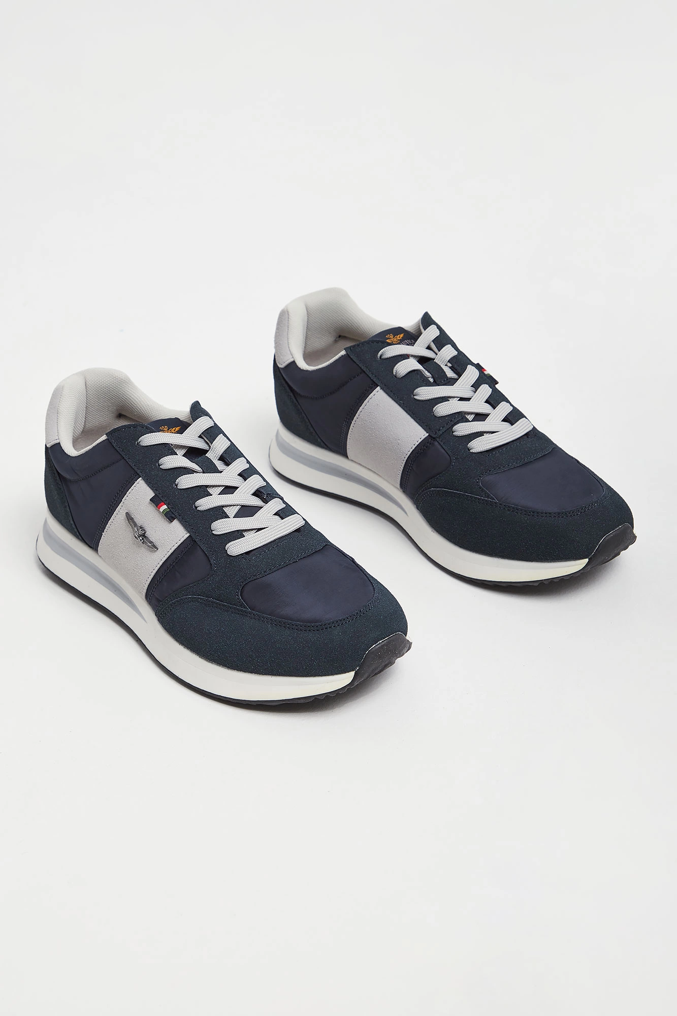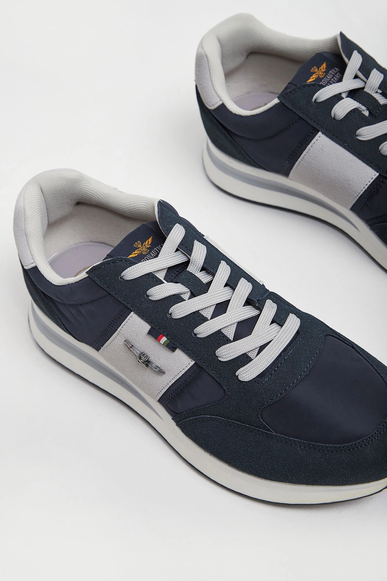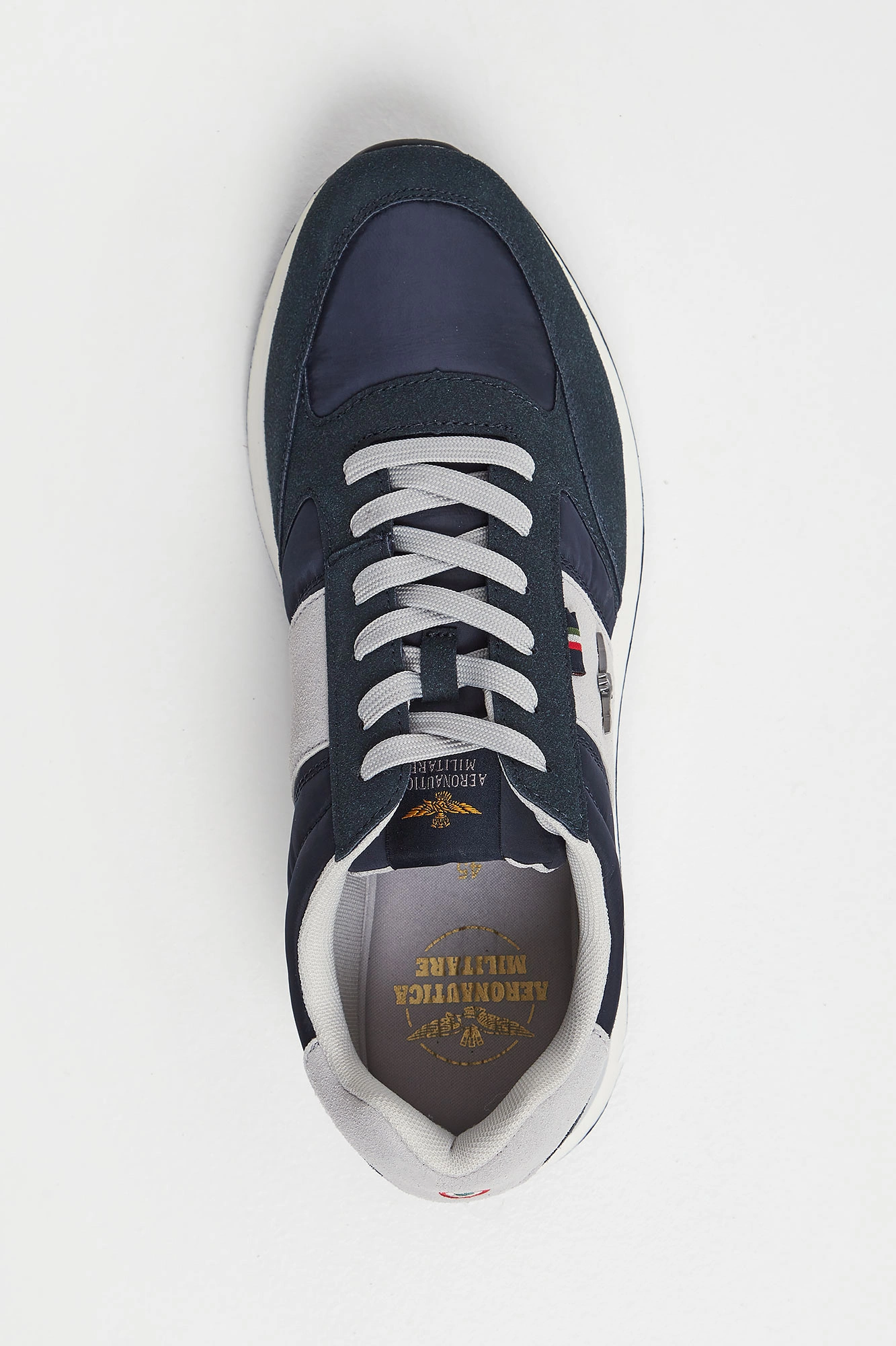 Sneakersy marki Aeronautica Militare w granatowym kolorze. Z boku szare, kontrastujące wstawki ze skóry ozdobione metalową aplikacją z logo marki, Na cholewce buta granatowe przeszycia z zamszu. Zapiętka ze skórzanymi naszywkami w kolorze szarym i granatowym. Na języku naszywka z logo marki. Całości dopełnia wysoka, dwukolorowa podeszwa. Wiązane za pomocą szarych sznurówek. Szara wyściółka i sygnowana wkładka.