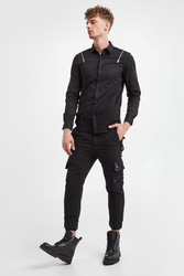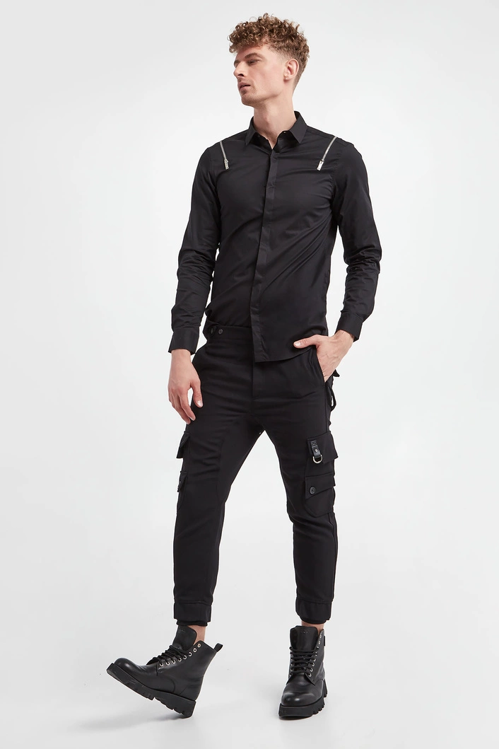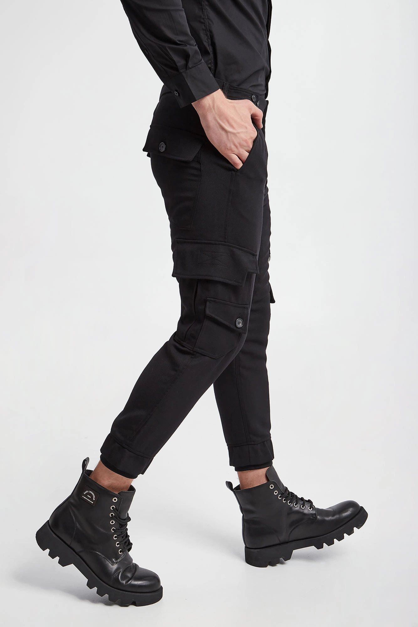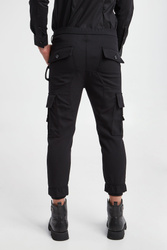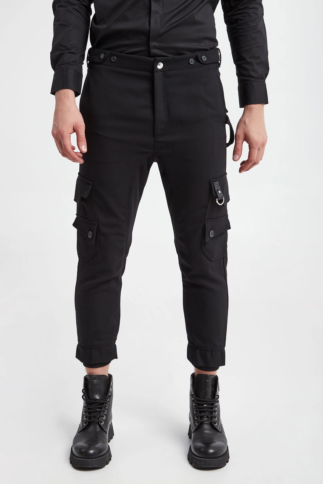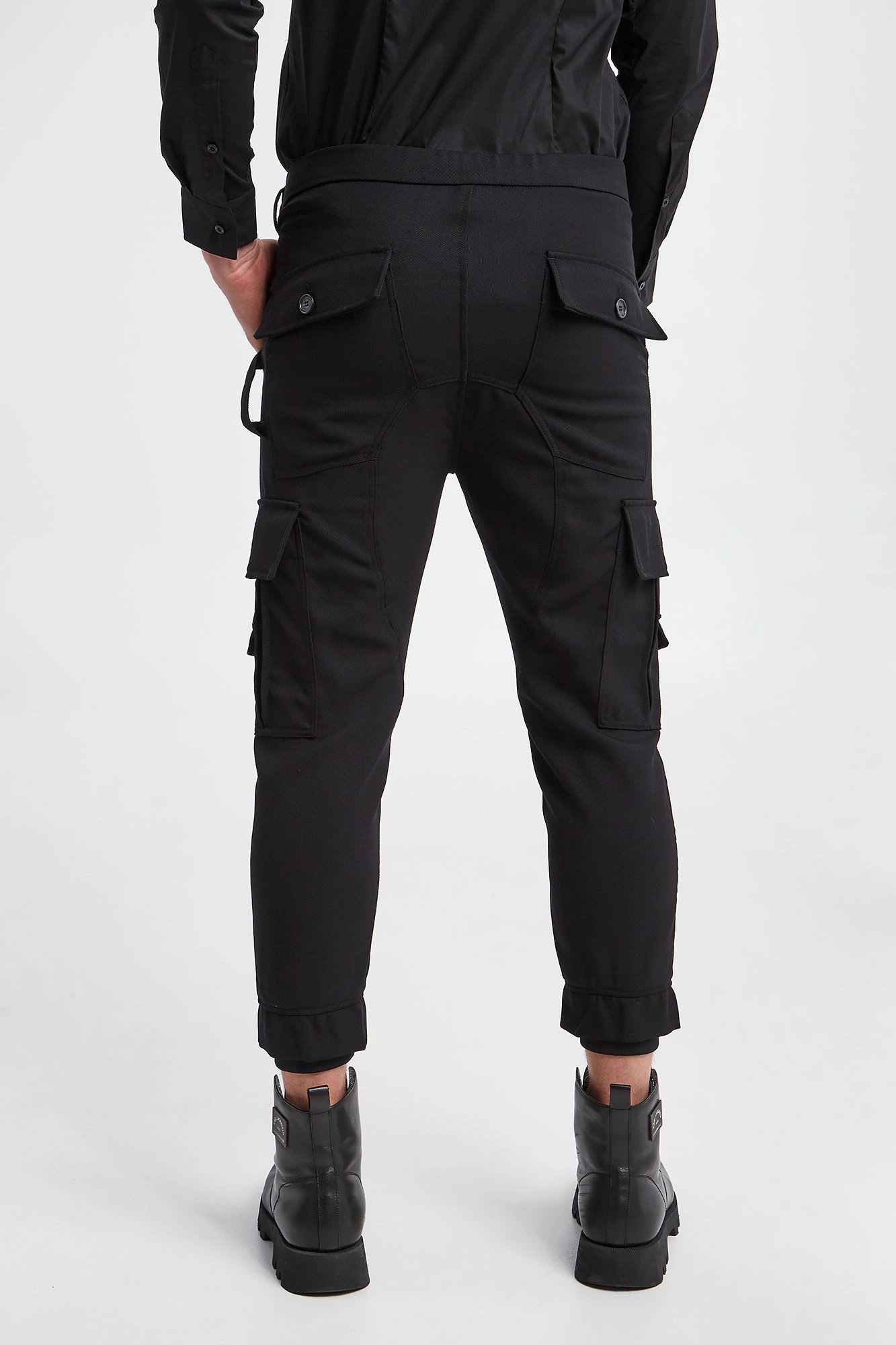 Wełniane spodnie typu cargo marki Les Hommes w czarnym kolorze. Zapinane za pomocą zamka i sygnowanej napy. Model z ośmioma kieszeniami. Na nogawkach ozdobne sprzączki i paski. W pasie regulacja za pomocą paska zapinanego na guziki. Nogawki zakończone ściągaczami.