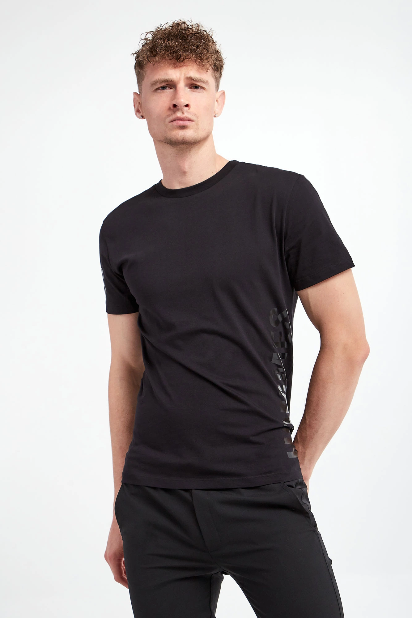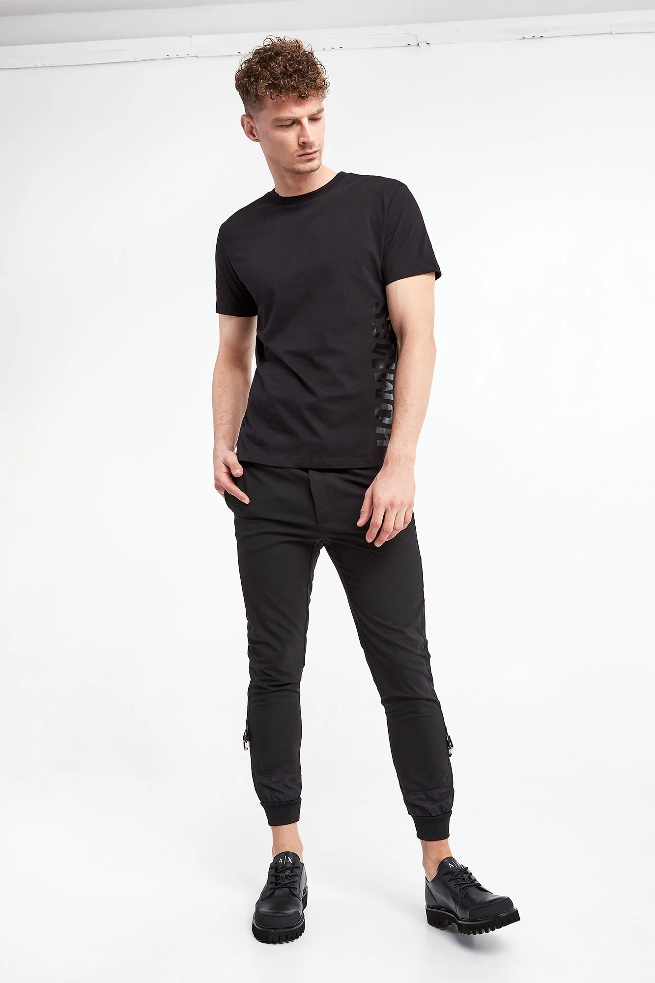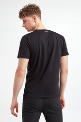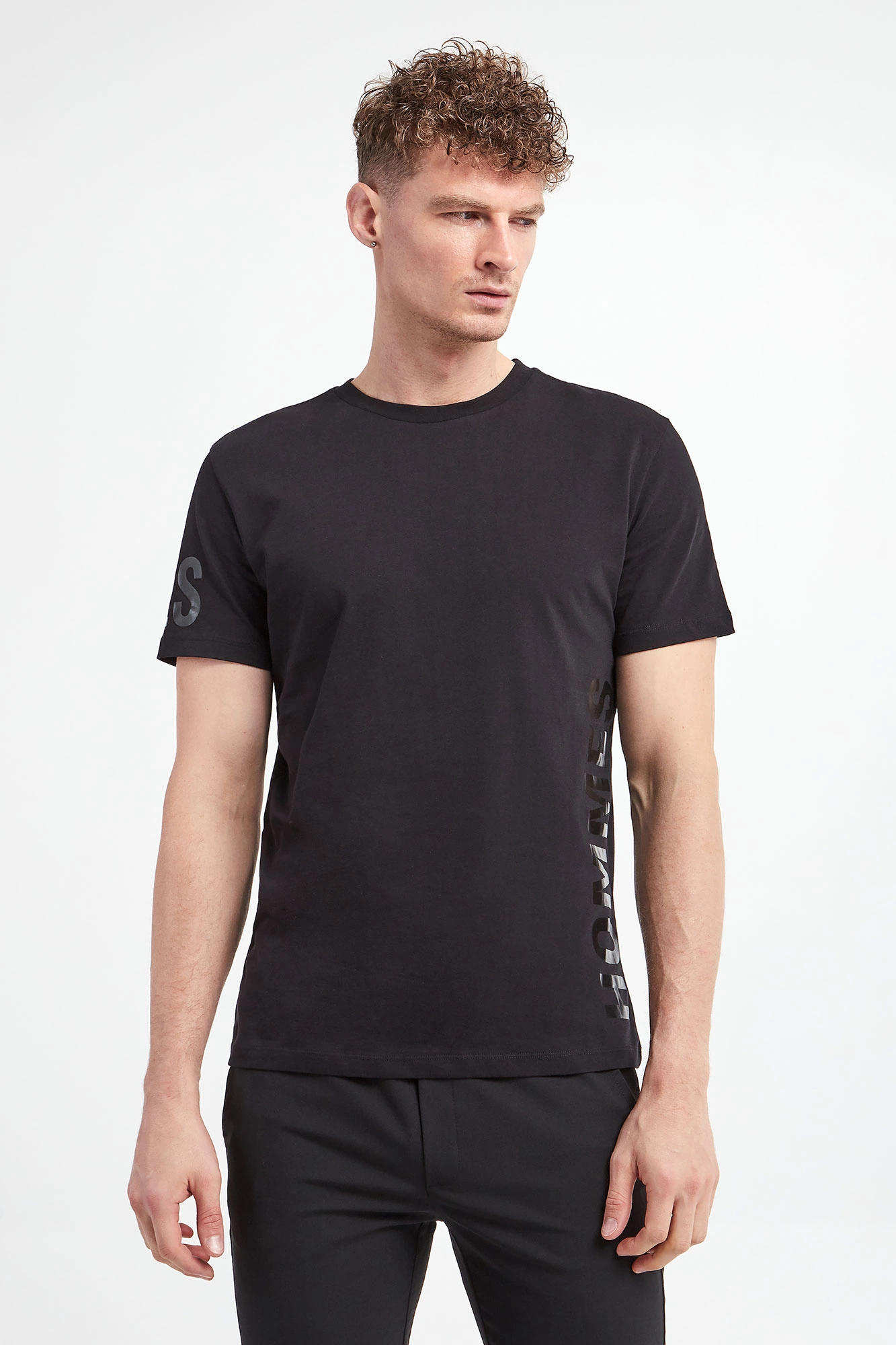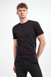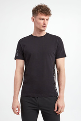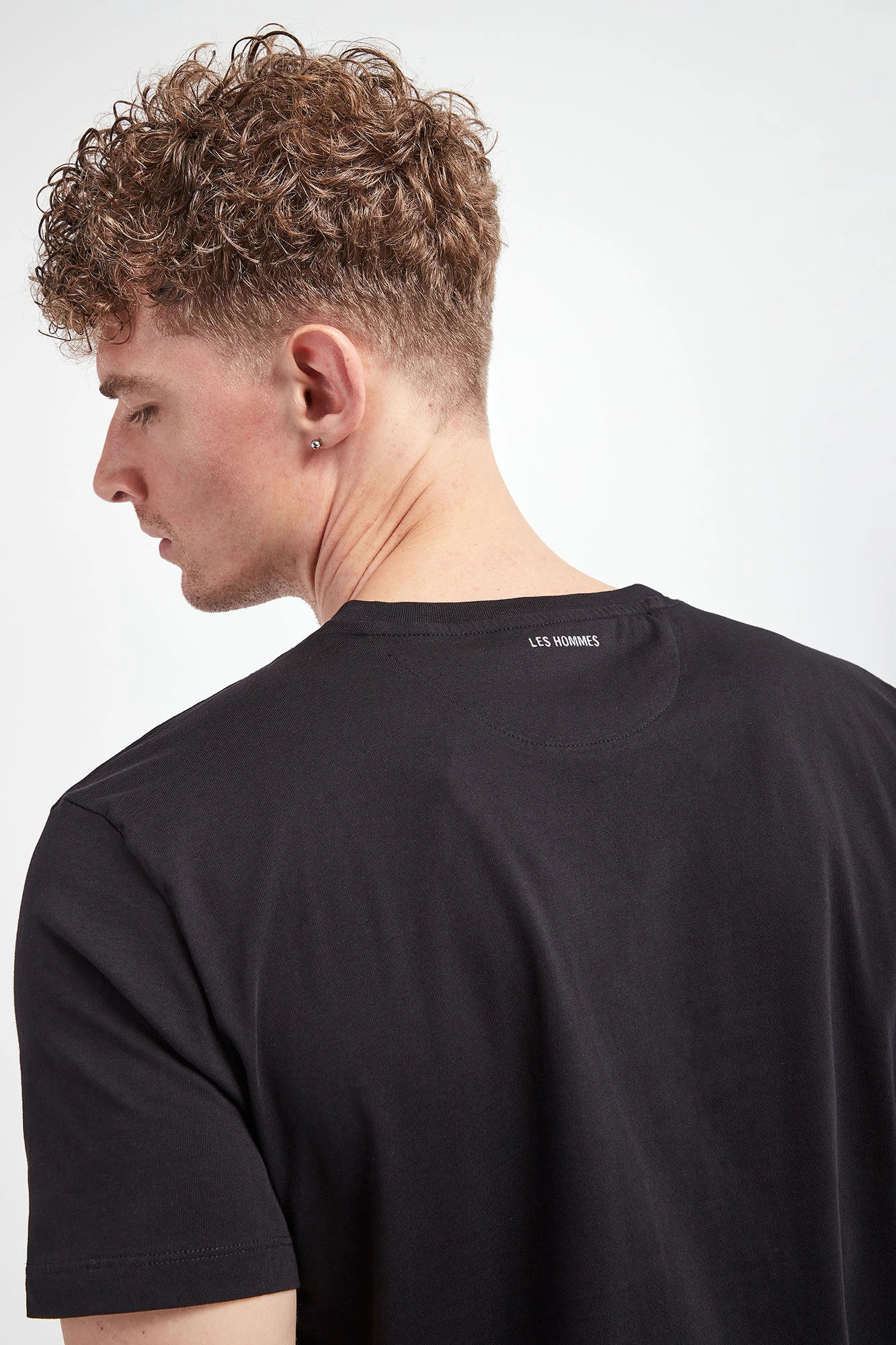 T-shirt marki Les Hommes w czarnym kolorze. Na rękawie i po boku połyskujący nadruk z logo. Dekolt typu o-neck zakończony ściągaczem. Krótkie rękawy i dół wykończone lamówką. Na linii karku sygnowany, srebrny nadruk. Fason typu slim. Wykonany ze stuprocentowej bawełny.