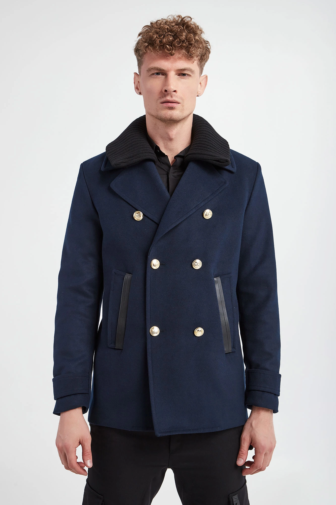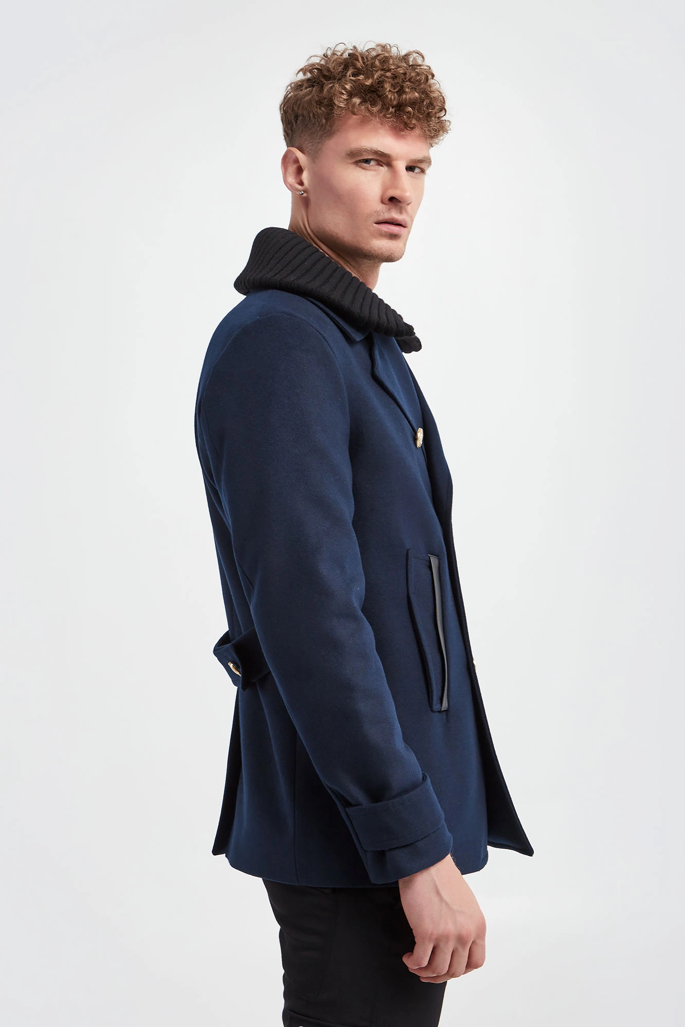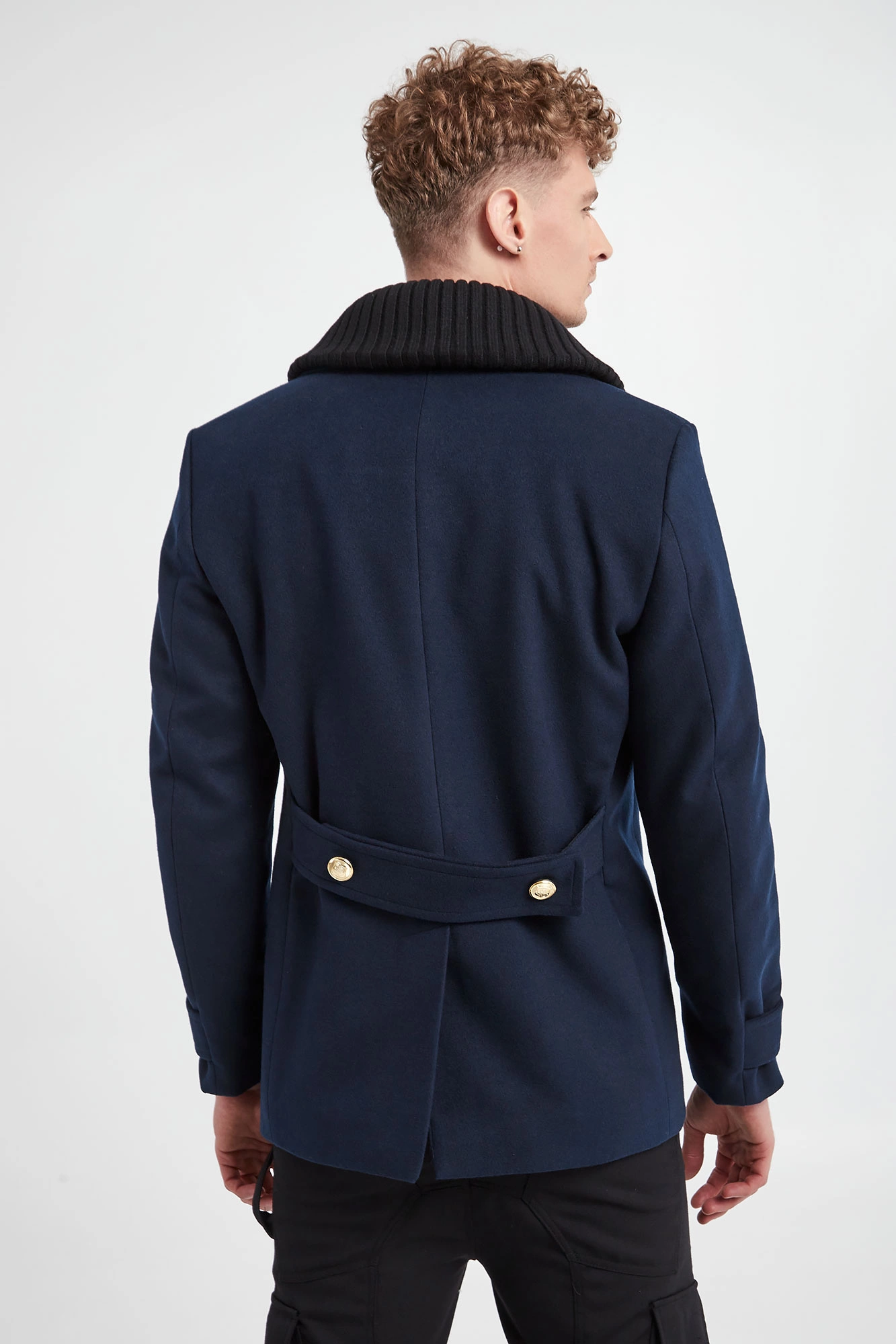 Wełniany płaszcz marki Les Hommes w granatowym kolorze. Zapinany za pomocą dwurzędowych, złotych, biżuteryjnych guzików. Wywijany kołnierz z odpinanym, czarnym ściągaczem. Dwie boczne, wpuszczane kieszenie. Rękawy z mankietami. Z tyłu ozdobny pasek. Fason typu regular.