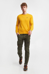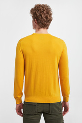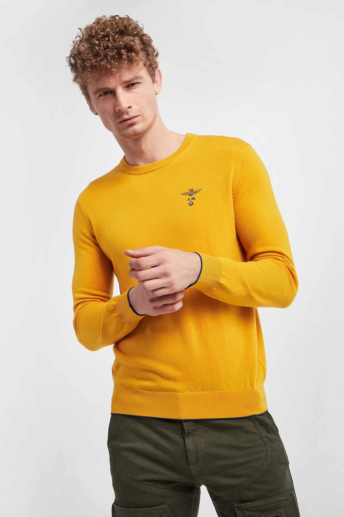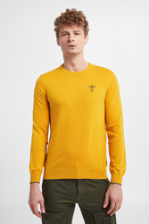 Wełniany sweter marki Aeronaitica Militare w żółtym kolorze. Fason prosty. Z boku niewielki haft z logo i nazwą marki. Dekolt typu o-neck, rękawy i dół wykończone ściągaczem. Wykonany z miękkiej, wełnianej tkaniny.