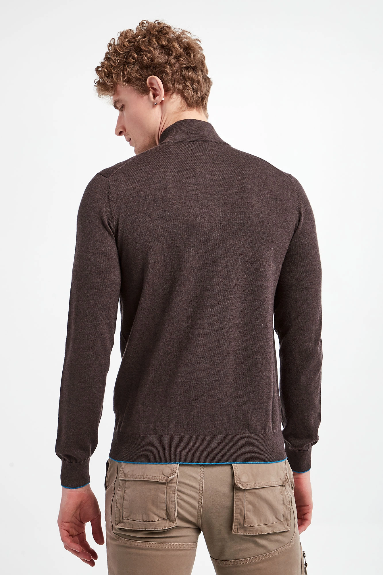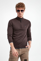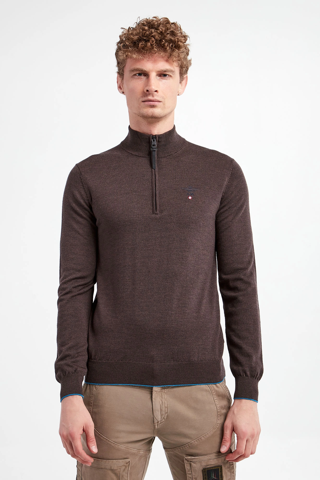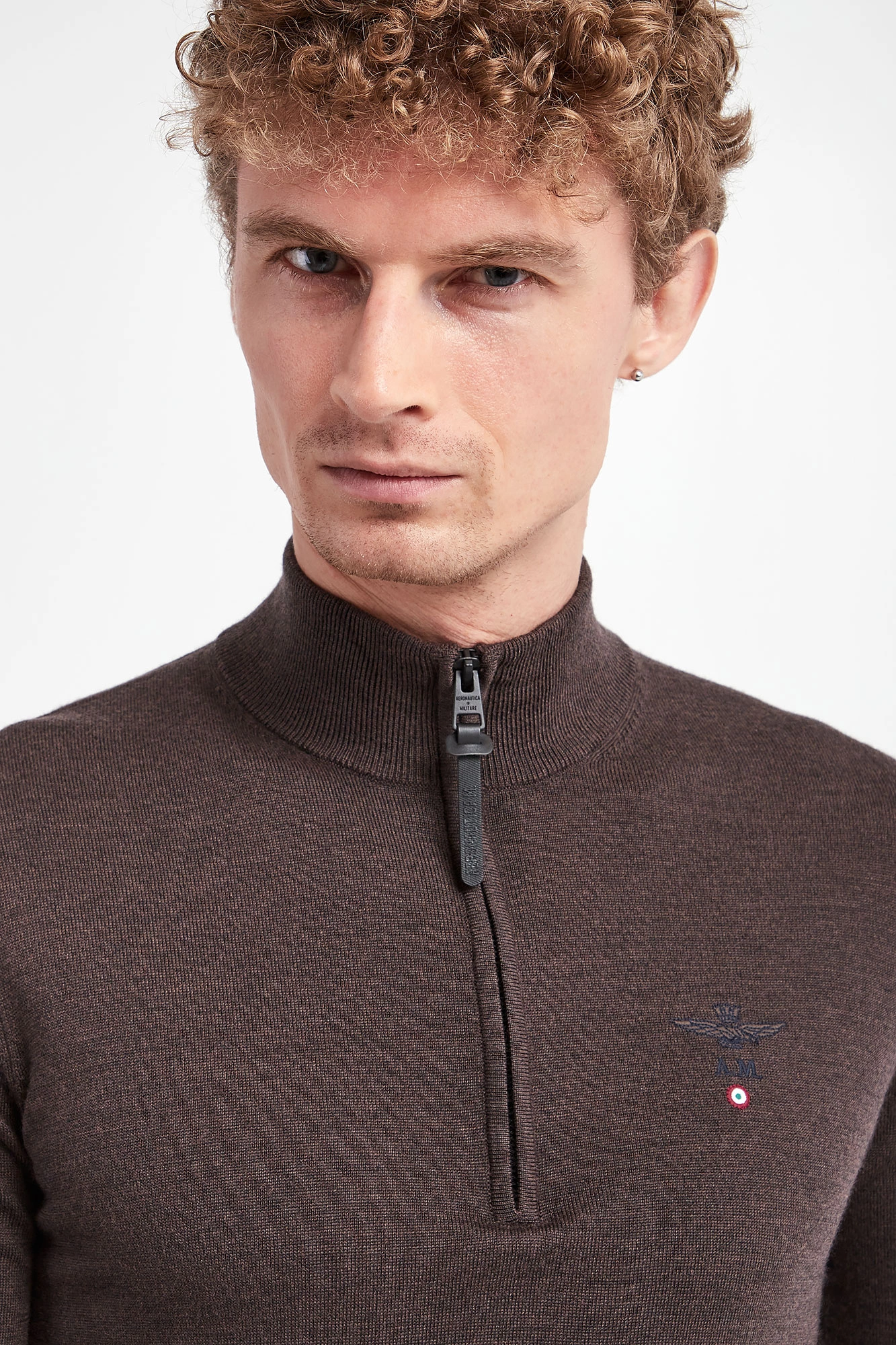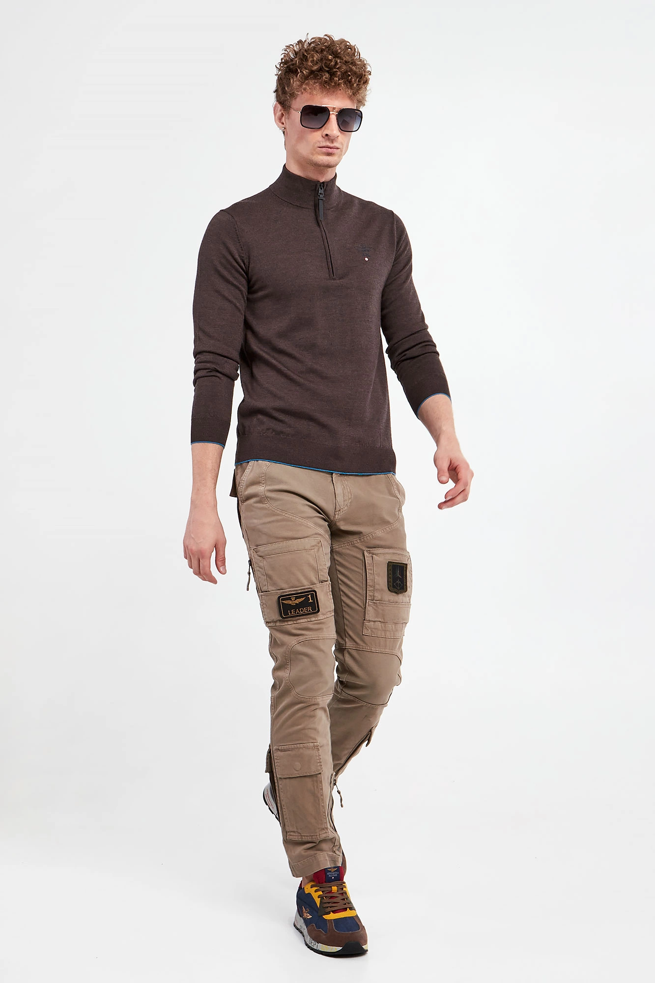 Wełniany sweter marki Aeronaitica Militare w brązowym kolorze. Ze stójką, zapinaną za pomocą zamka. Fason prosty. Z boku niewielki haft z logo i nazwą marki. Dekolt, rękawy i dół wykończone ściągaczem. Wykonany z miękkiej, wełnianej tkaniny. Rękawy i dół wykończone niebieskim lampasem.