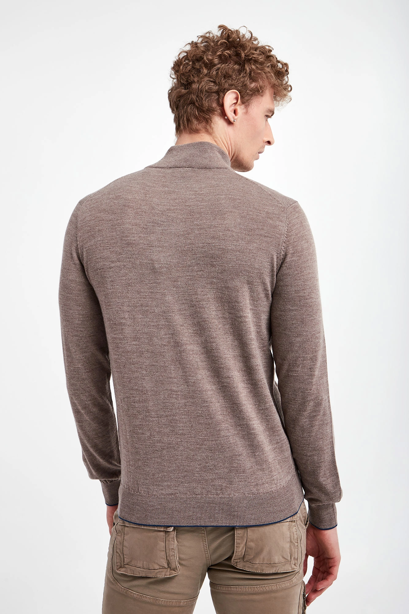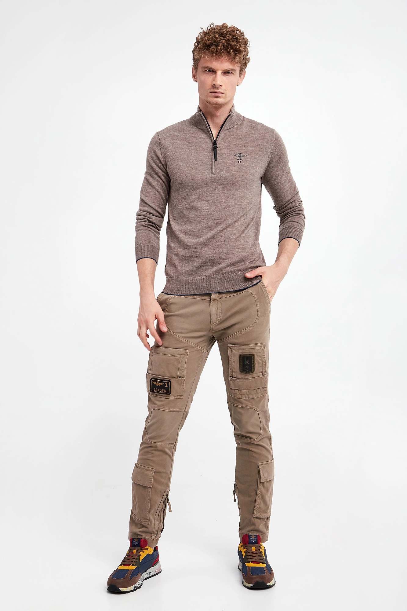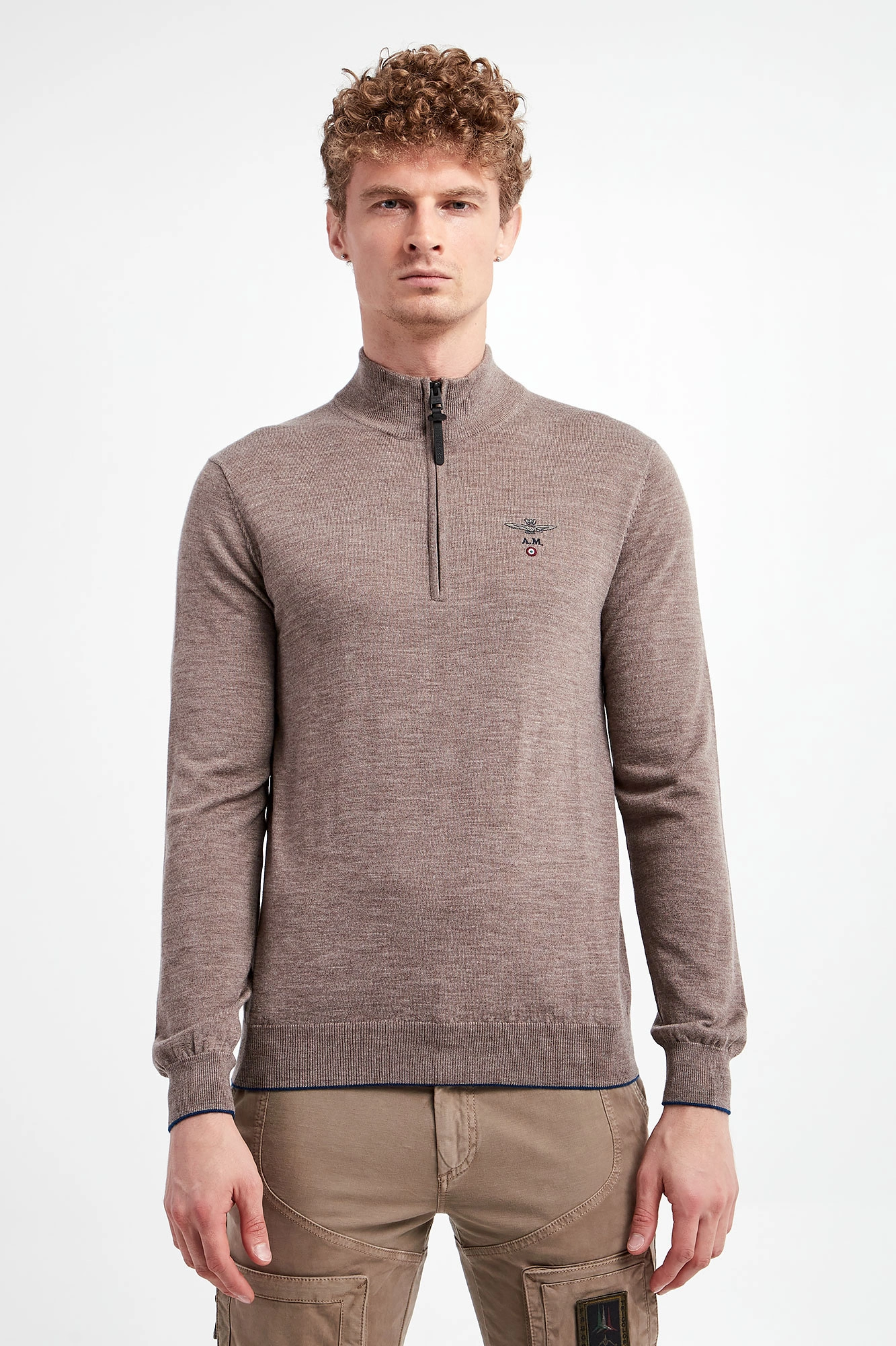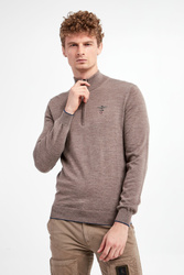 Wełniany sweter marki Aeronaitica Militare w beżowym kolorze. Ze stójką, zapinaną za pomocą zamka. Fason prosty. Z boku niewielki haft z logo i nazwą marki. Dekolt, rękawy i dół wykończone ściągaczem. Wykonany z miękkiej, wełnianej tkaniny. Rękawy i dół wykończone niebieskim lampasem.