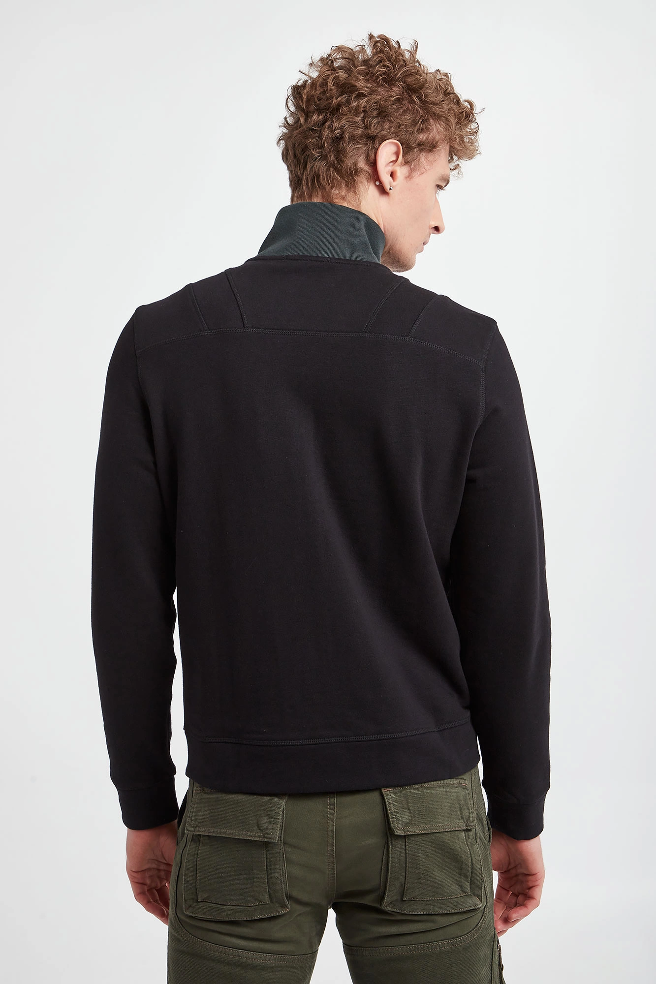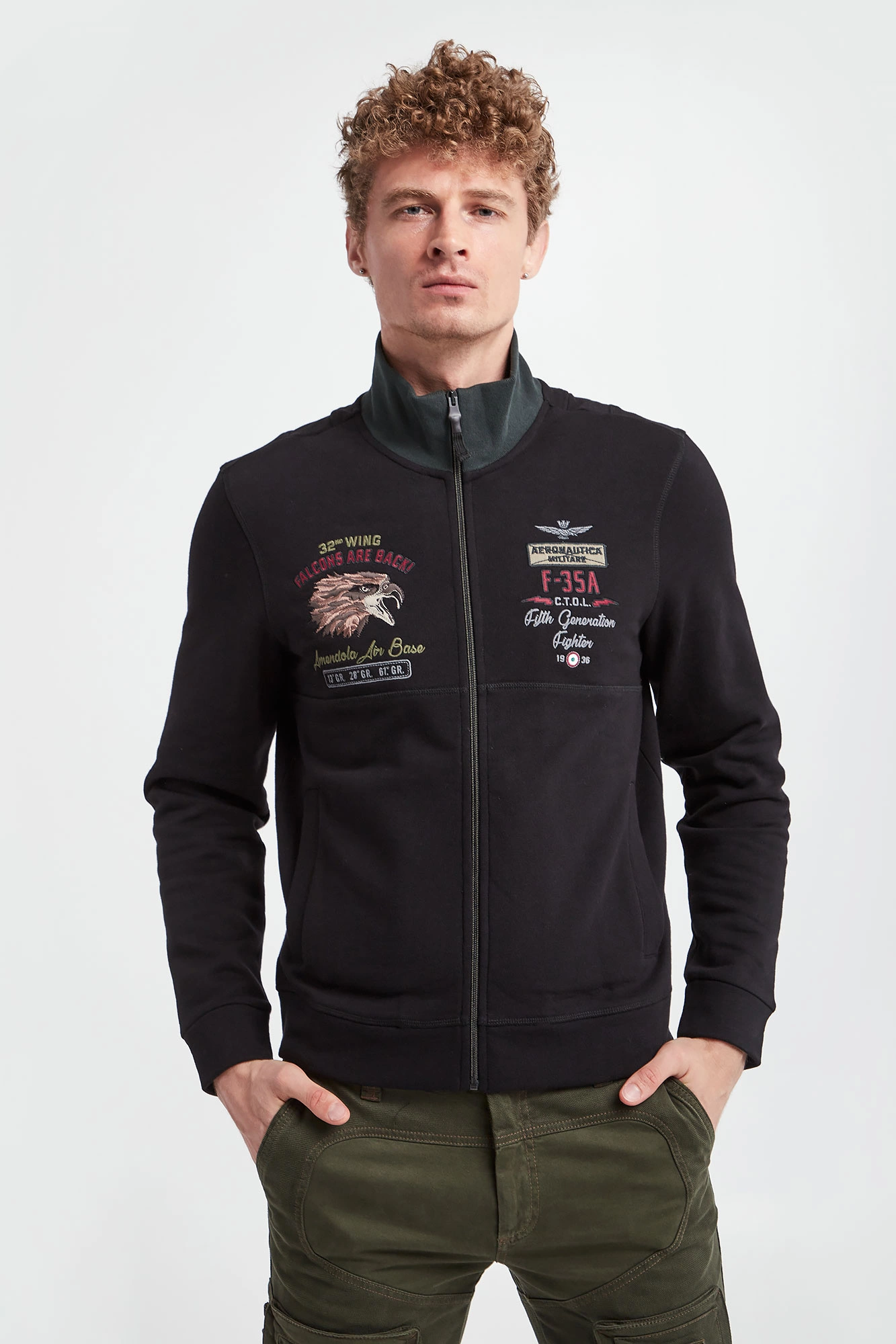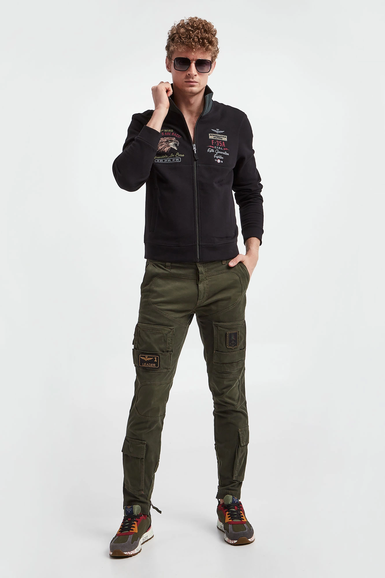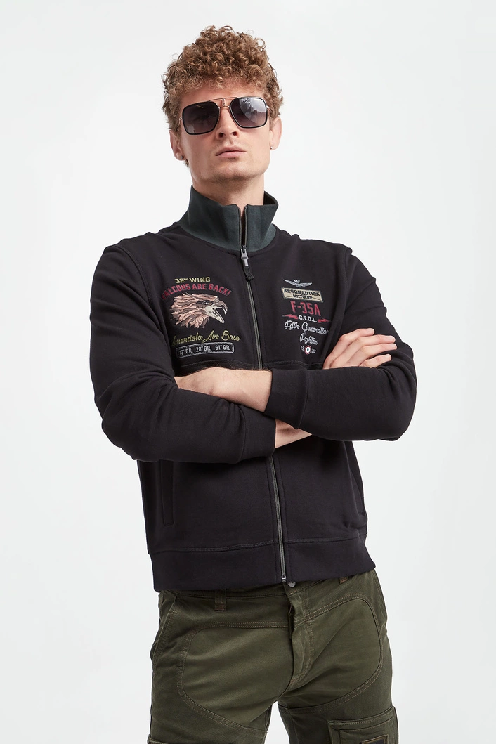 Bluza ze stójką marki Aeroanutica Militare w czarnym kolorze. Zapinana na zamek. Na froncie wielokolorowy haft w militarnym stylu, niżej dwie, wpuszczane kieszenie. Rękawy oraz dół wykończone ściągaczem. Bluza wykonana z czystej miękkiej bawełny. Fason regular. Bardzo komfortowa i przyjemna w dotyku.