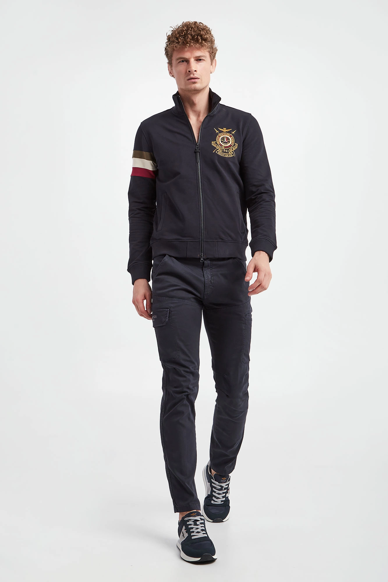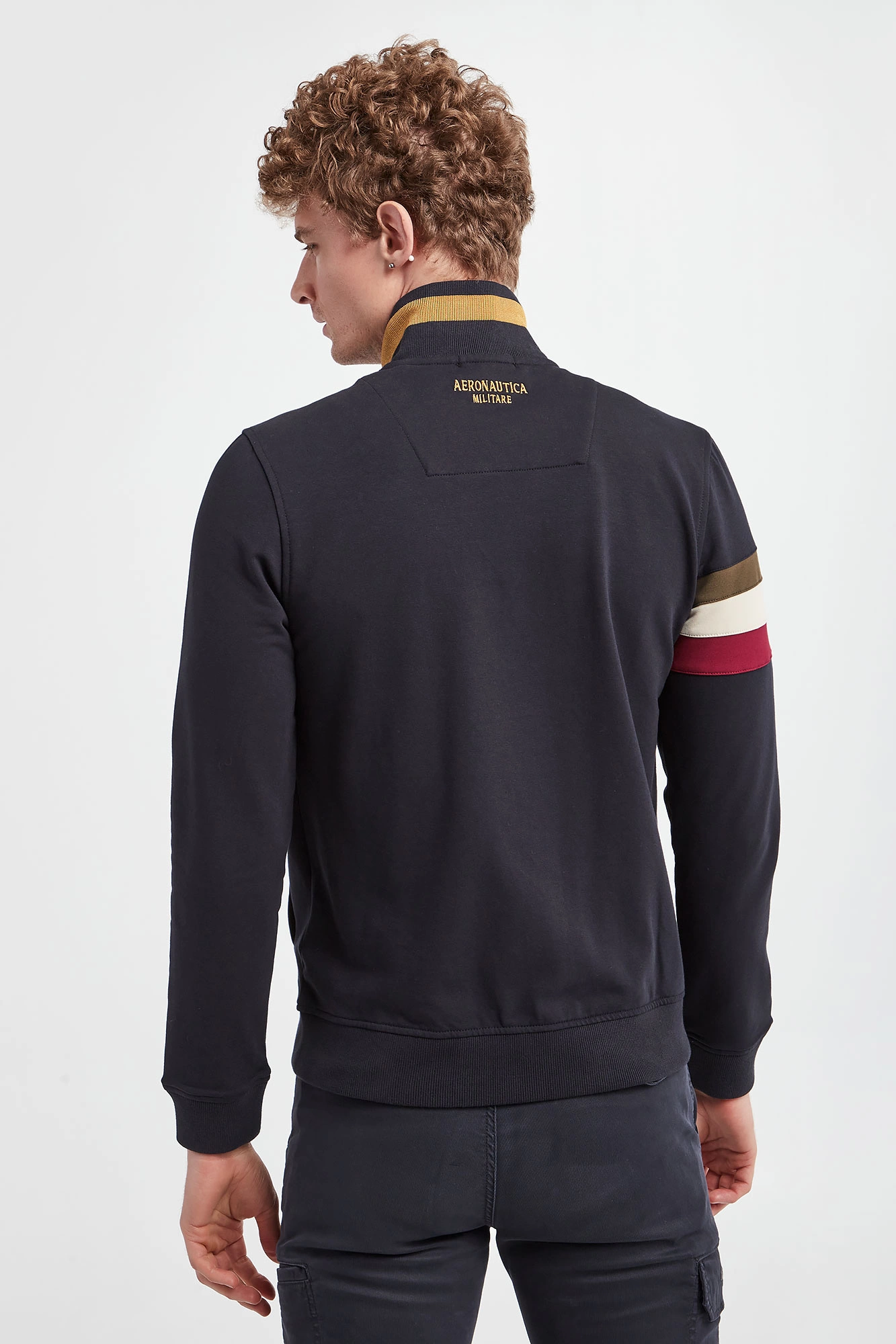 Bluza bawełniana marki Aeronautica Militare w granatowym kolorze. Stójka od wewnątrz zdobiona czerwono-bursztynowymi, haftowanymi napisami z bursztynowym lampasem. Zapinana za pomocą dwukierunkowego zamka. Z przodu haft z wojskowym motywem i logo marki. Na rękawie poziome pasy w kolorze khaki, kremowym i bordowym. Z tyłu niewielki bursztynowy haft z nazwą marki. Całość wykończona elastycznym ściągaczem. Długie rękawy zakończone granatową lamówką. Fason regular.