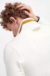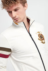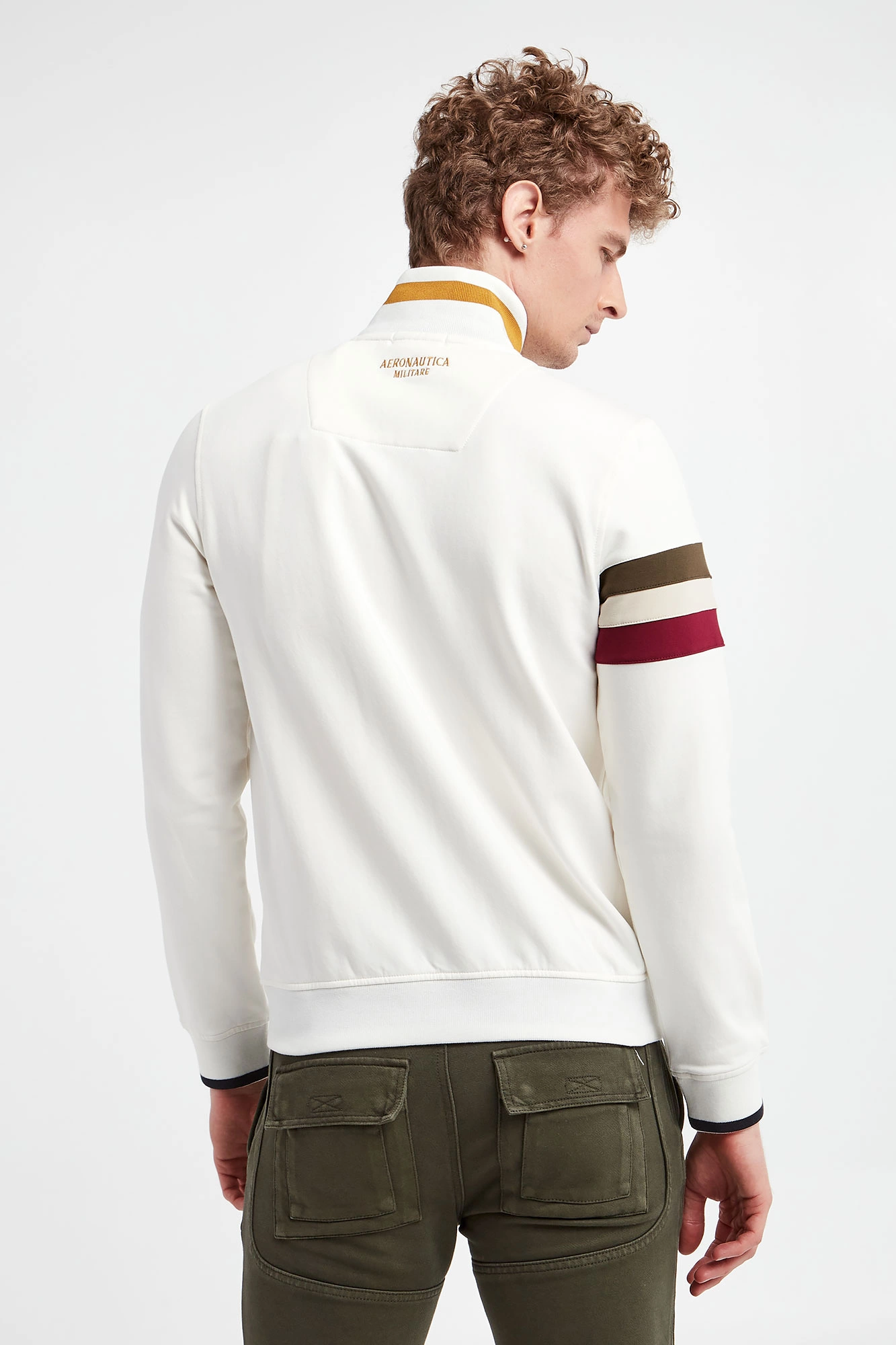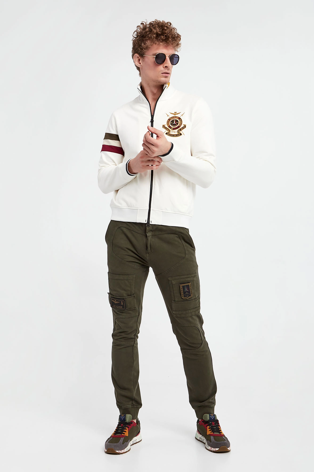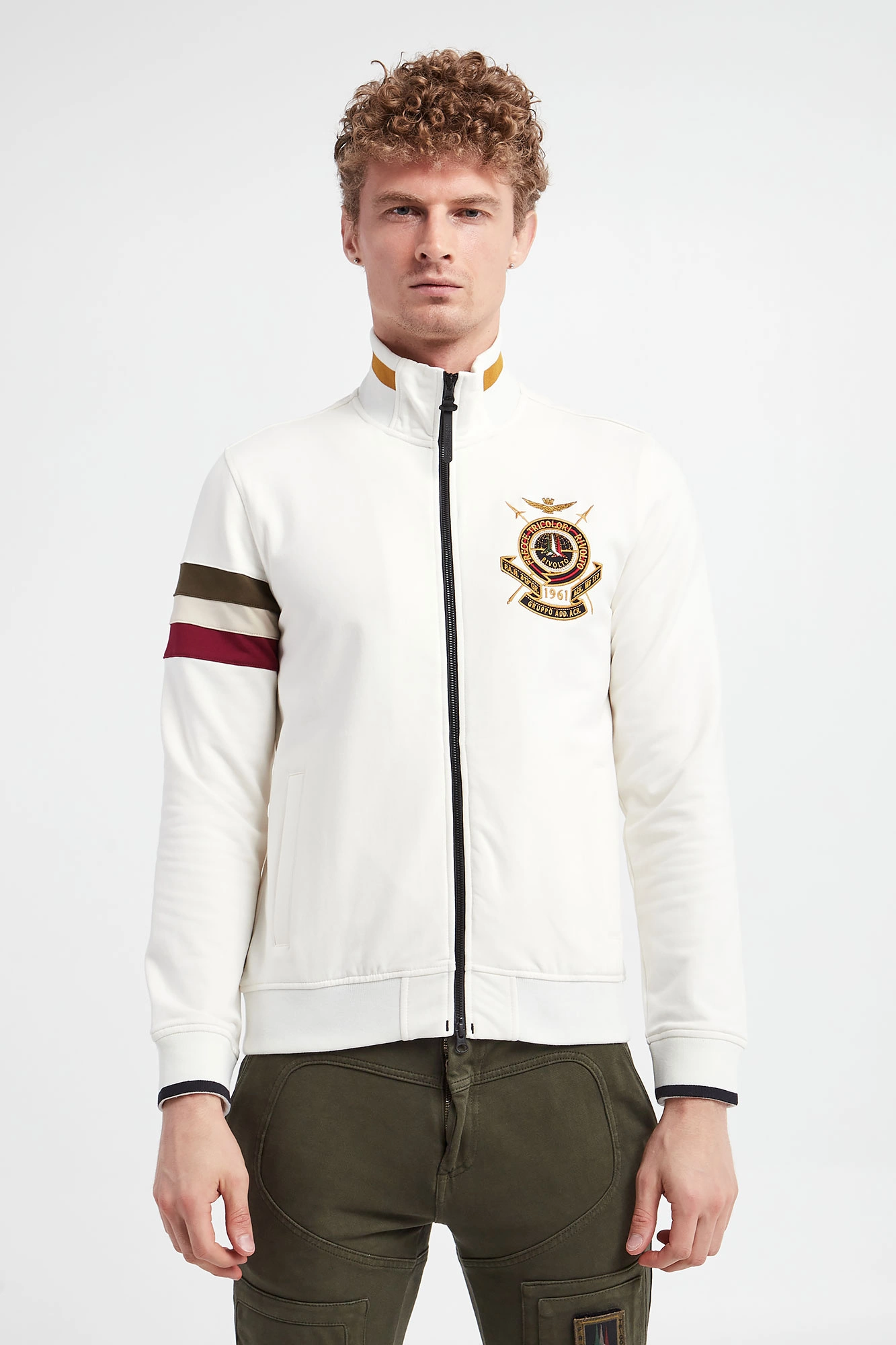 Bluza bawełniana marki Aeronautica Militare w kolorze ecru. Stójka od wewnątrz zdobiona czerwono-bursztynowymi, haftowanymi napisami z lampasem. Model z dwiema kieszeniami. Zapinana za pomocą dwukierunkowego zamka. Z przodu haft z wojskowym motywem i logo marki. Na rękawie poziome pasy w kolorze bordowym, kremowym i khaki. Całość wykończona elastycznym ściągaczem. Z tyłu niewielki bursztynowy haft z nazwą marki. Długie rękawy zakończone granatową lamówką. Fason regular.