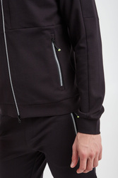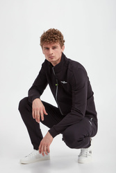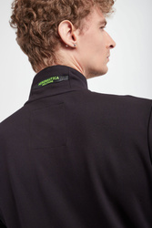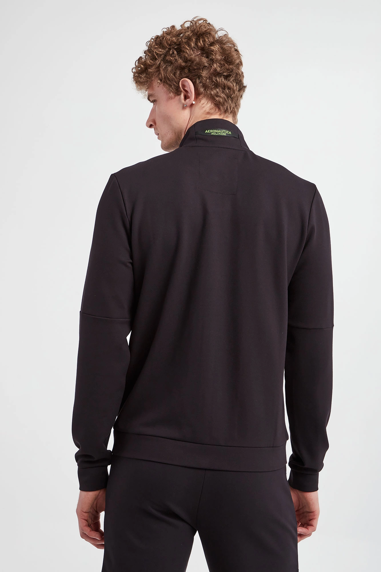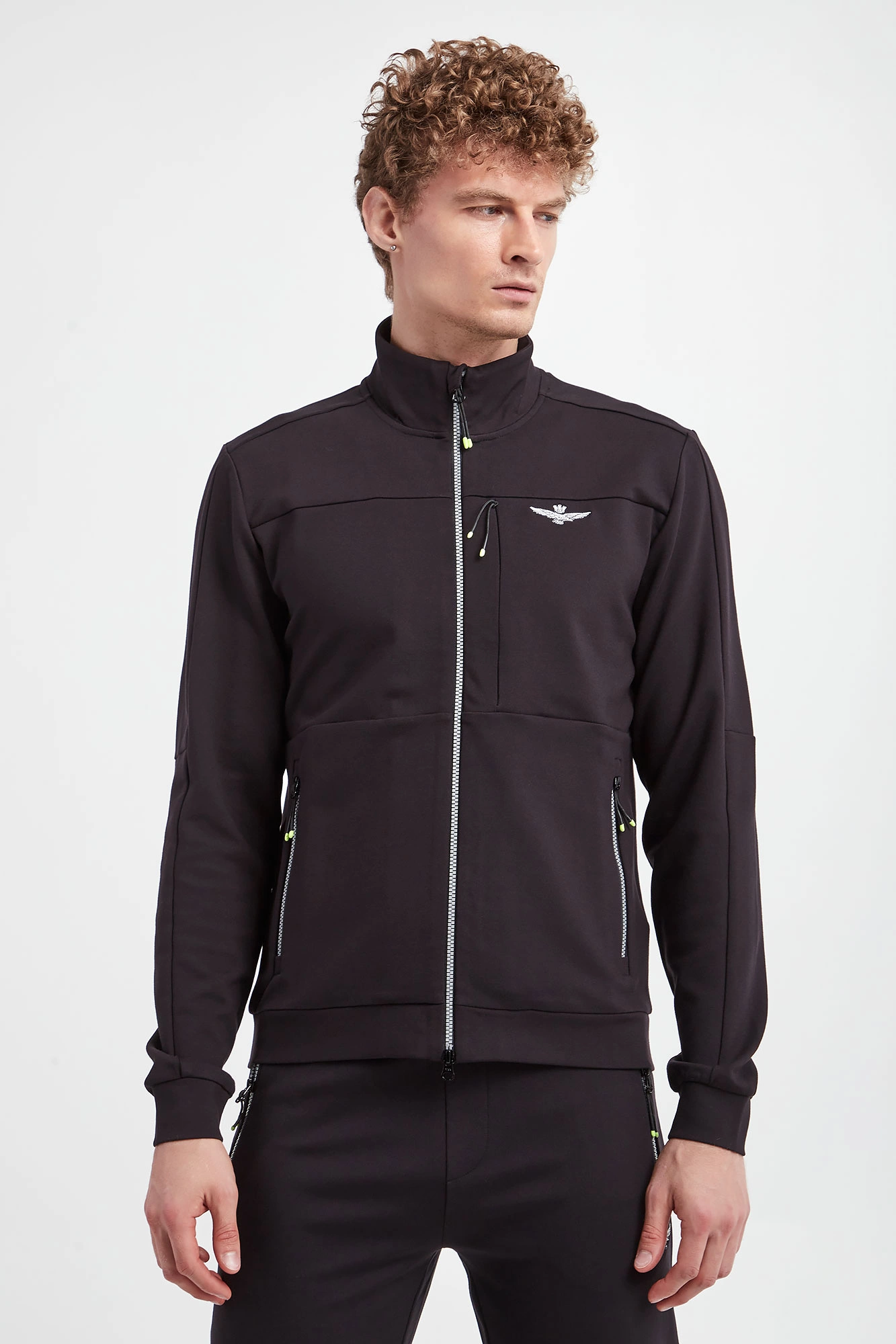 Bluza ze stójką marki Aeronautica Militare w czarnym kolorze. Przeszycia na całej bluzie. Fason typu regular fit. Zapinana ma dwukierunkowy zamek w szarym kolorze. Na froncie haftowany białe logo marki. Po bokach kieszenie zapinane na kontrastowy, szary zamek. Rękawy i dół wykończone gładkim ściągaczem. Model wykonany z niegniotącej, wytrzymałej i wygodnej mieszanki materiałów.