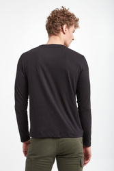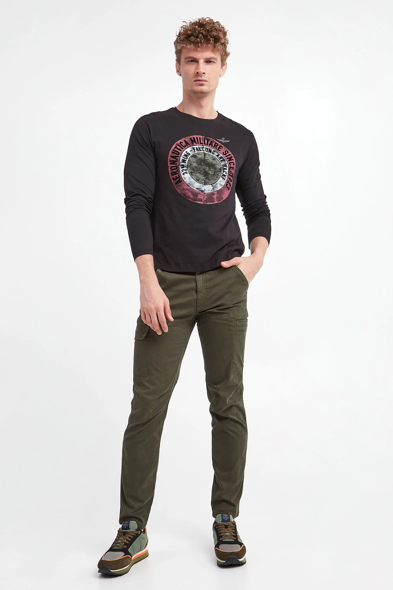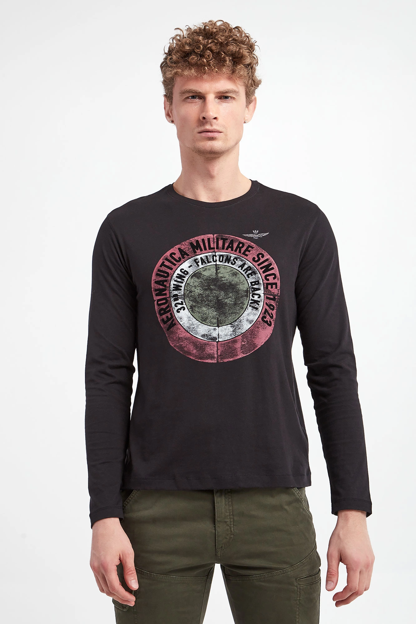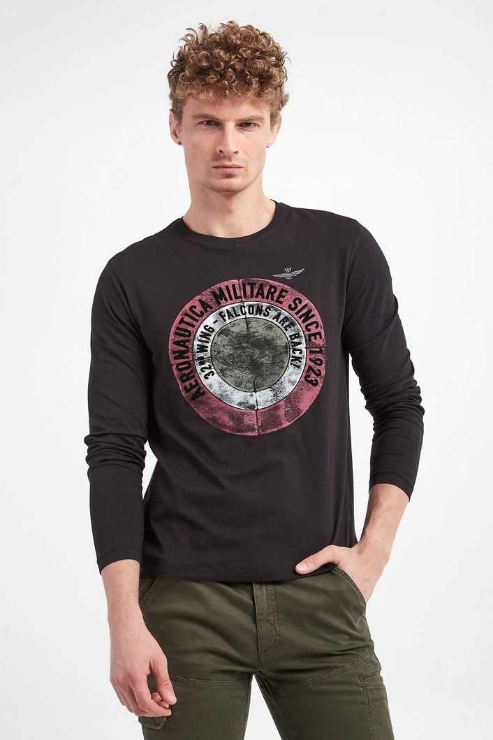 Longsleeve marki Aeronautica Militare w czarnym kolorze. Z przodu duży wielokolorowy nadruk z motywem militarnym oraz haft logo marki. Długie rękawy i dekolt o-neck wykończone przeszyciami. Fason typu regular. Wykonany ze stuprocentowej bawełny.