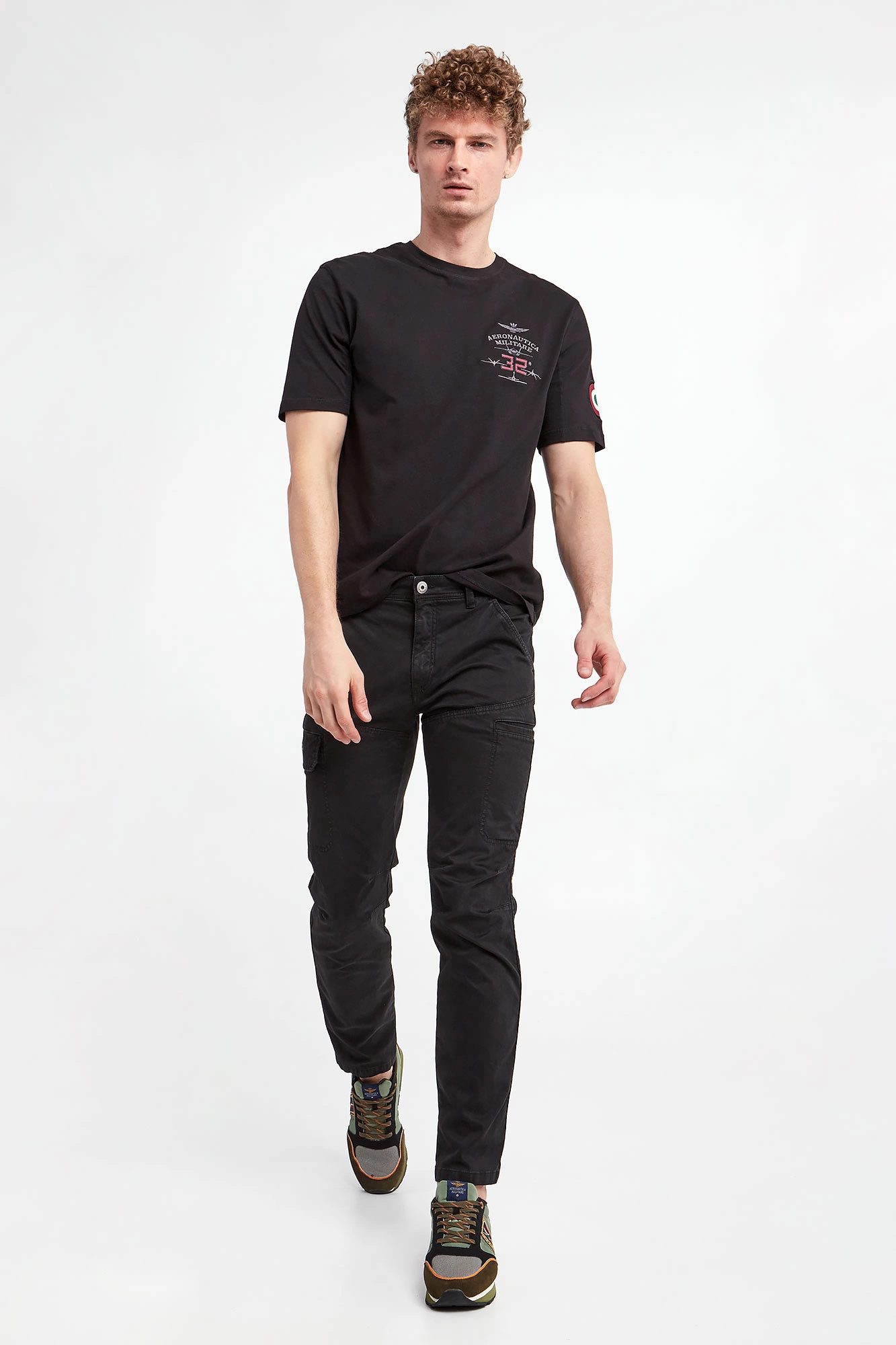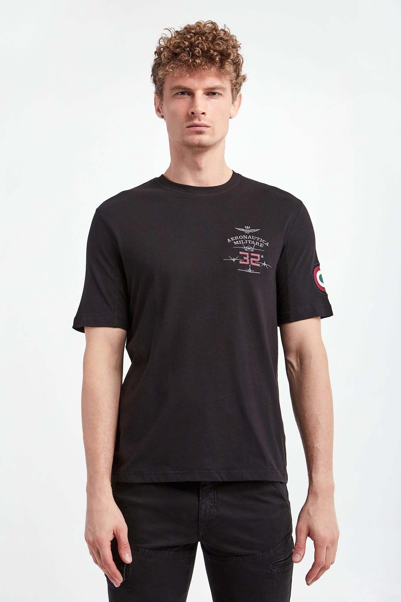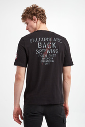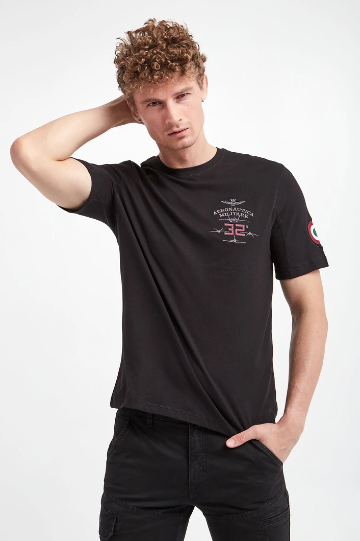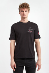 T-shirt bawełniany marki Aeronautica Militare w czarnym kolorze. Fason regular. Wykonany z czystej, miękkiej bawełny. Krótkie rękawy, dekolt o-neck i dół wykończone ozdobnymi przeszyciami. Na piersi i rękawie naszywka z logo i nazwą marki.