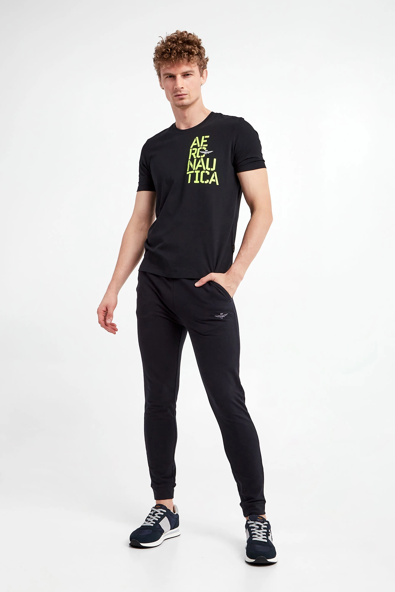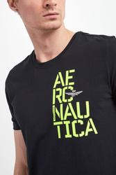 T-shirt bawełniany marki Aeronautica Militare w czarnym kolorze. Na przodzie nadrukowane, neonowe żółte napisy oraz subtelny haft z logo marki. Dekolt typu o-neck wykończony ściągaczem. Na boku logowana naszywka. Krótkie rękawy i dół wykończone przeszyciem. Na tyle widoczna metka z fluorescencyjnym nadrukiem nazwy marki. Fason typu slim.