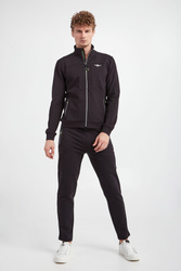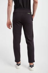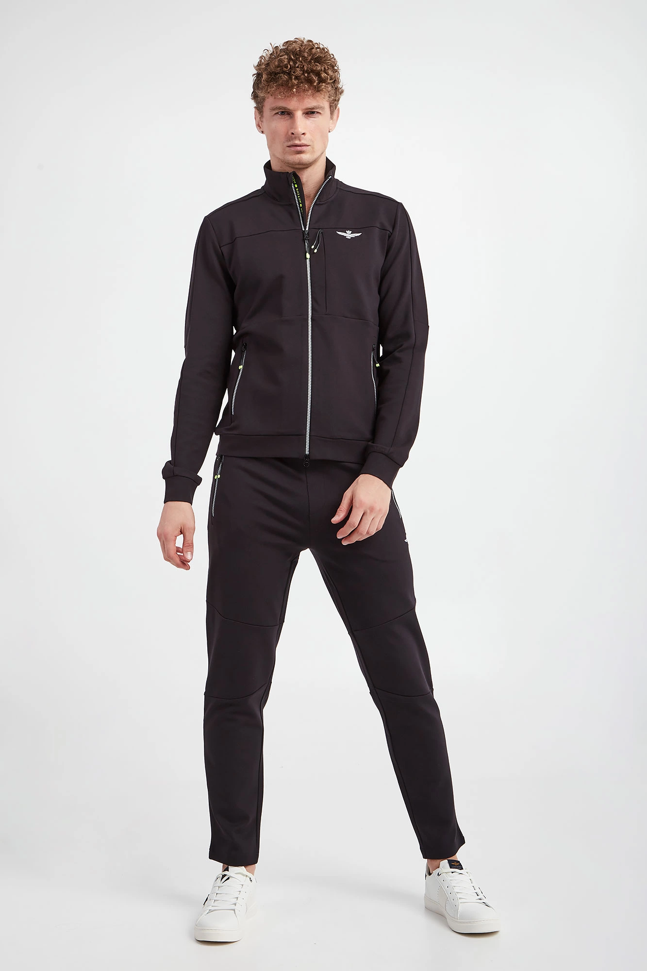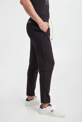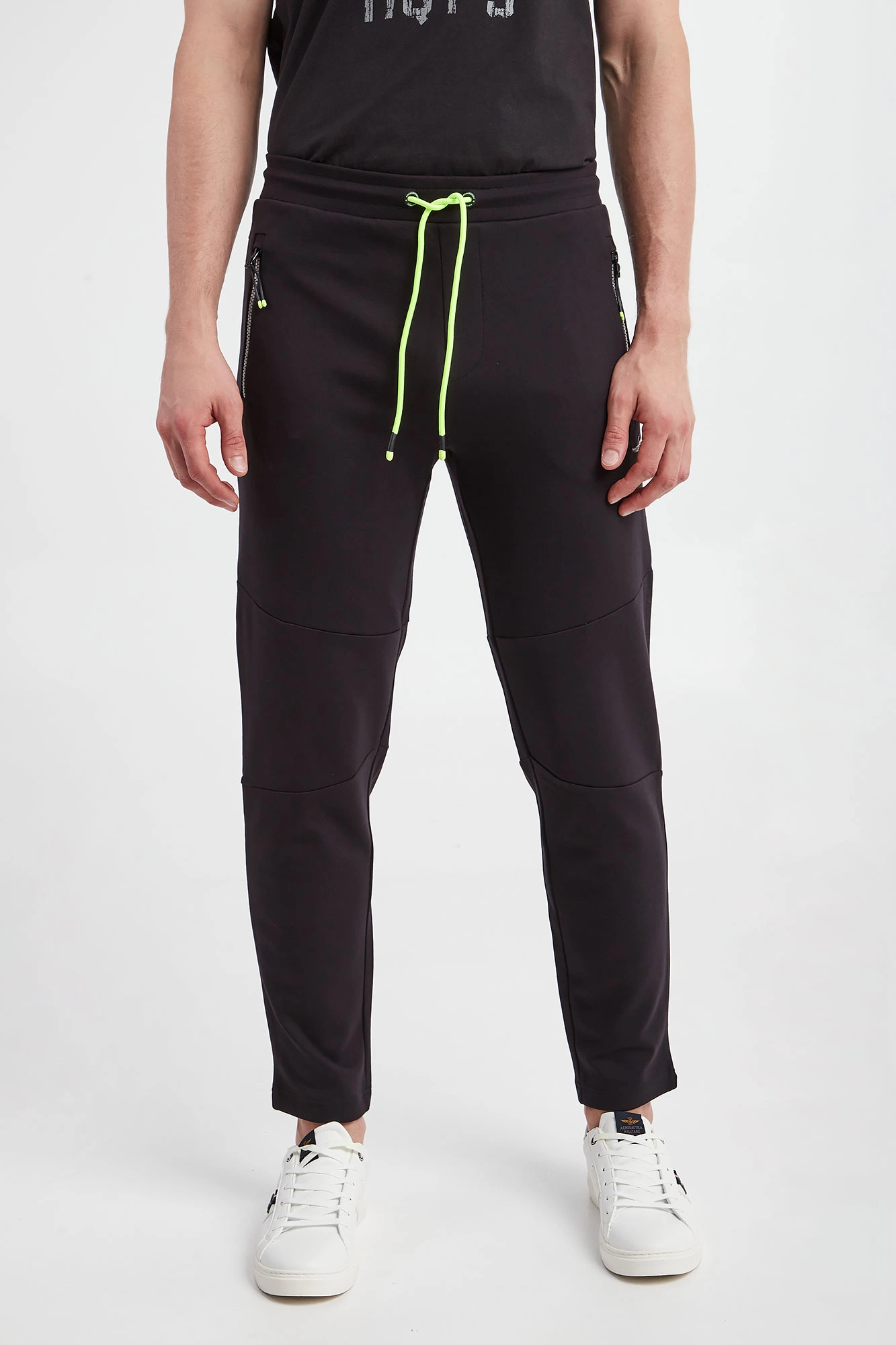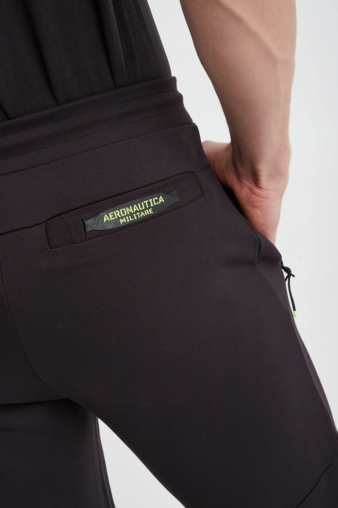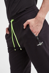Spodnie dresowe marki Aeronautica Militare w czarnym kolorze. Na froncie nieduży, jasny haft w postaci logo marki. Nogawki z ozdobnymi przeszyciami przy kolanach. Model z dwoma kieszeniami na suwak z neonowym akcentem. Pas ze ściągaczem i kontrastowymi neonowymi troczkami do regulacji. Z tyłu imitacja kieszeni. Wykonane z tkaniny wiskozowej. Fason typu regular.
