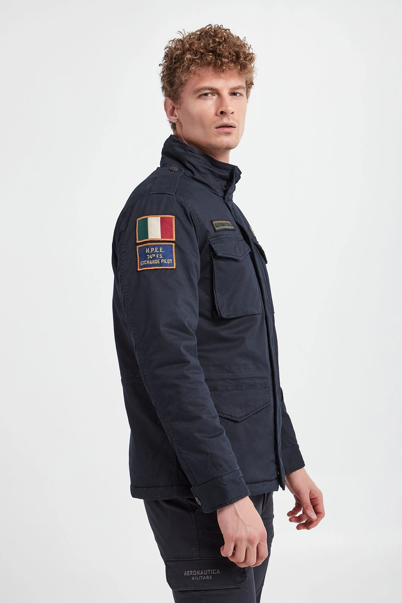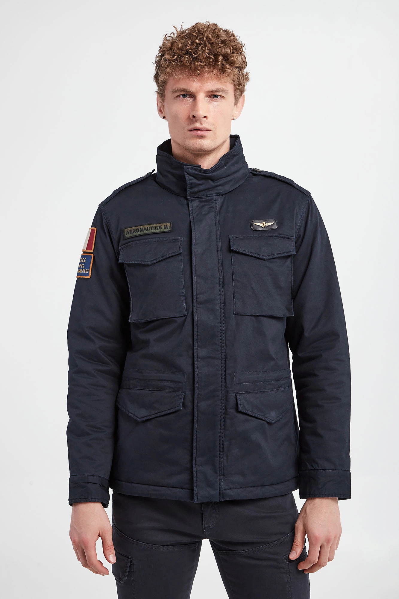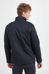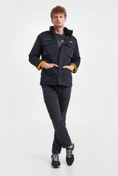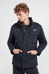 Kurtka marki Aeronautica Militare w kolorze granatowym. Zapinana za pomocą krytego zamka oraz nap. Na piersi naszywki z logo i nazwą marki. Cztery boczne, zamykane kieszenie. Na rękawie haftowane naszywki. W talii ściągacz. Na ramionach pagony. Rękawy zakończone zapinanymi mankietami. Wewnątrz pikowana. Fason typu regular. Wykonana z bawełnianej tkaniny z domieszką elastanu.