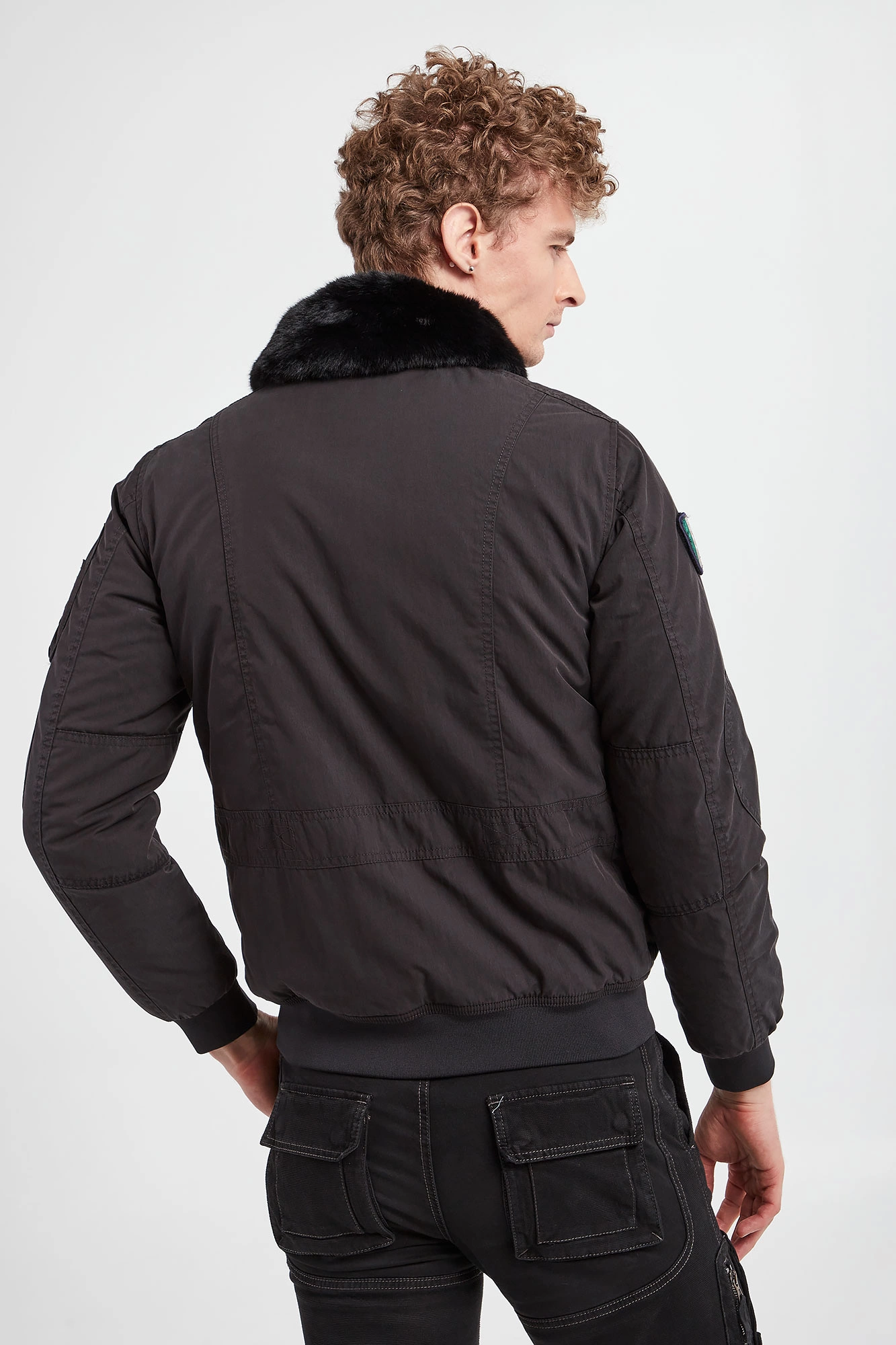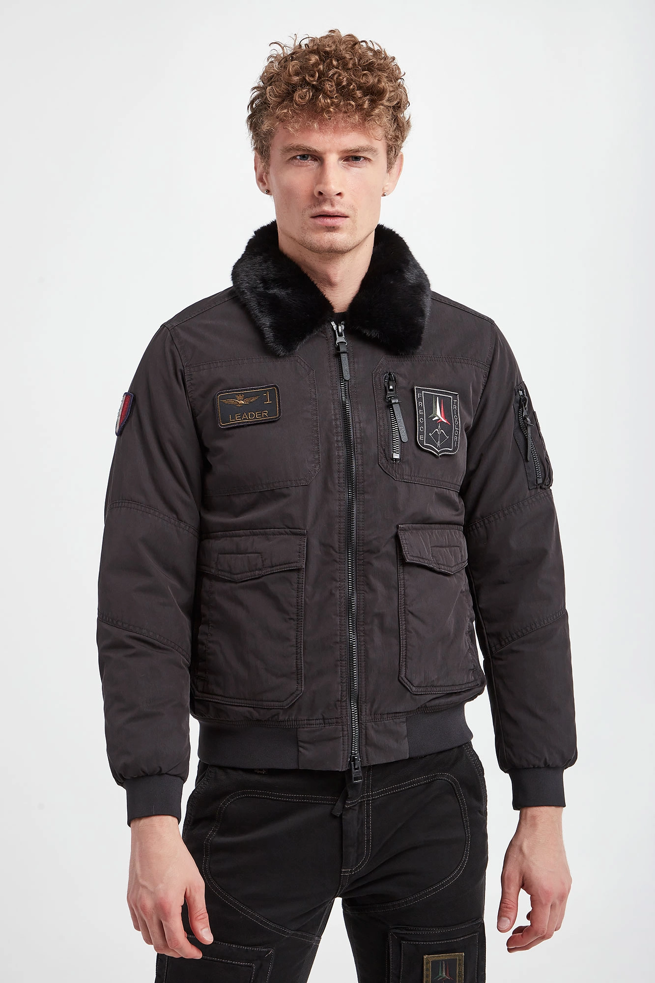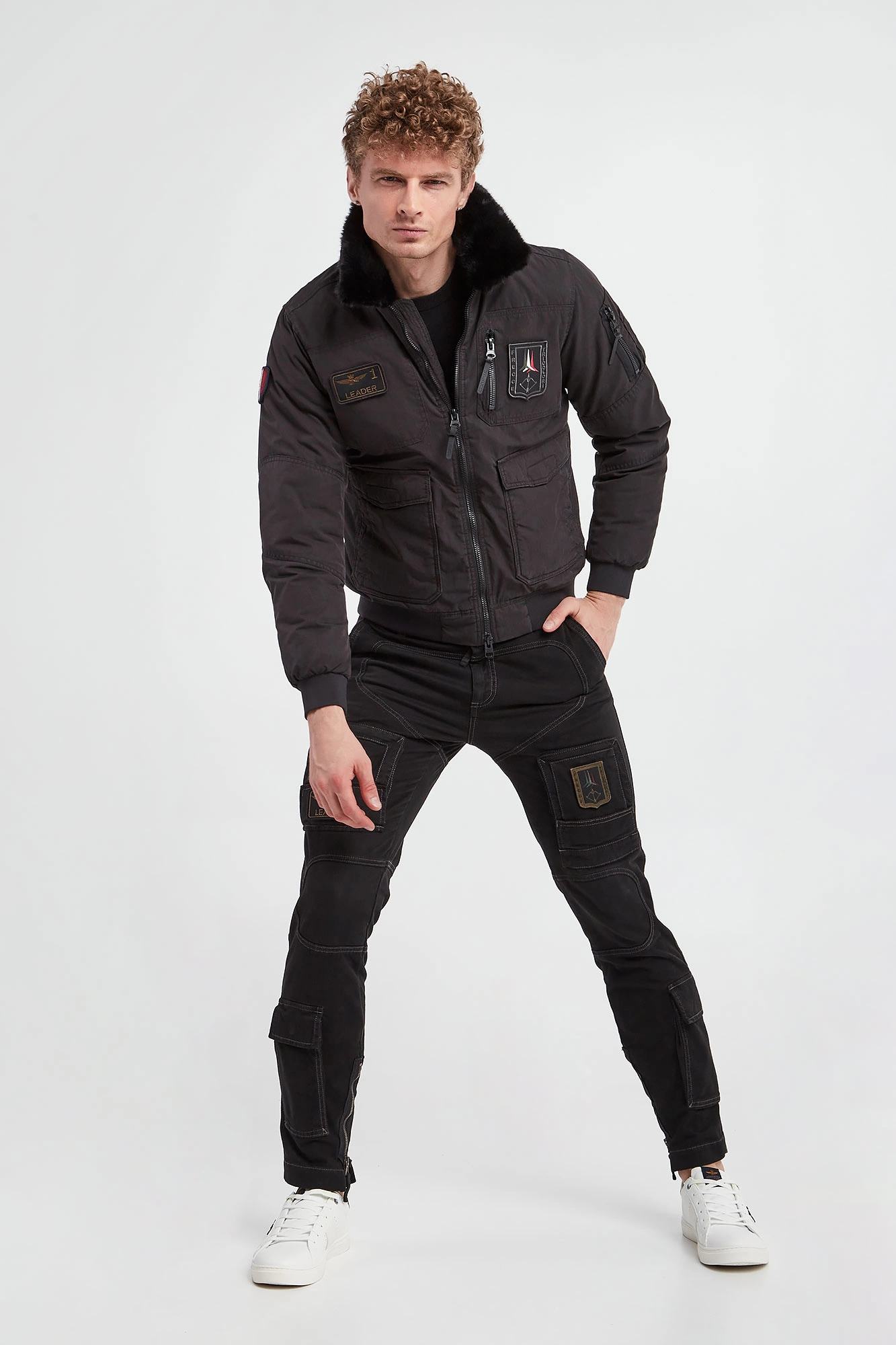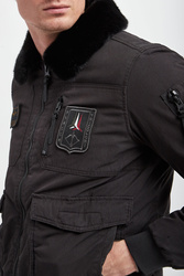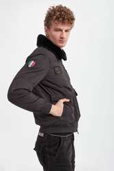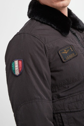Kurtka marki Aeronautica Militare w czarnym kolorze. Zapinana za pomocą dwustronnego zamka. Przy kołnierzu odpinane czarne futerko. Na froncie hafty z logo w militarnym stylu. Trzy boczne kieszenie i jedna na rękawie. Rękawy i dół zakończone prążkowanymi ściągaczami. Fason typu regular.