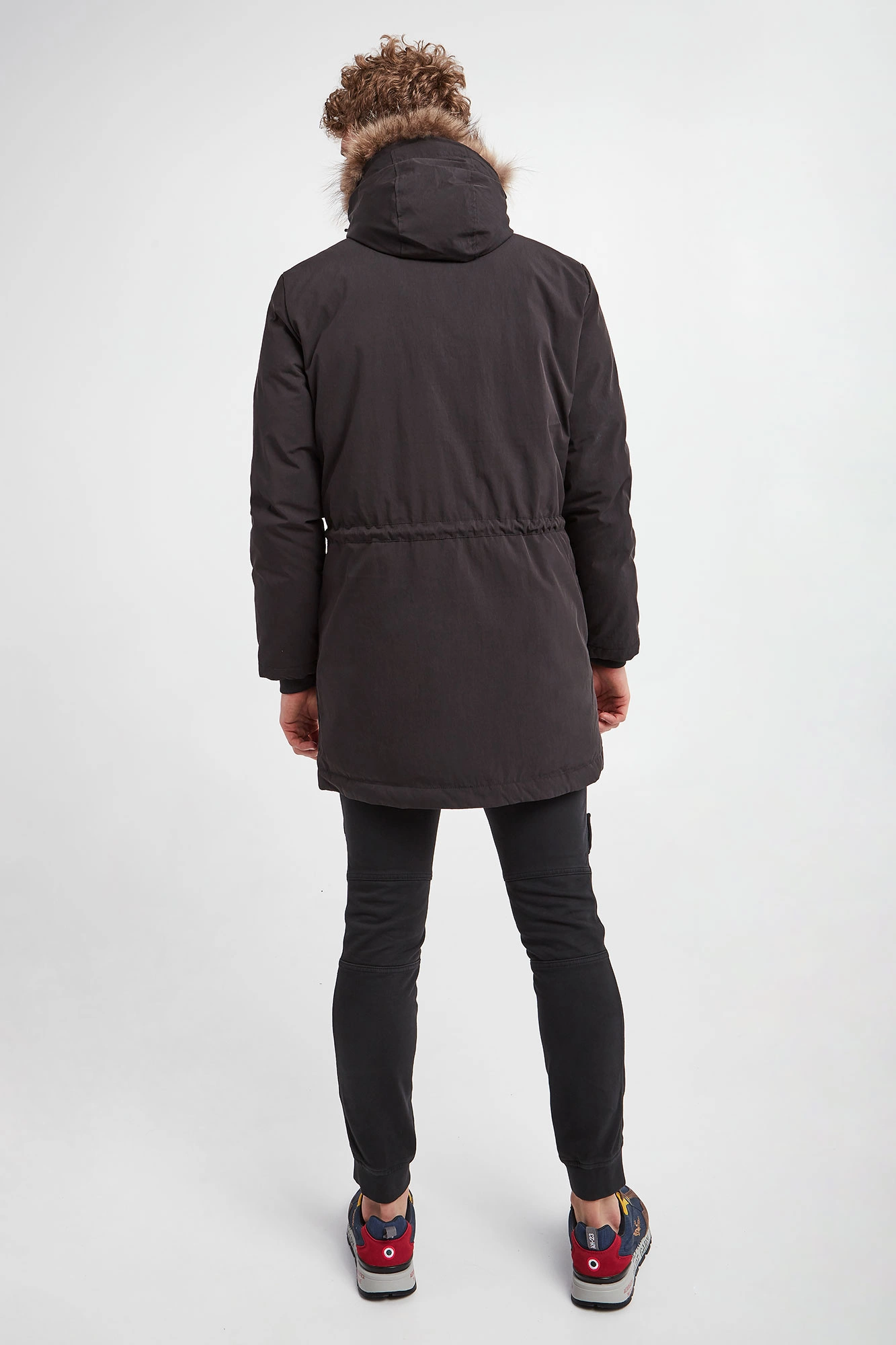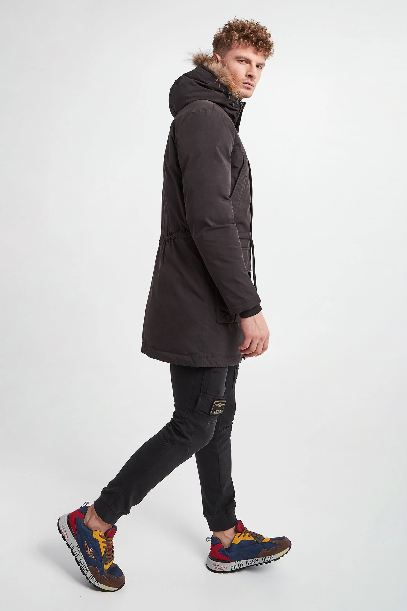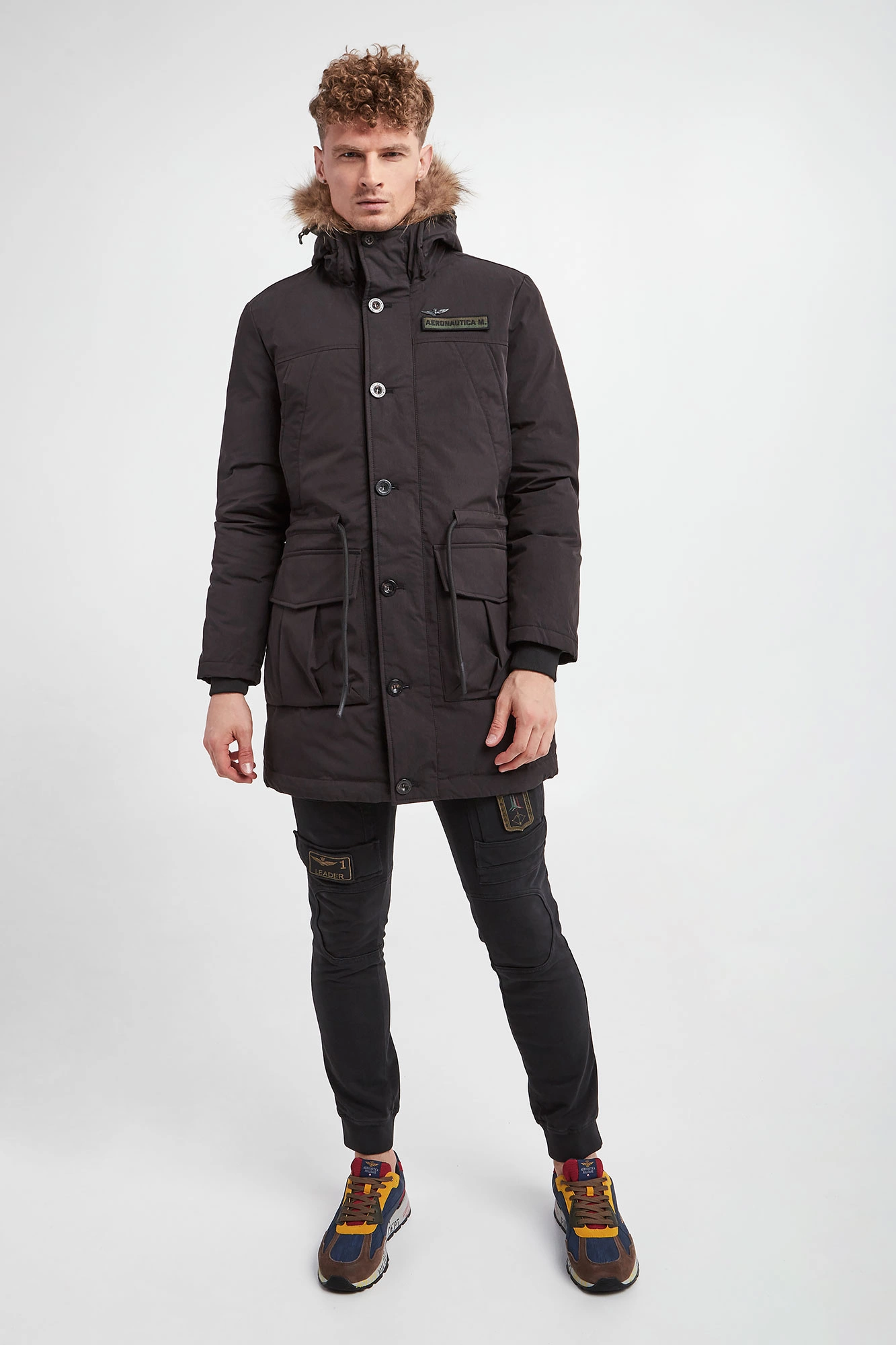 Kurtka parka marki Aeronautica Militare w czarnym kolorze. Z kapturem. Zapinana za pomocą sygnowanych guzików. Na piersi haft z nazwa marki i zawieszka z logo. Model z czterema zamykanymi kieszeniami. Rękawy zakończone ściągaczami. W talii troczki. Przy kapturze odpinane futerko. Fason regular.