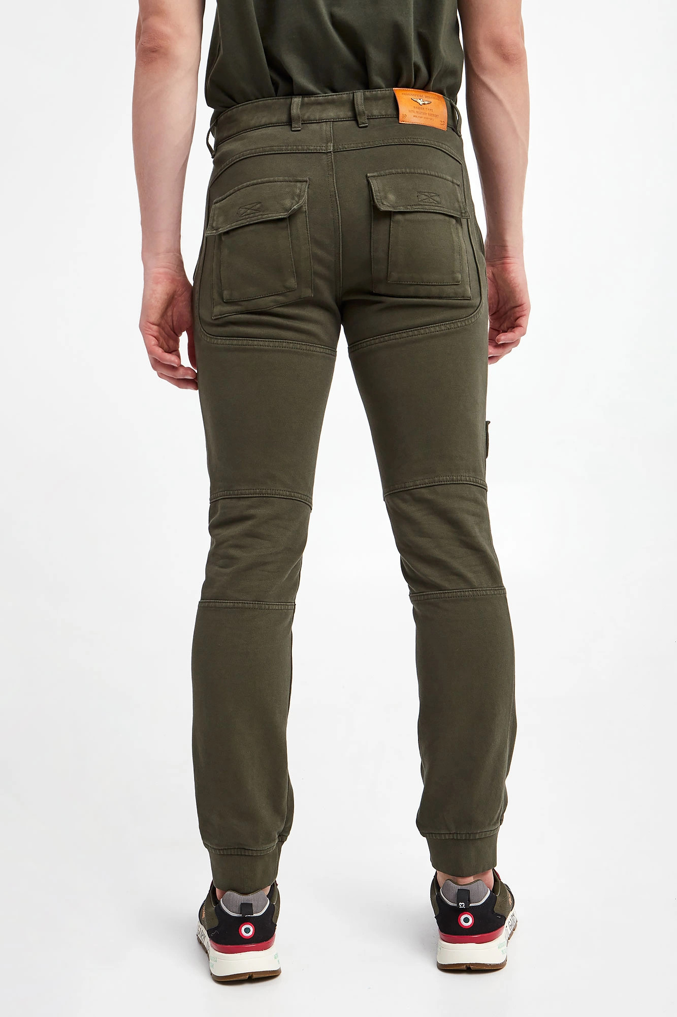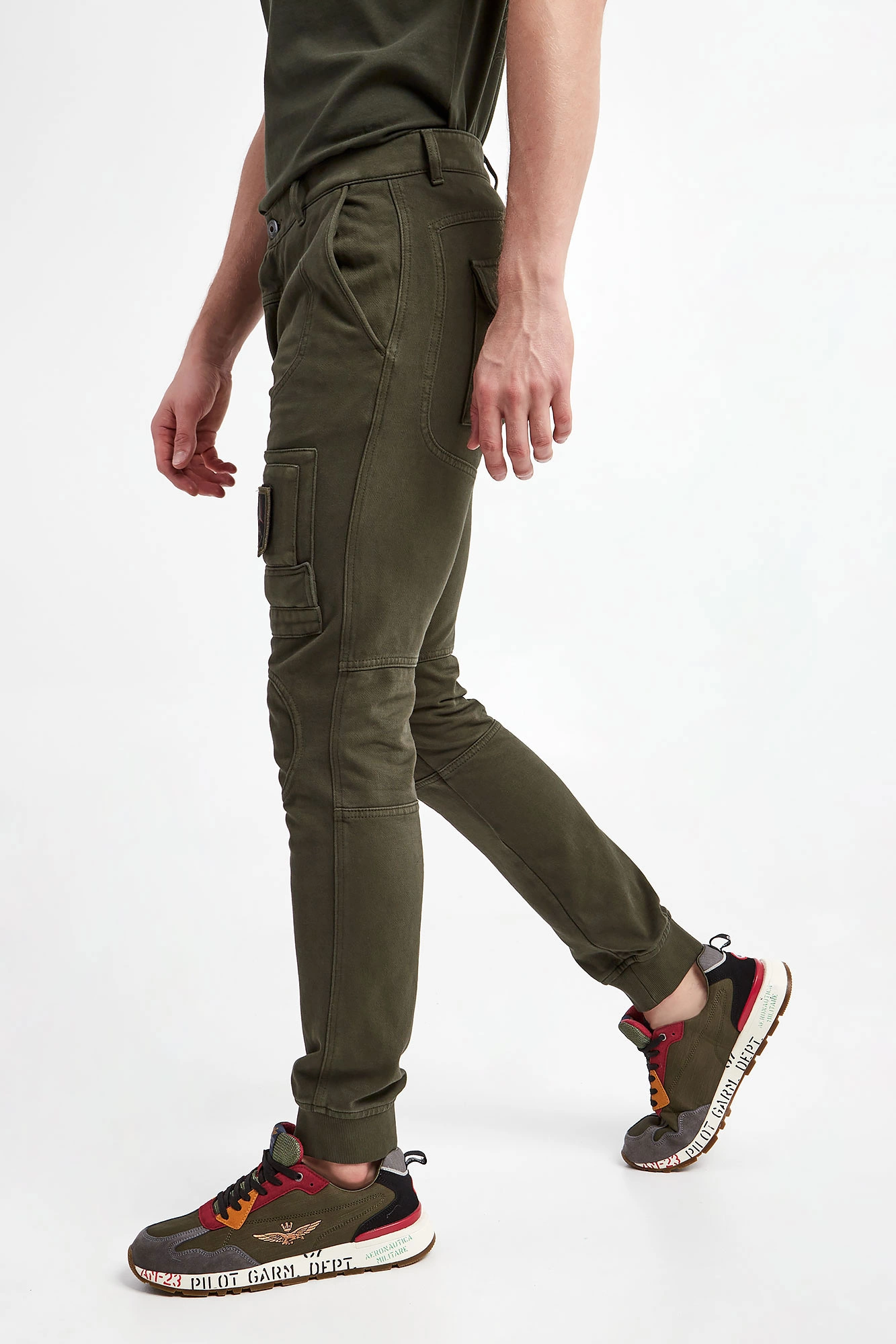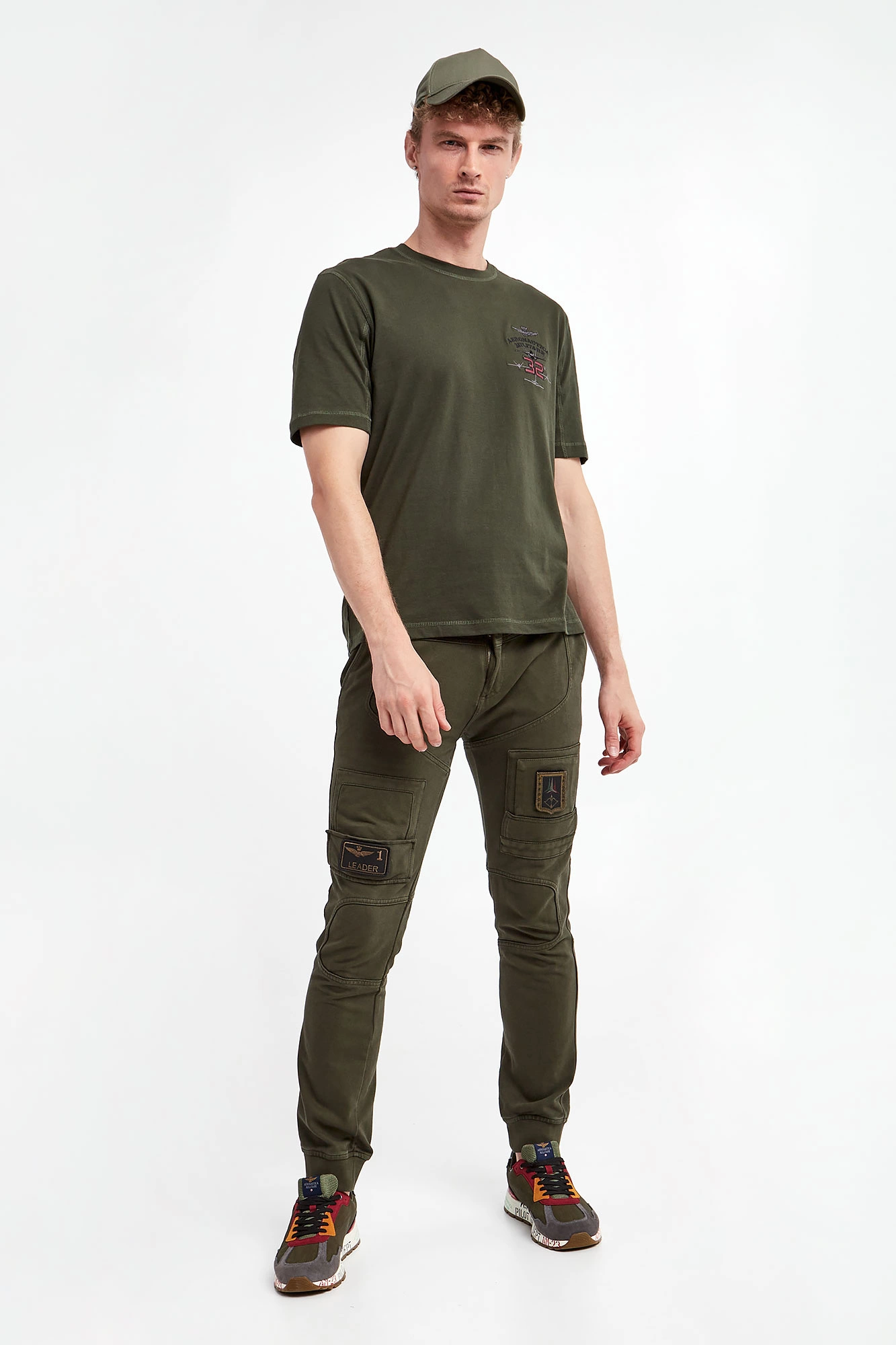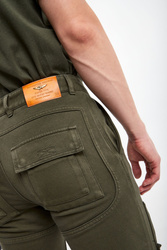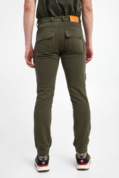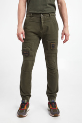 Spodnie marki Aeronautica Militare w kolorze khaki. Zapinane na zamek i guzik. Model z wieloma kieszeniami. Na nogawkach ściągane naszywki przymocowane na rzep. U dołu nogawki na ściągacz. Na całości stylowe przeszycia. Fason regular. Wykonane z czystej bawełny. Spodnie utrzymane w estetyce wojskowej.