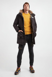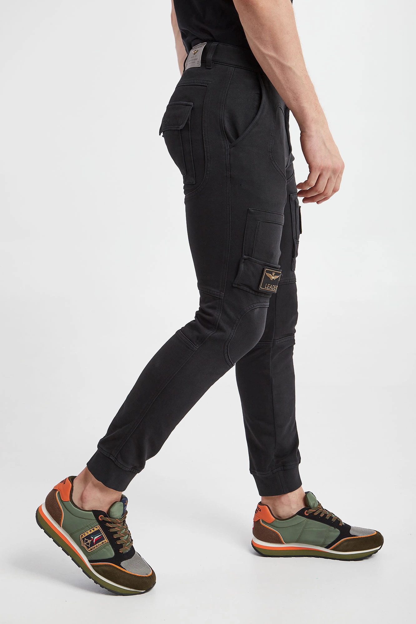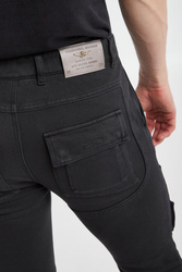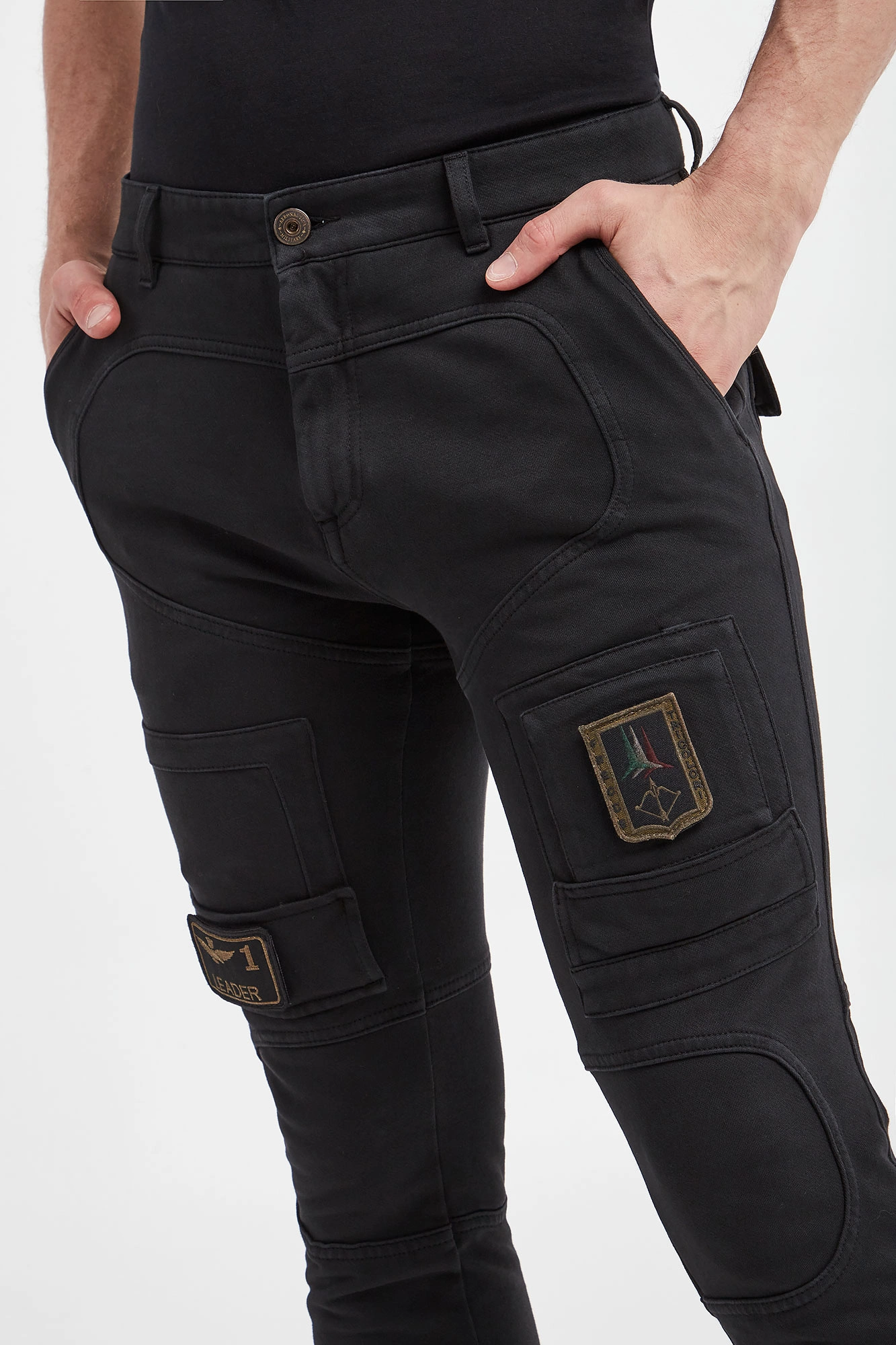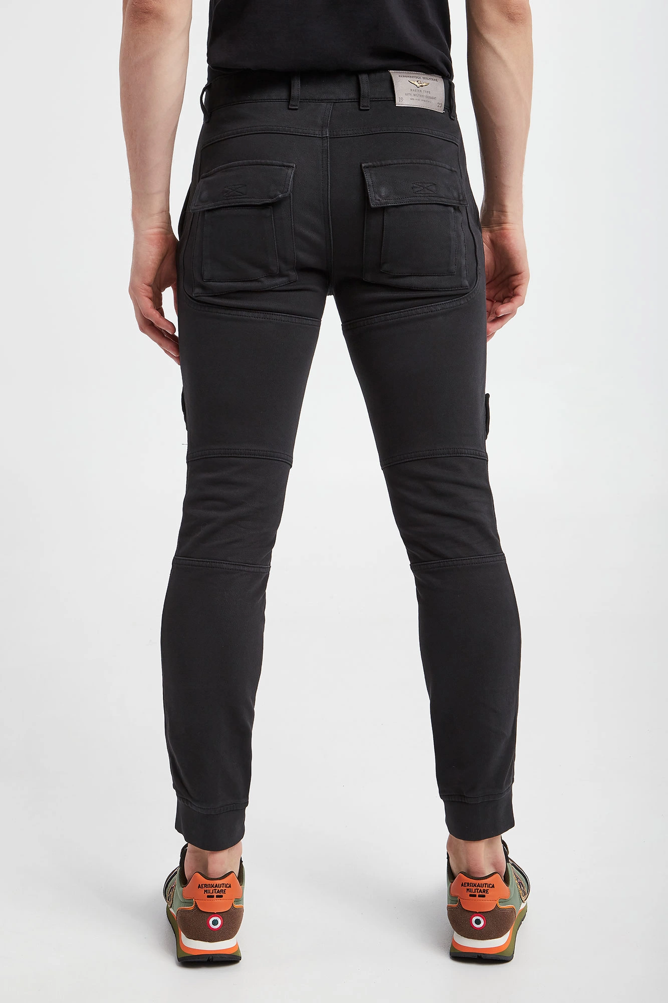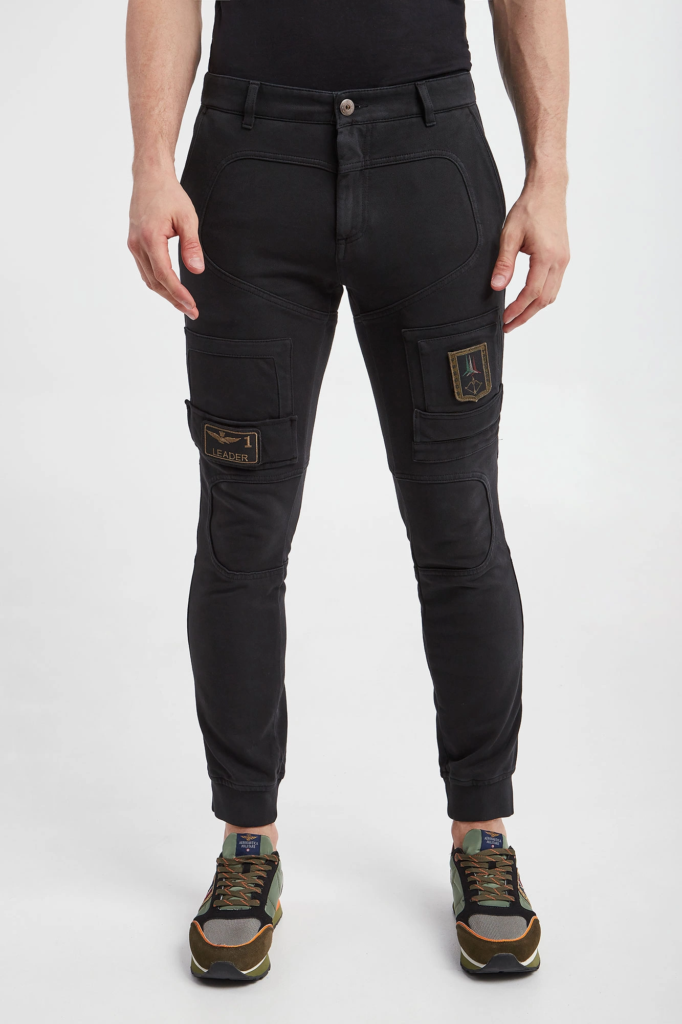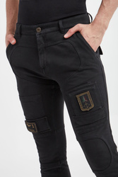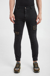 Spodnie marki Aeronautica Militare w czarnym kolorze. Zapinane na zamek i guzik. Model z wieloma kieszeniami. Na nogawkach ściągane naszywki przymocowane na rzep. U dołu nogawki na ściągacz. Na całości stylowe przeszycia. Fason regular. Wykonane z czystej bawełny. Spodnie utrzymane w estetyce wojskowej.