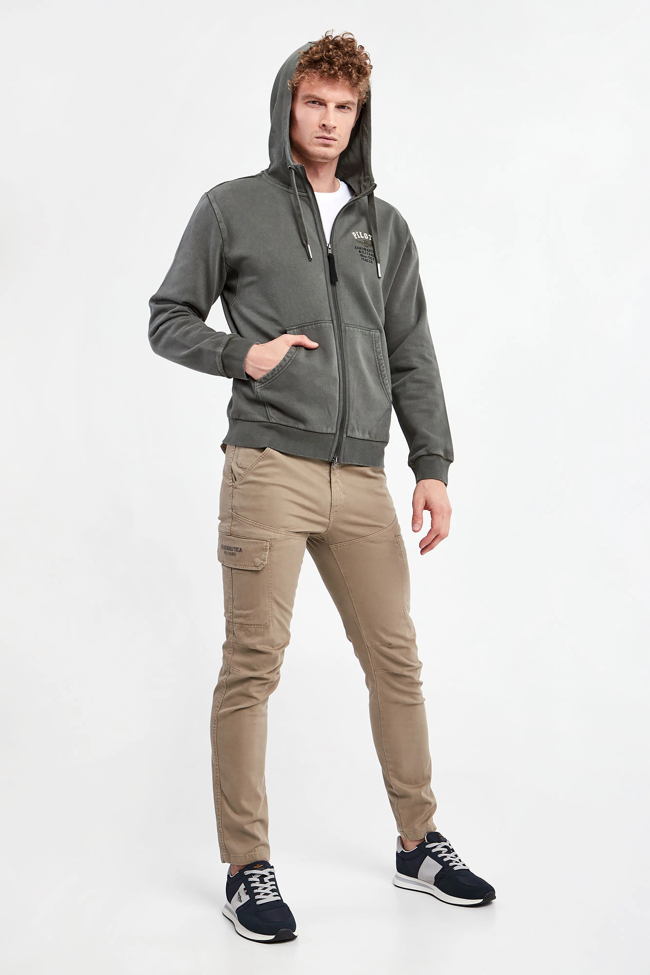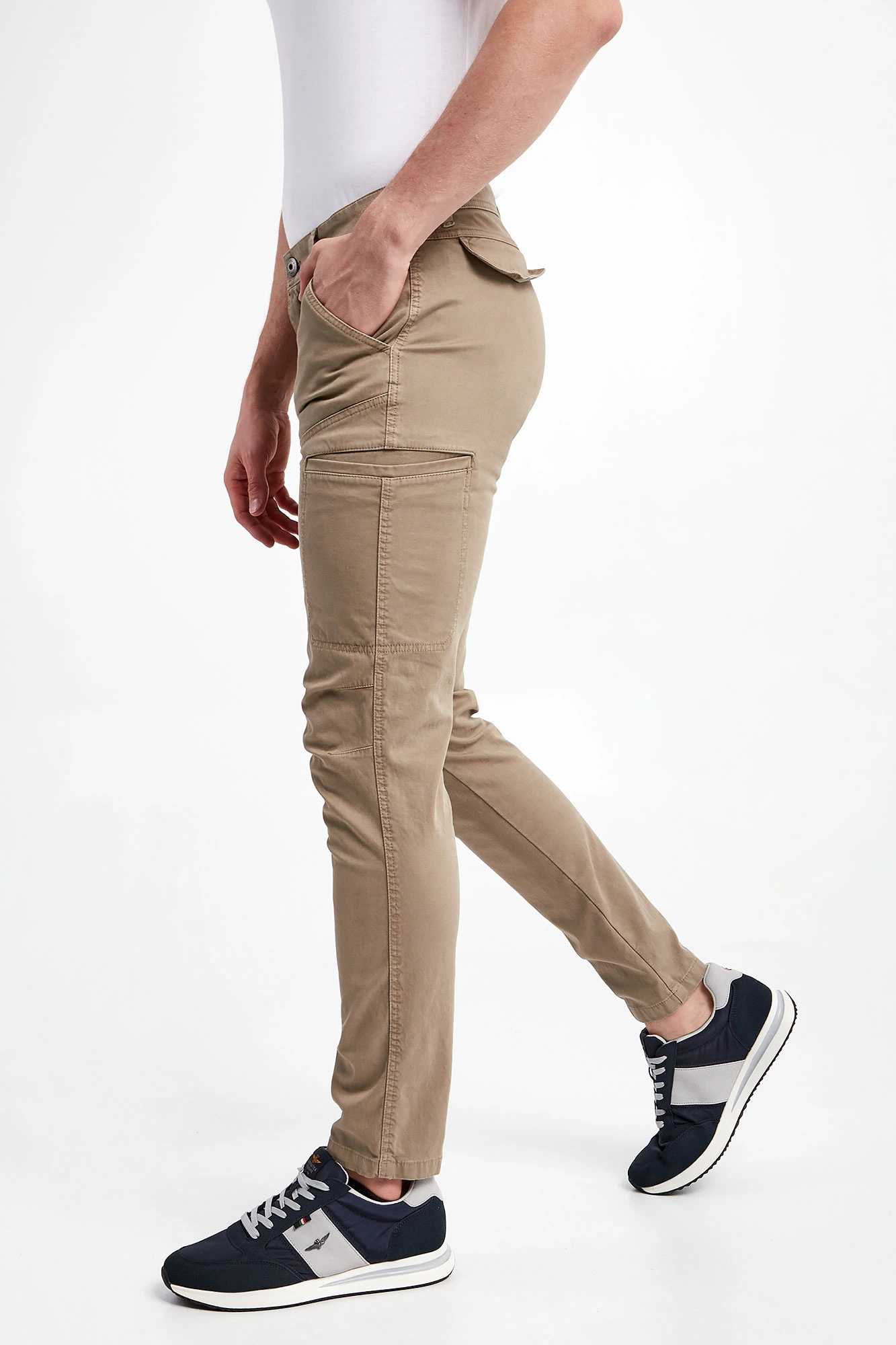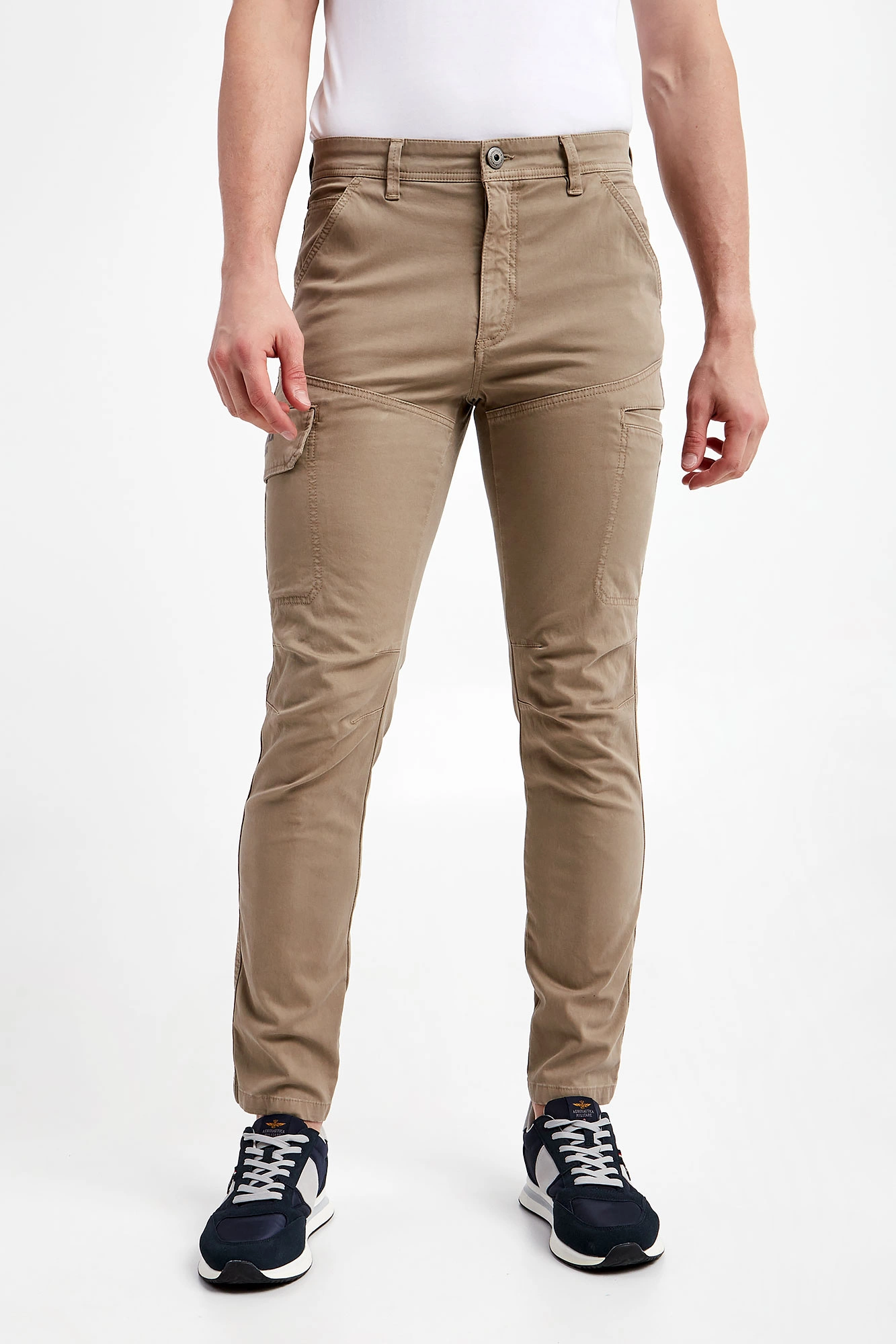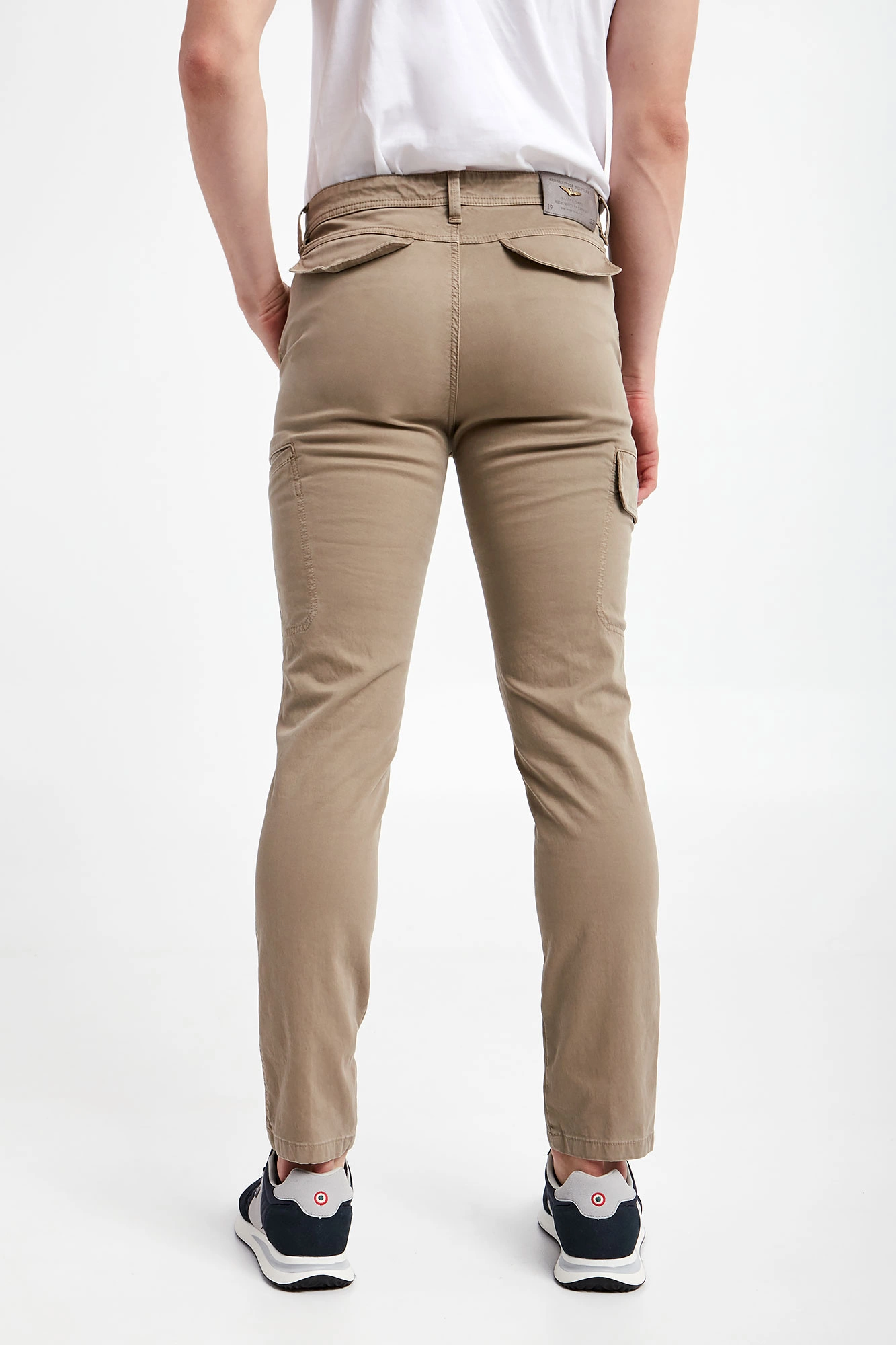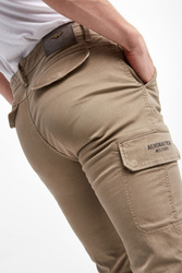 Beżowe spodnie marki Aeronautica Militare. Na całości stylowe przeszycia. Zapinane na zamek i guzik. Model z dwoma kieszeniami na nogawkach. Wykonane z mieszkanki bawełny z elastanem. Spodnie utrzymane w estetyce wojskowej.