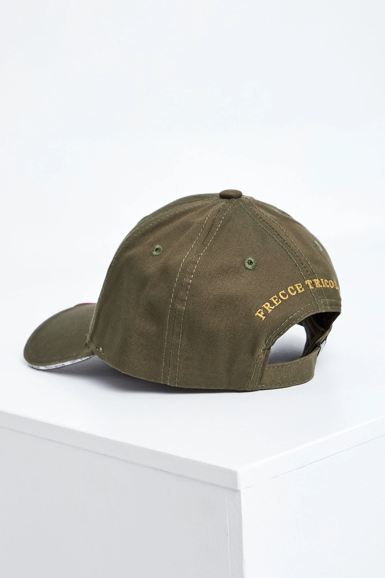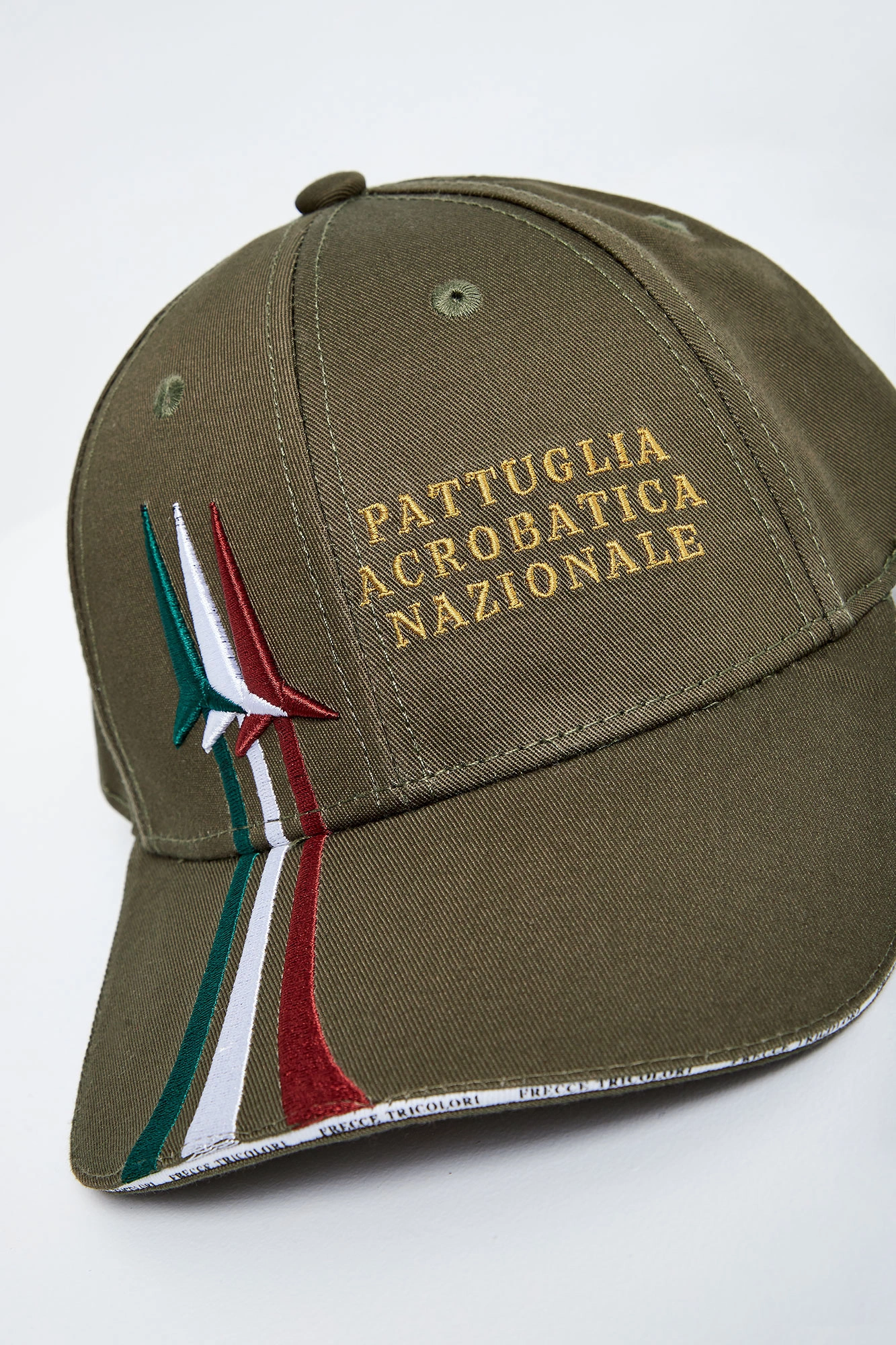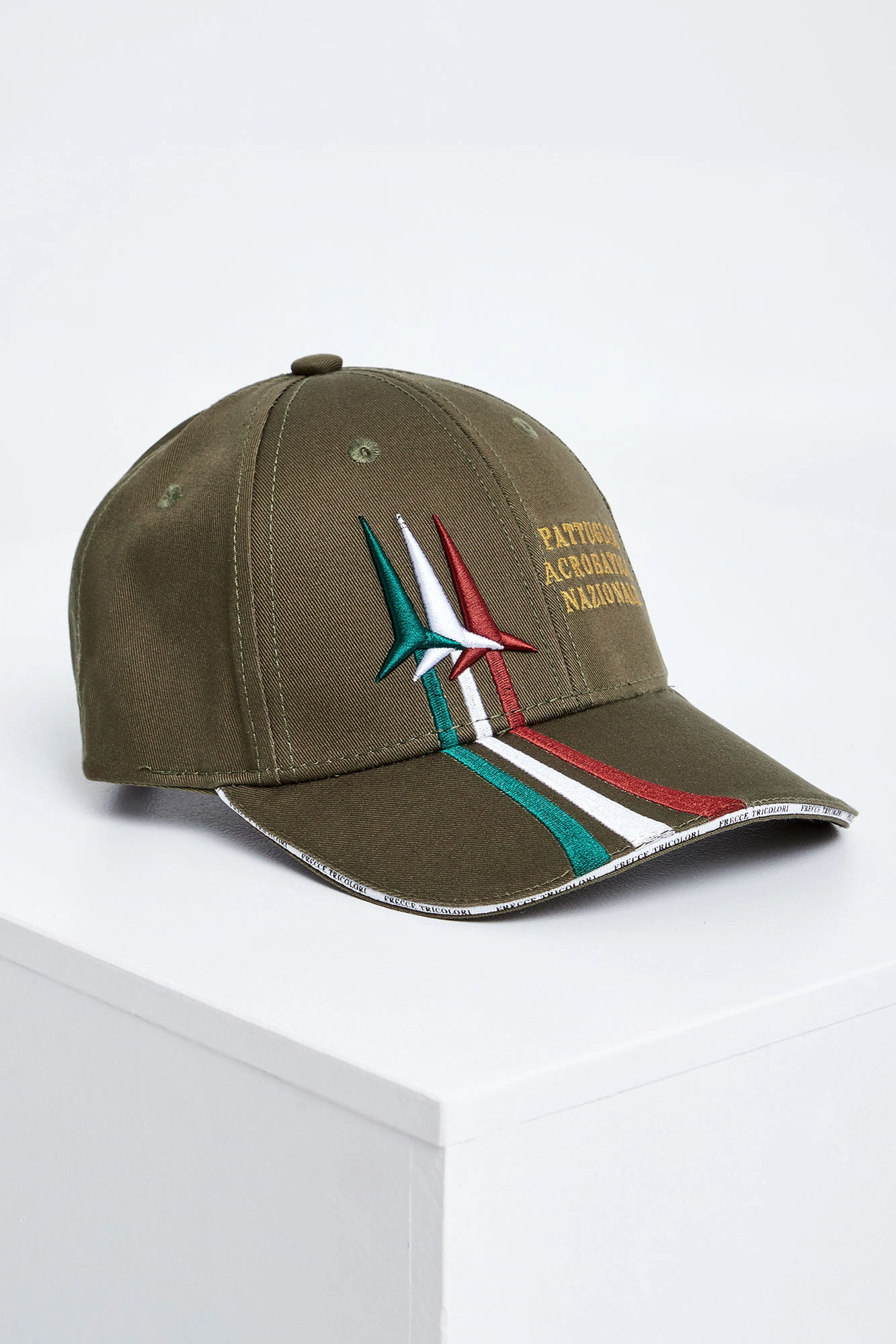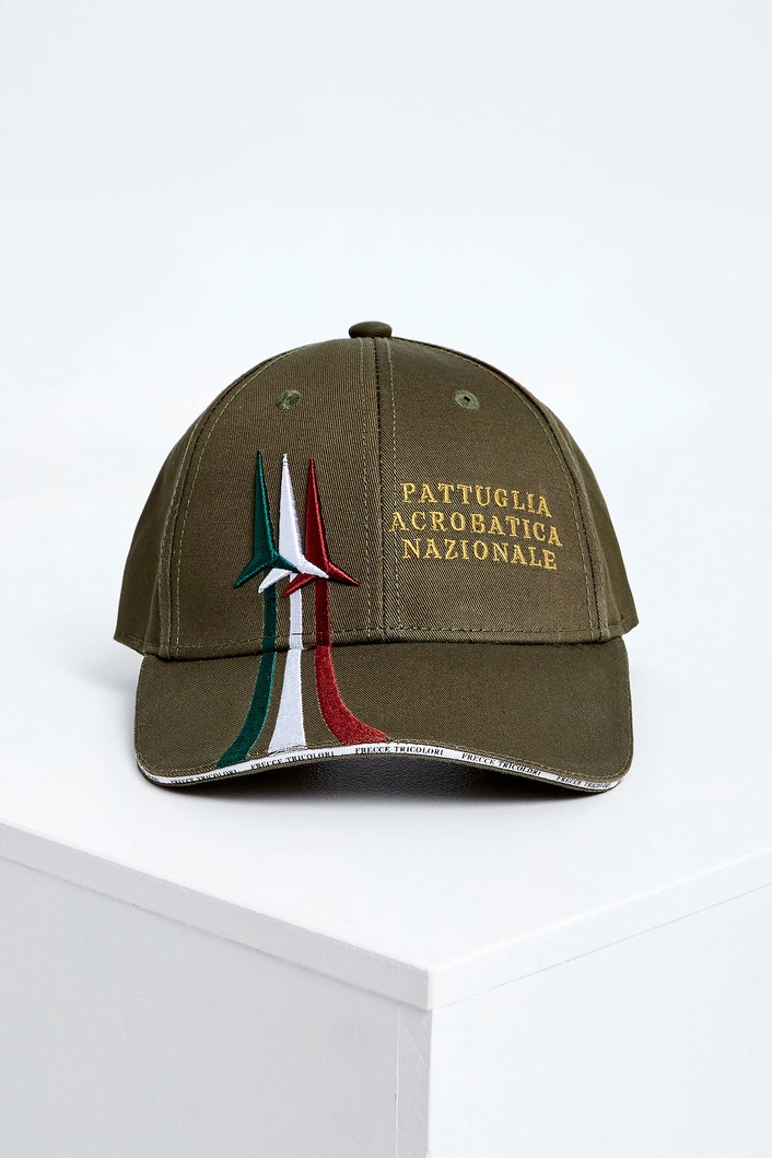 Czapka z daszkiem marki Aeronautica Militare w kolorze khaki. Na froncie i z tyłu bursztynowe hafty. Dodatkowo haft w kolorach włoskiej flagi. Regulowana z tyłu za pomocą sygnowanego, metalowego zapięcia w srebrnym kolorze. Wykonana z czystej bawełny.