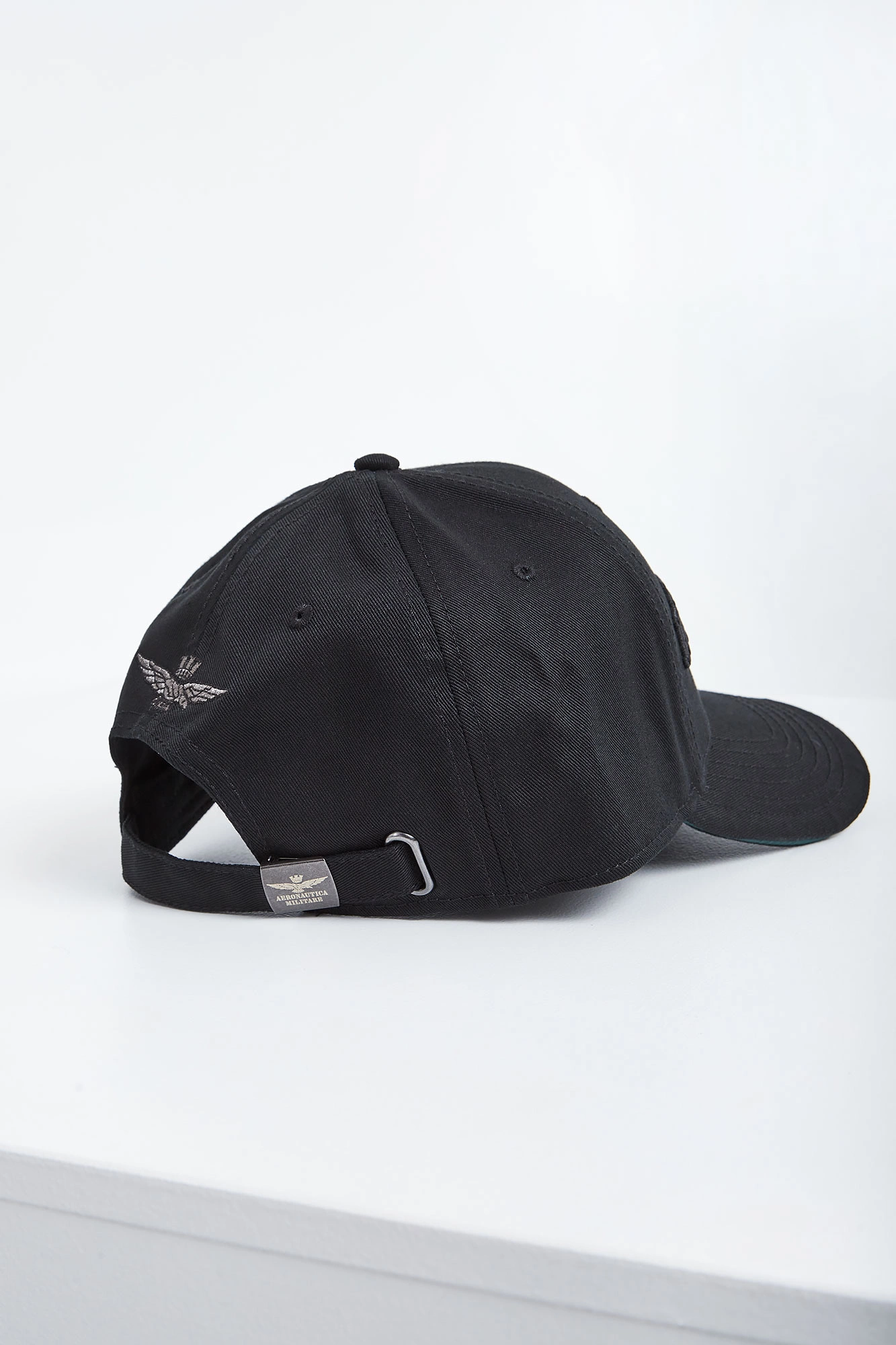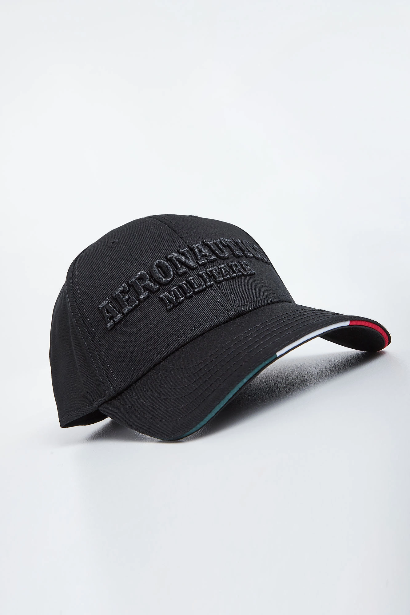 Bawełniana czapka z daszkiem marki Aeronautica Militare w czarnym kolorze. Z przodu gruby haft z nazwą marki. Daszek wykończony barwami włoskiej flagi. Model z przeszyciami i wywietrznikami. Z tyłu okrągła, wielokolorowa naszywka, haft z logo marki oraz regulowane zapięcie.