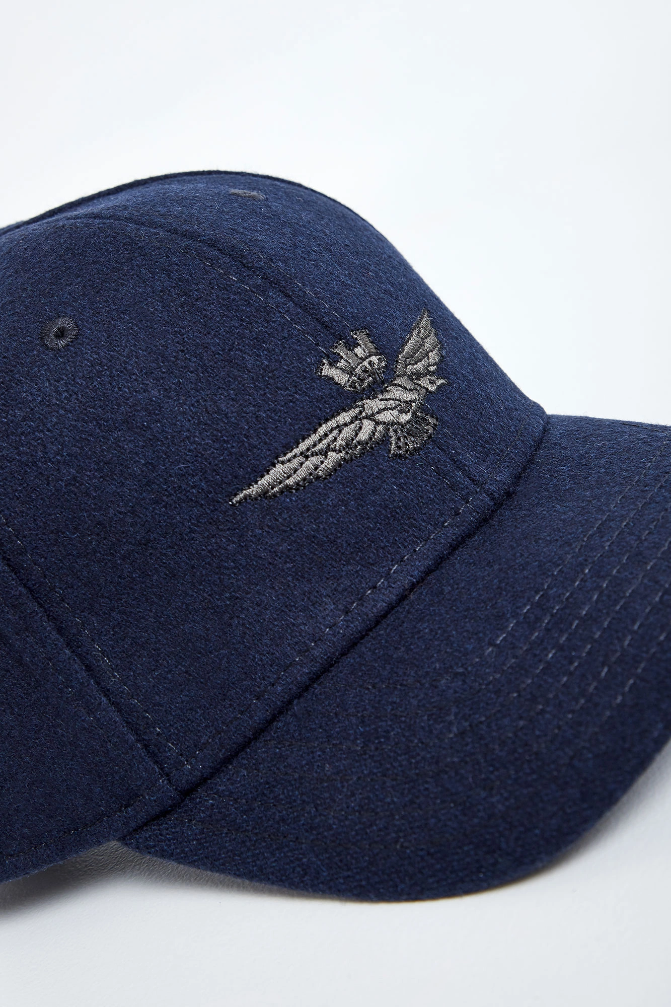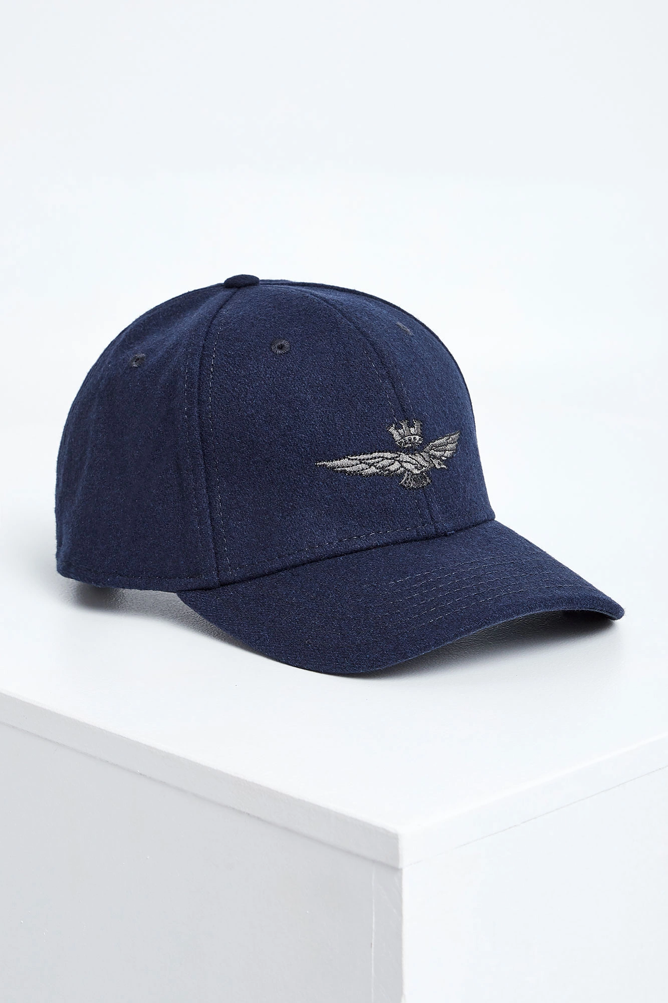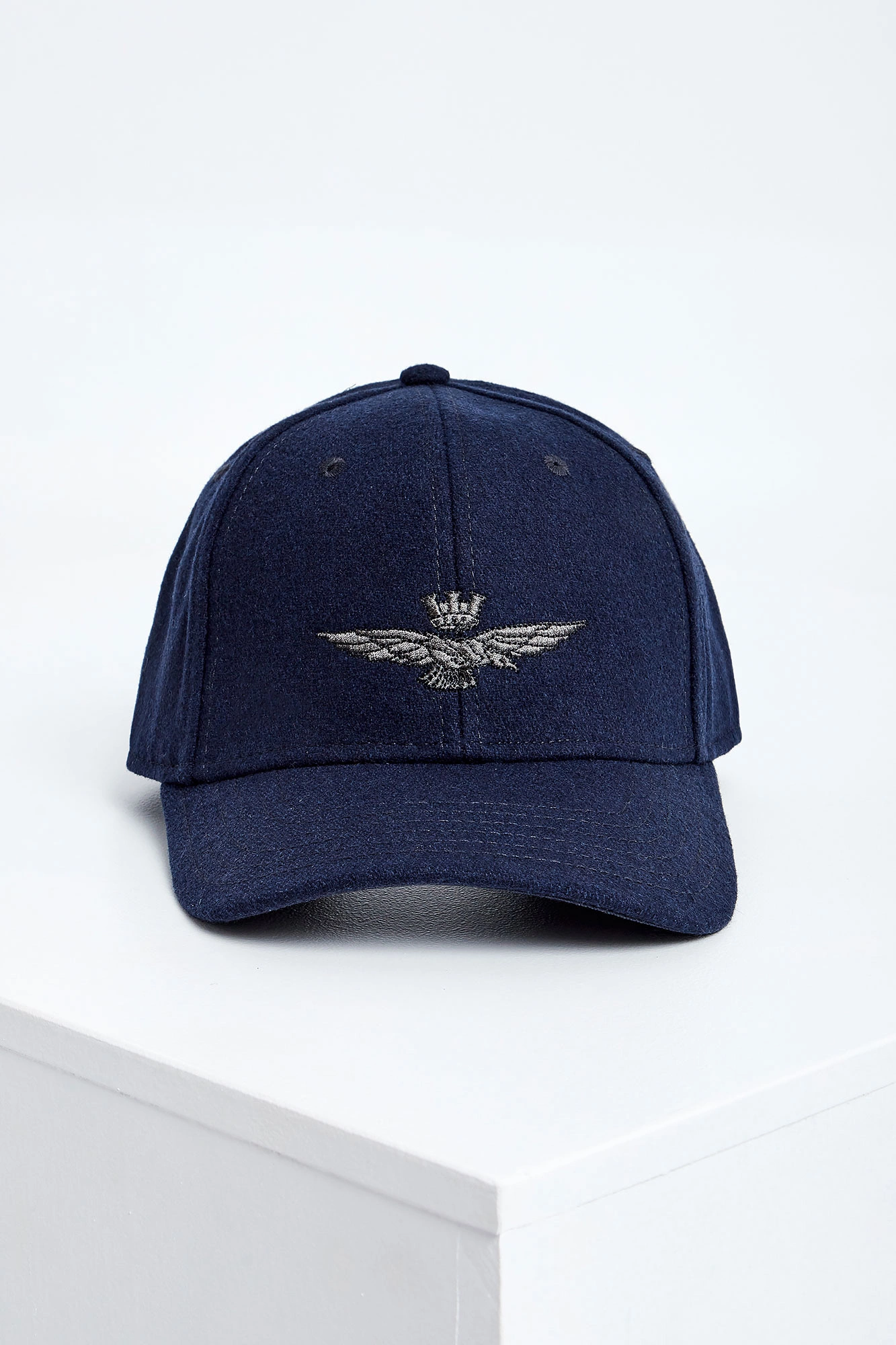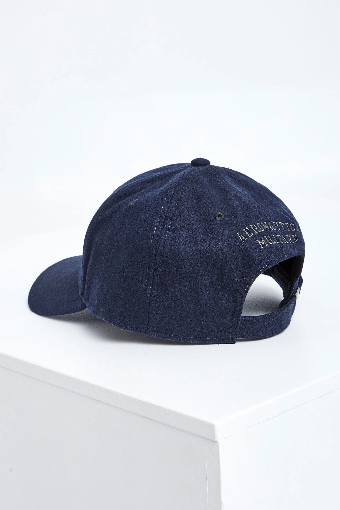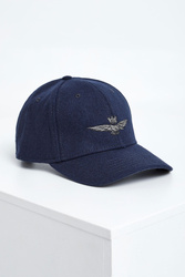 Wełniana czapka z daszkiem marki Aeronautica Militare w granatowym kolorze. Na przodzie haft z logo marki. Model z przeszyciami i wywietrznikami. Z tyłu haftowana nazwa marki. Regulowana za pomocą metalowego, logowanego zapięcia w srebrnym kolorze.