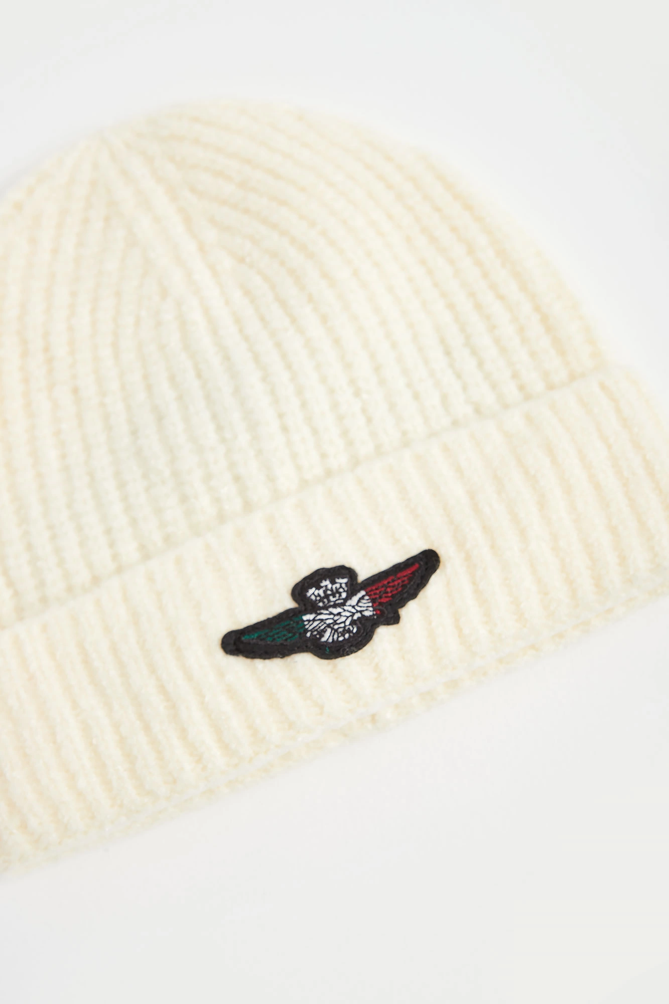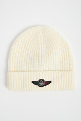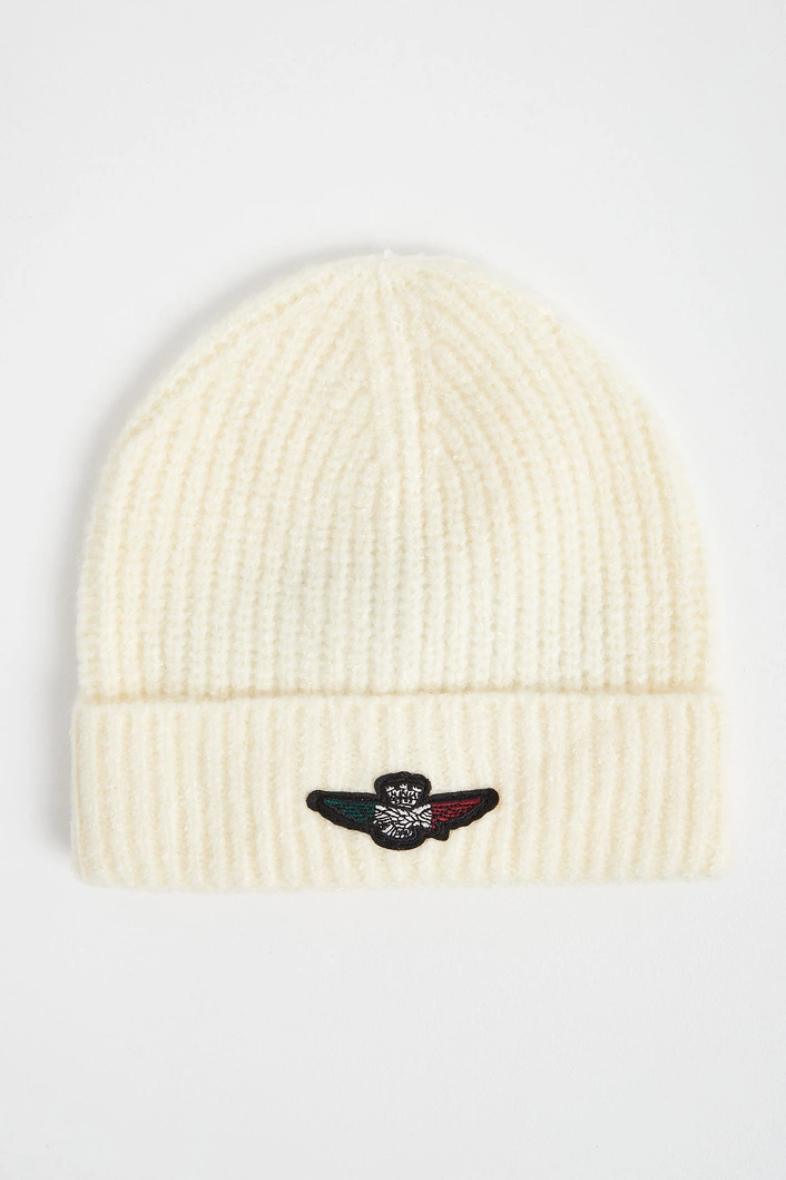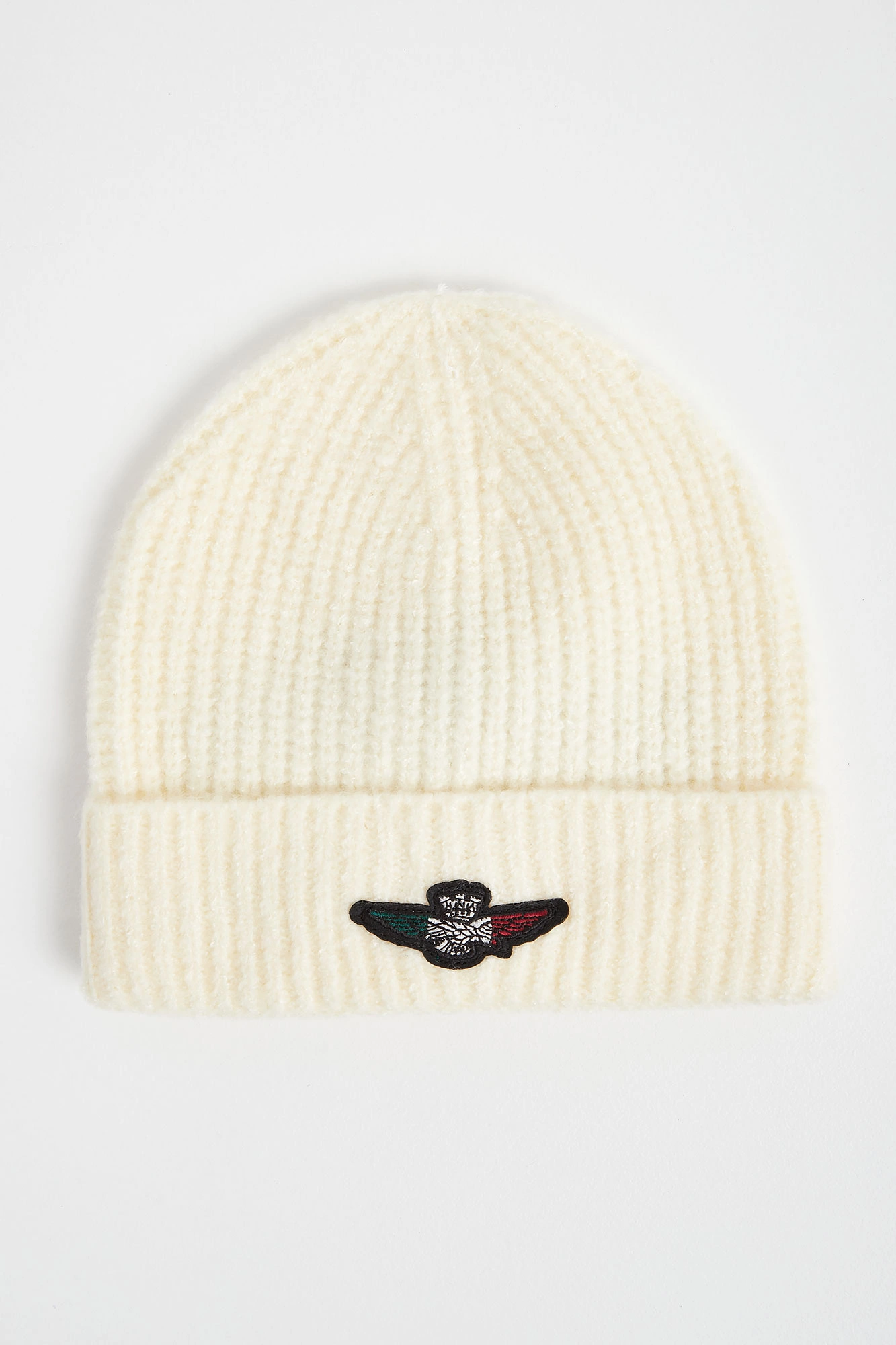 Dzianinowa czapka marki Aeronautica Militare w kolorze ecru. Zakończona podwijanym ściągaczem. Na froncie trójkolorowa, sygnowana naszywka z charakterystycznym logo marki.