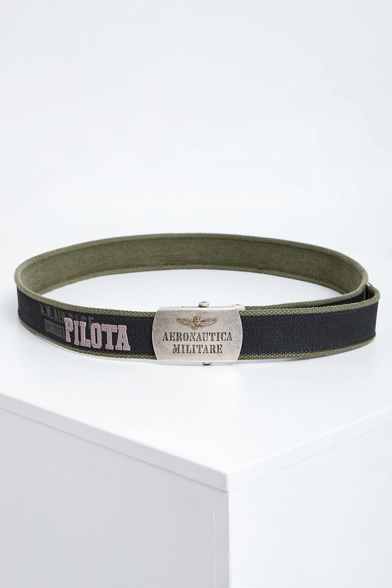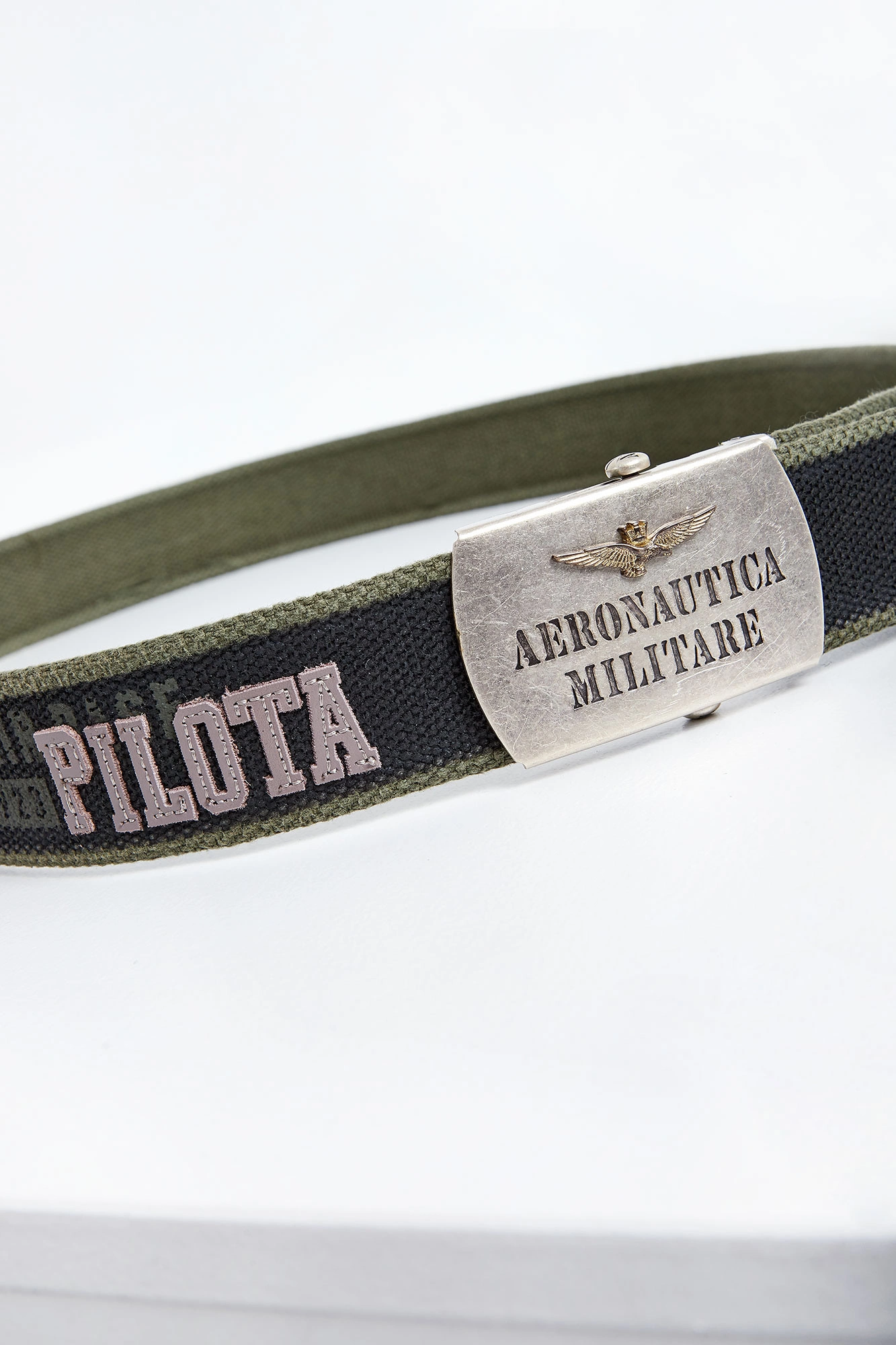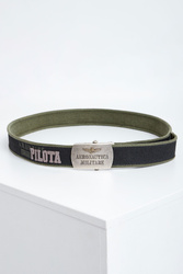 Bawełniany pasek marki Aeronautica Militare w kolorze khaki. Z nadrukowanym napisem, zawierającym nazwę marki oraz napisem w formie naszywki ze skórzaną strukturą w kolorze wrzosu. Wnętrze i wykończenie w jaśniejszym odcieniu. Zapinany za pomocą metalowej klamry z tłoczoną nazwą marki i aplikacją logo. Końcówka paska metalowa.