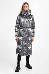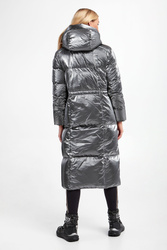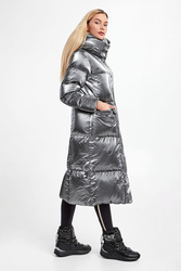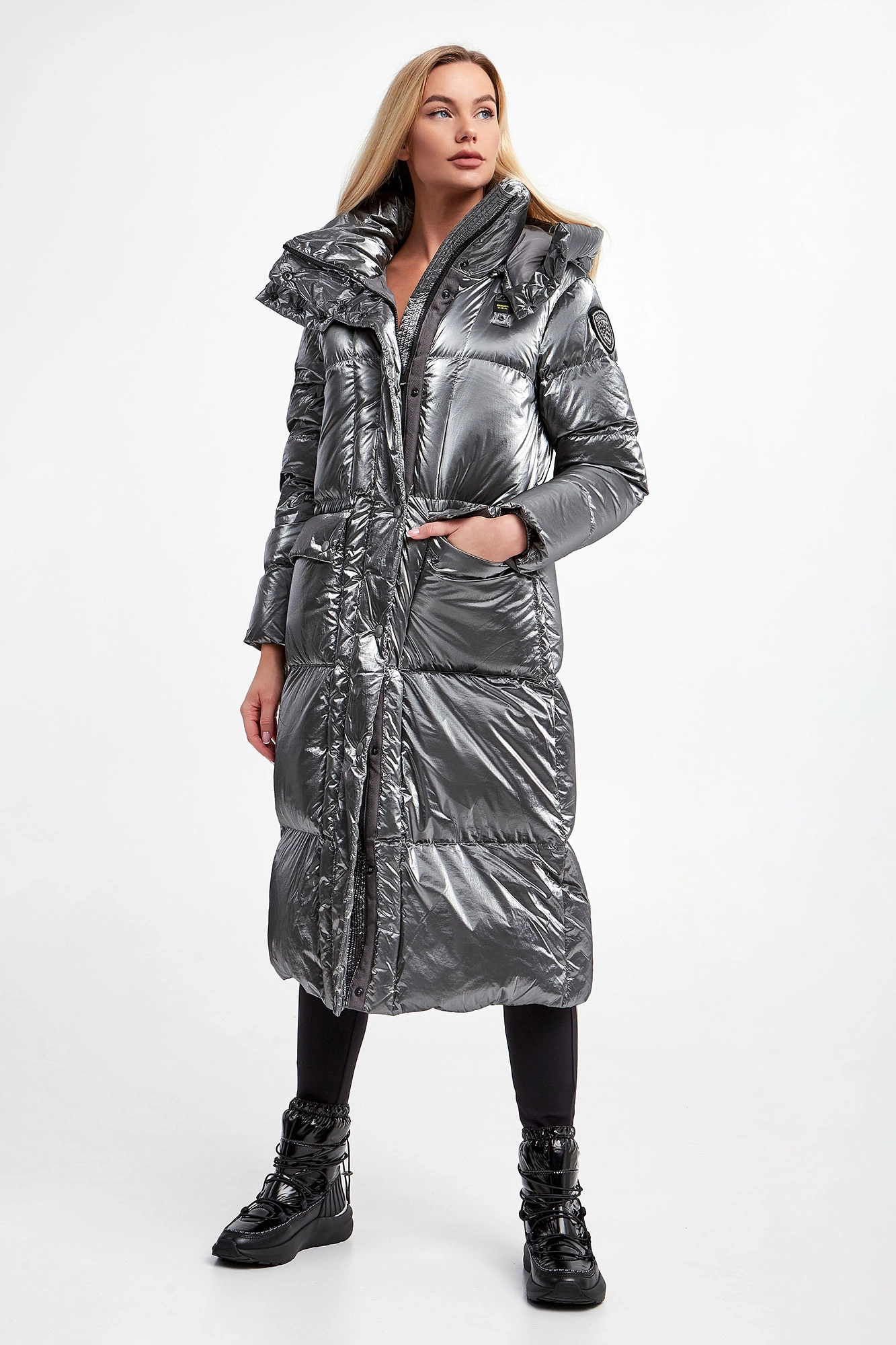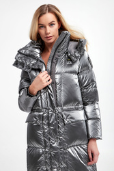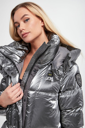 Płaszcz puchowy marki Blauer w srebrnym kolorze. Naturalne wypełnienie. Całość połyskująca i pikowana. Ze stójką i kapturem regulowanym za pomocą troczków w czarnym kolorze. Zapinana za pomocą zamka i nap pokrytych tasiemką. Długie rękawy zakończone mankietem przeciwsztormowym. Na lewym rękawie aplikacja z nazwą marki wykończona cyrkoniami. Model z dwoma kieszeniami z patką, zapinanymi za pomocą nap. Talia regulowana za pomocą elastycznych troczków ze stoperem.