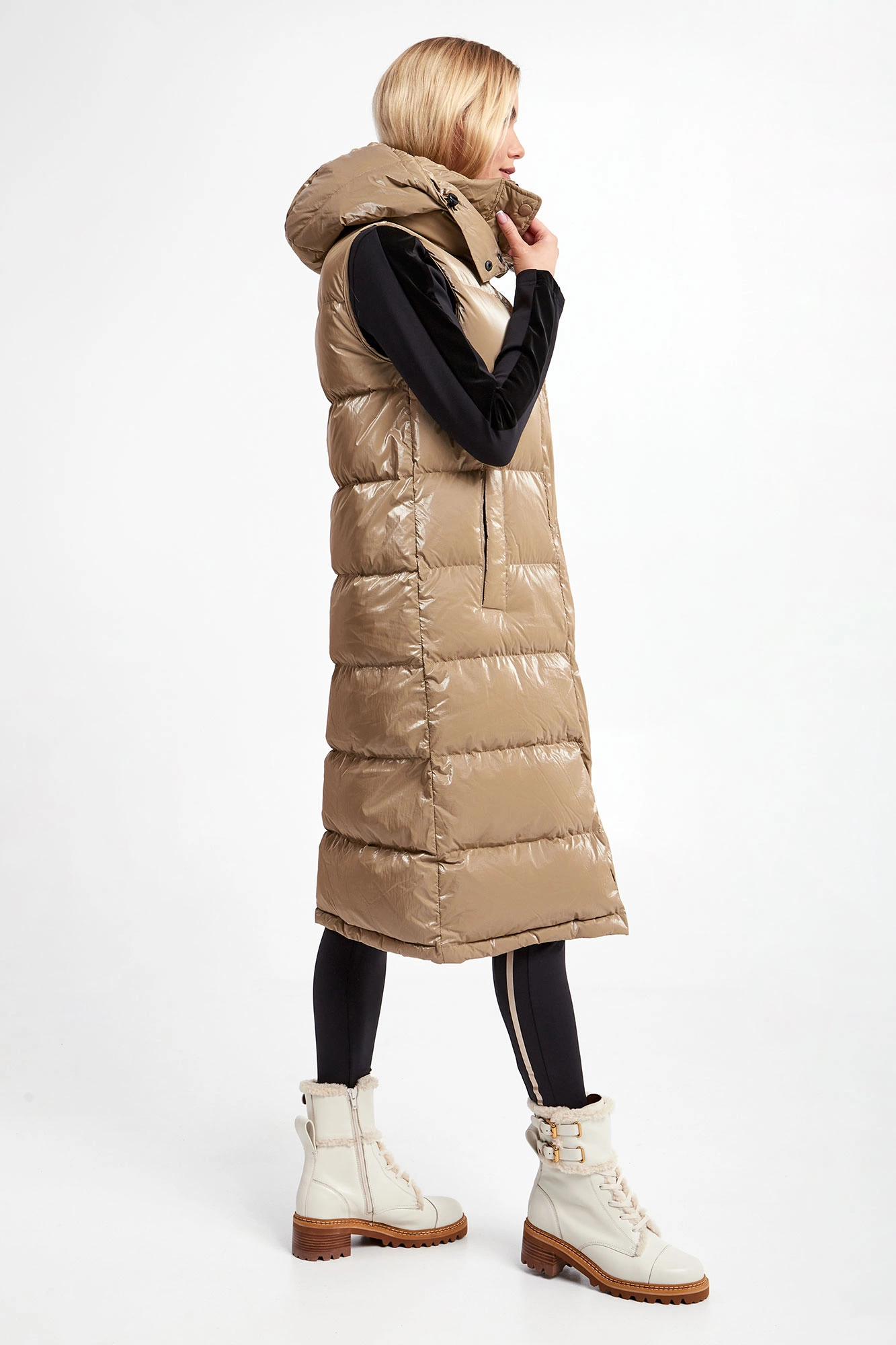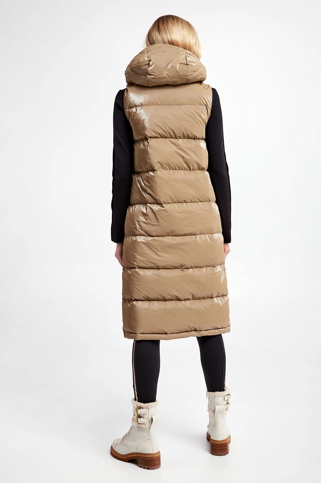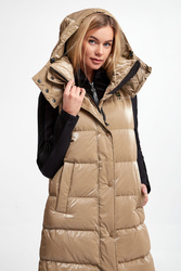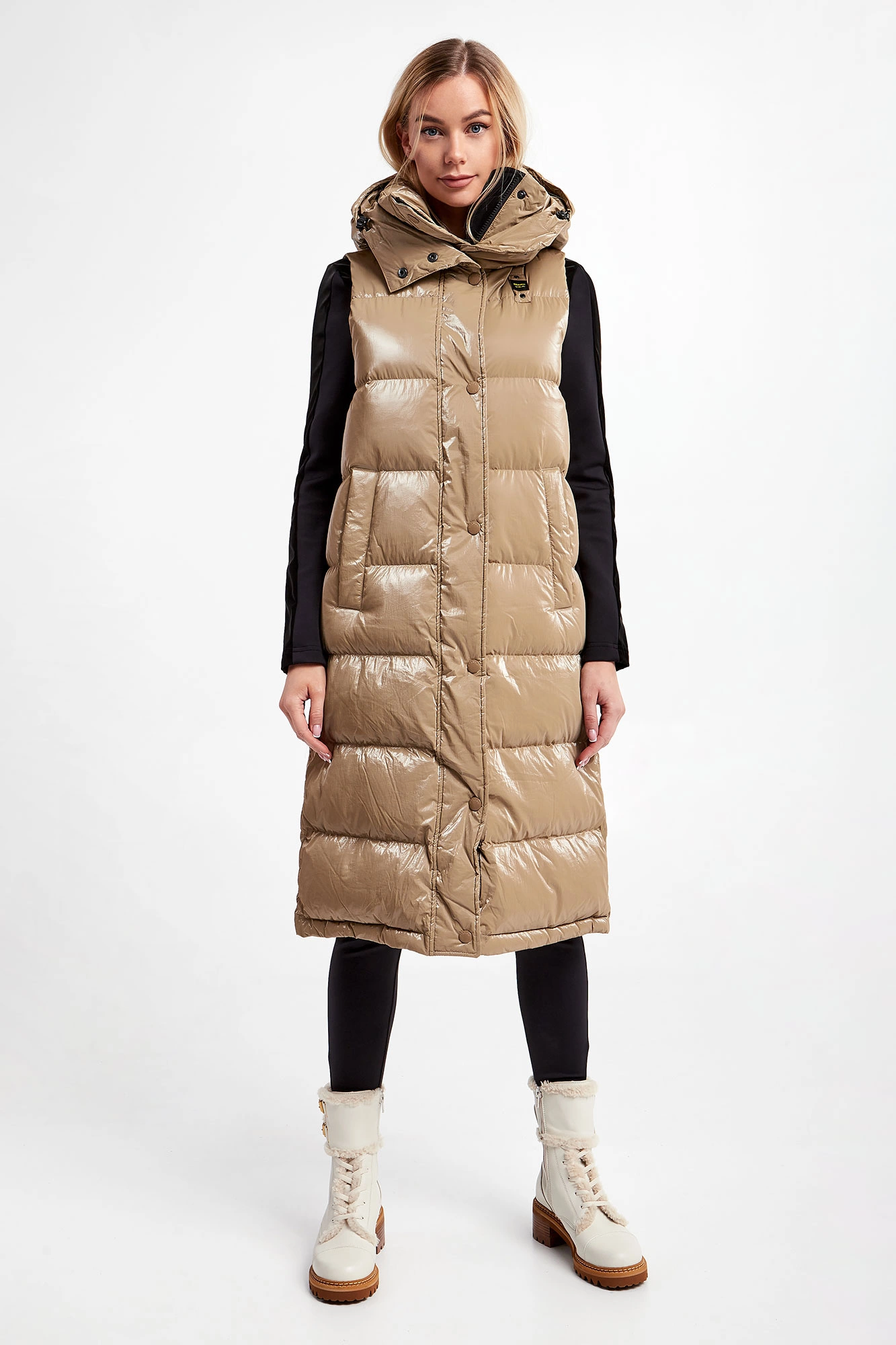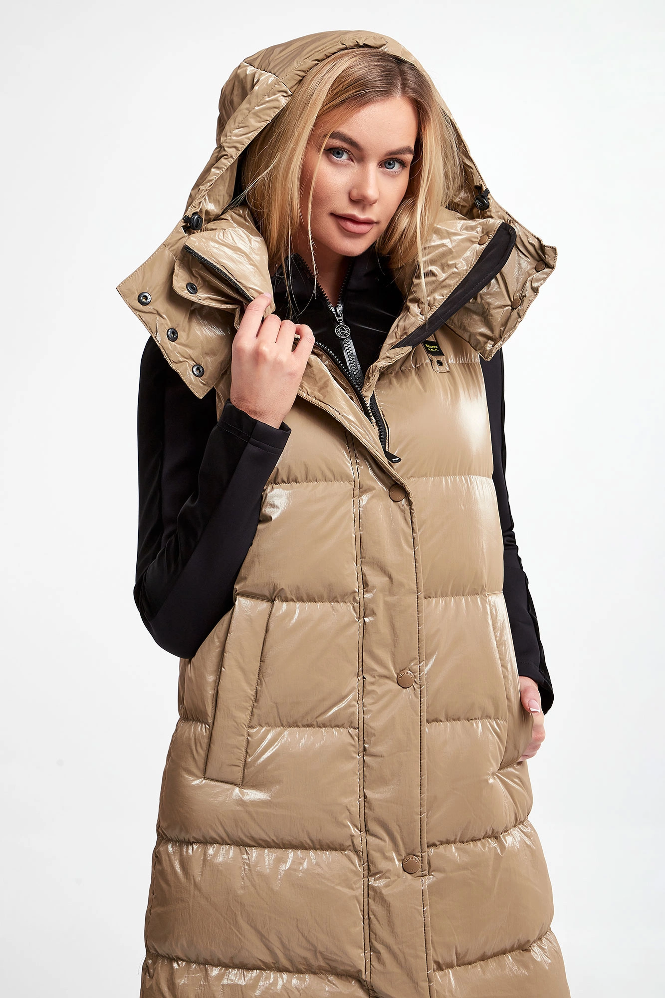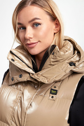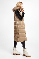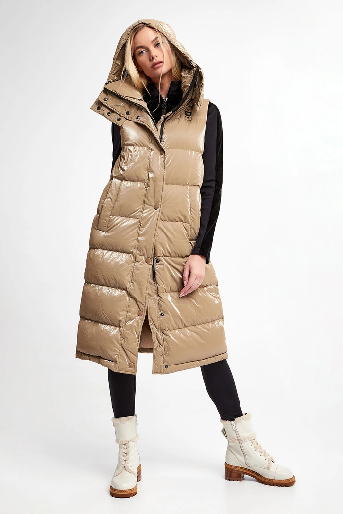 Długa kamizelka puchowa marki Blauer w beżowym kolorze. Całość pikowana. Ze stójką i kapturem regulowanym za pomocą elastycznych troczków ze stoperem. Zapinany za pomocą zamka i nap. Model z dwoma wpuszczanymi kieszeniami. Z przodu naszywka z nazwą marki. Naturalne wypełnienie. Fason regular.