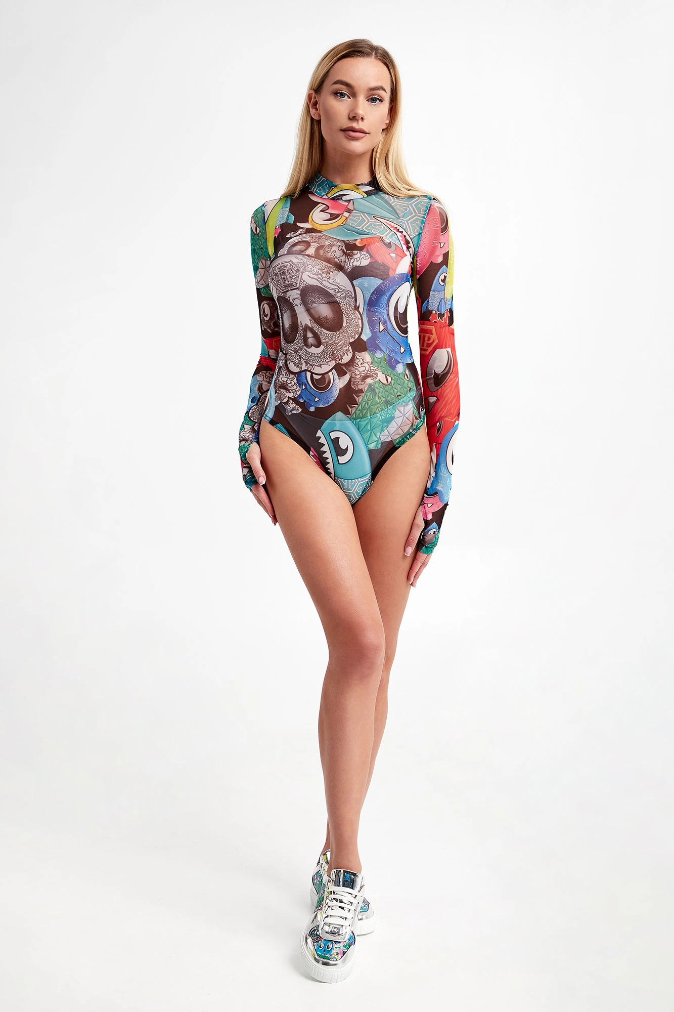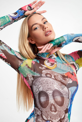 Body Monsters marki Philipp Plein. W całości pokryte charakterystycznym dla marki wielokolorowym nadrukiem. Dekolt typu high neck. Długi rękaw. Otwór na kciuki na obu rękawach. Model wykonany z elastycznego prześwitującego tiulu.