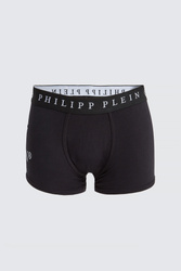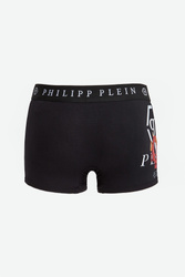 Bokserki marki Philipp Plein w czarnym kolorze. Wykonane z mieszanki modalu i bawełny z dodatkiem elastycznych włókien. W pasie elastyczny ściągacz z nadrukiem nazwy i logo marki w kontrastowym, białym kolorze. Po boku na udzie duża grafika i emblemat.