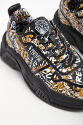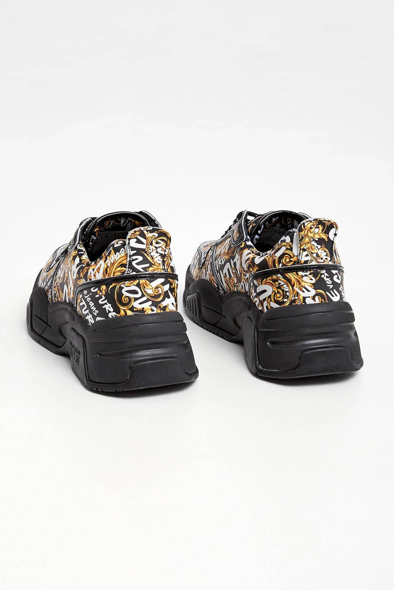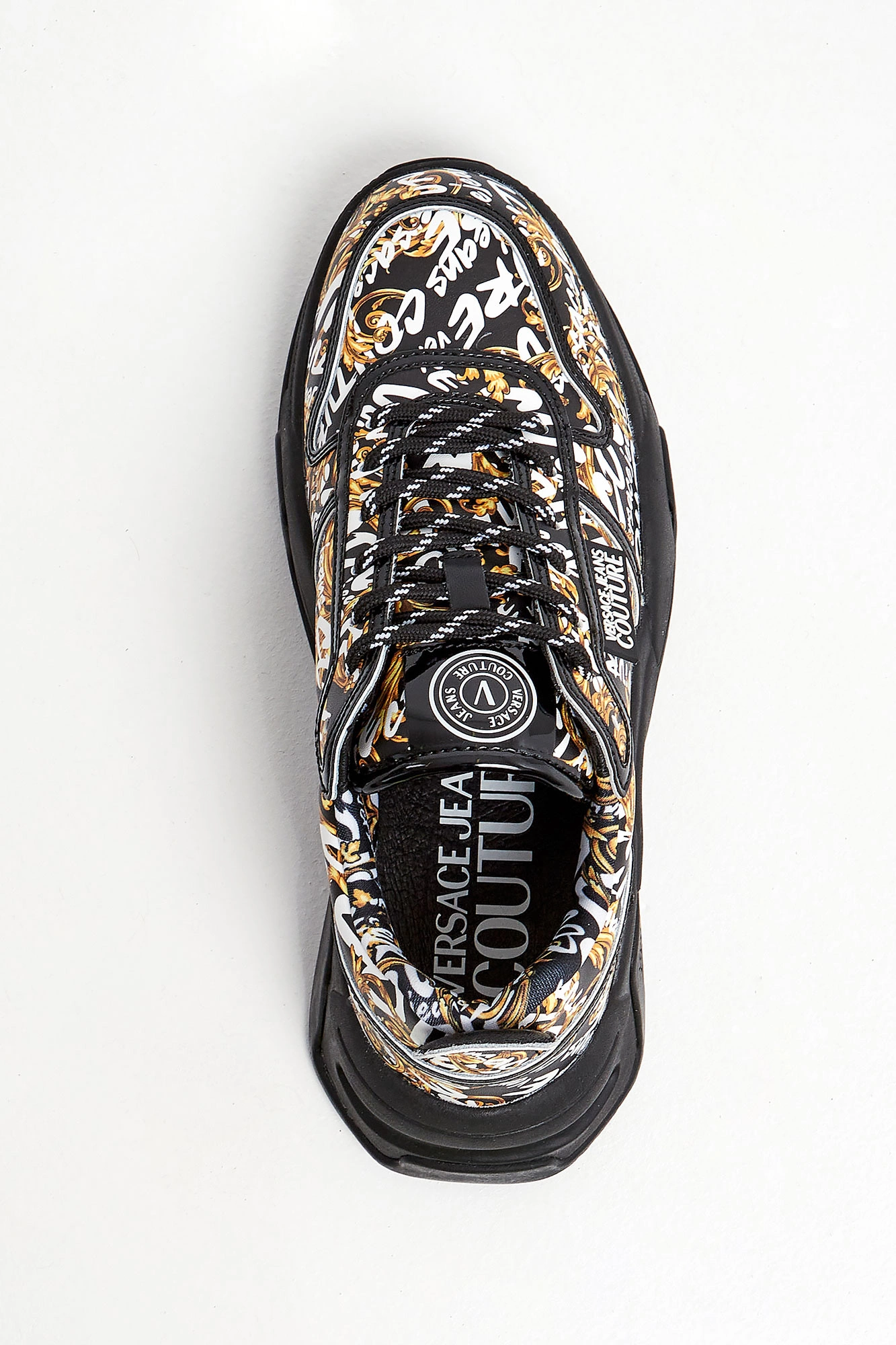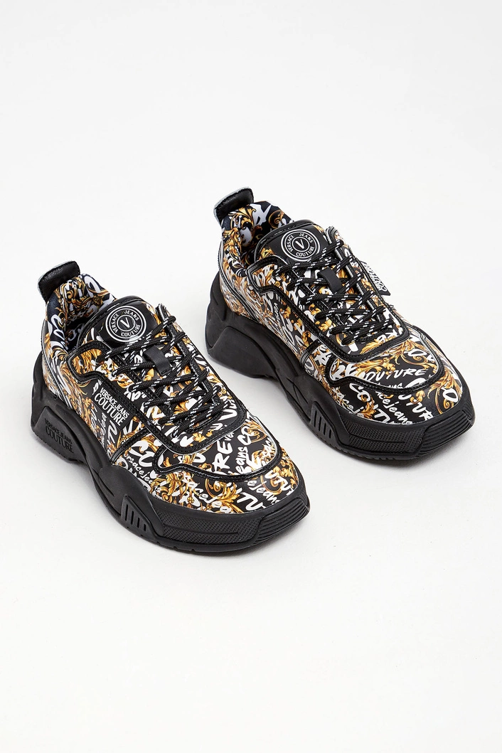 Sneakersy marki Versace Jeans Couture w czarnym kolorze. Na całości złoto-biały nadruk z charakterystycznym dla marki motywem. Na języku czarna, skórzana naszywka z białym logo marki. Gruba, czarna podeszwa. Sznurowane wiązanie. Sygnowana, skórzana wyściółka.