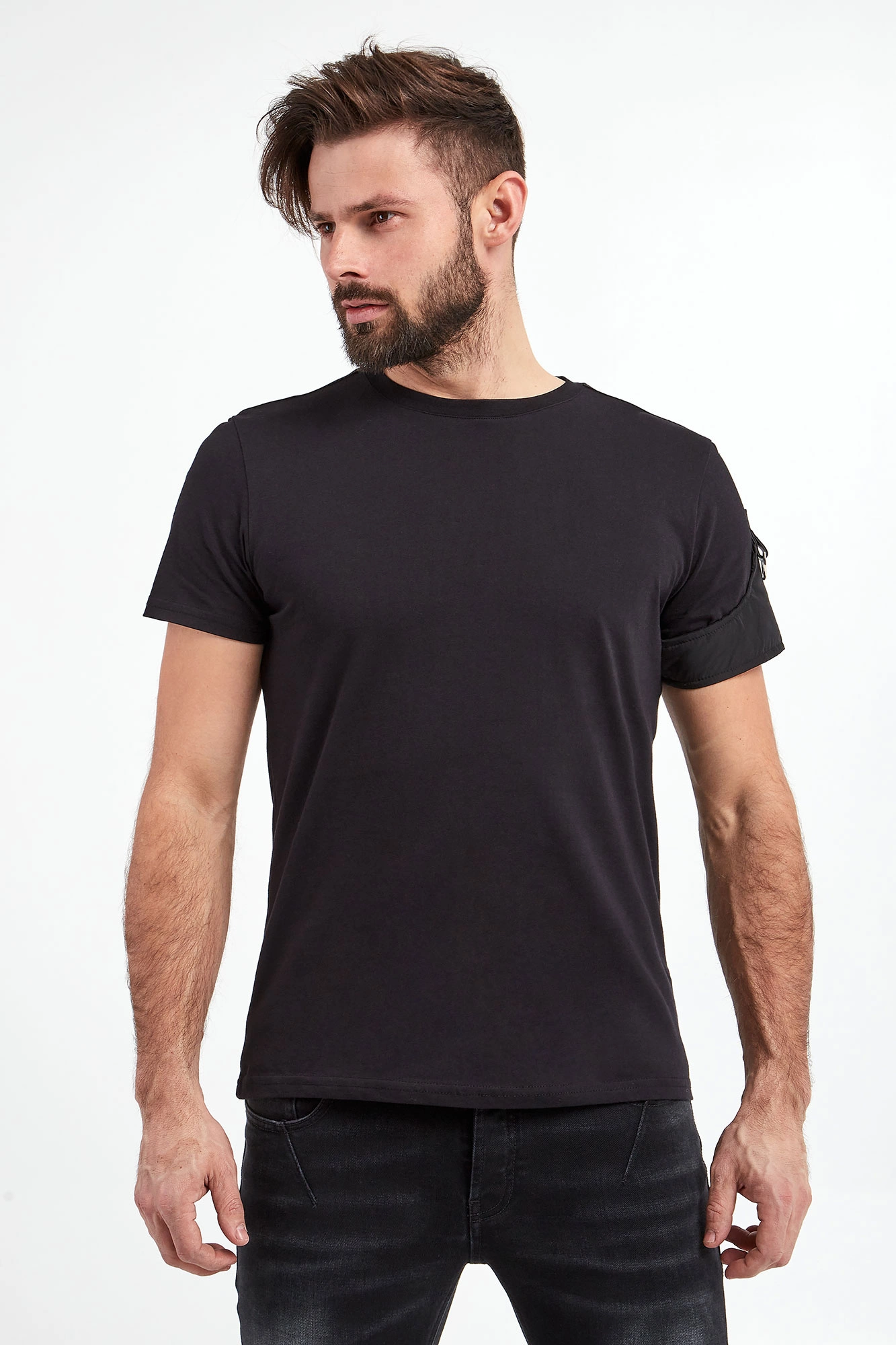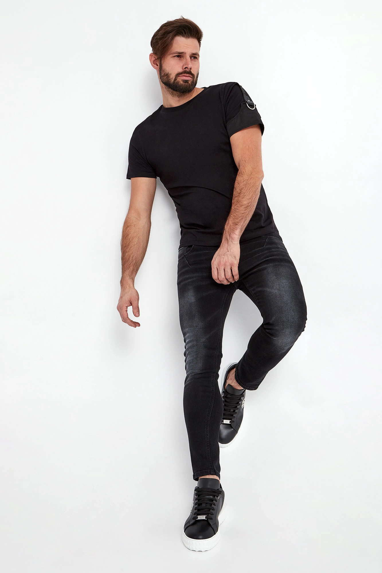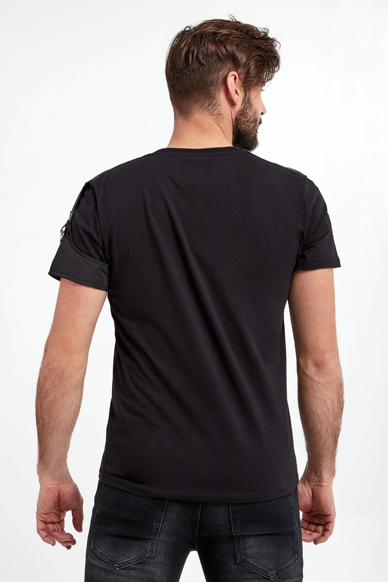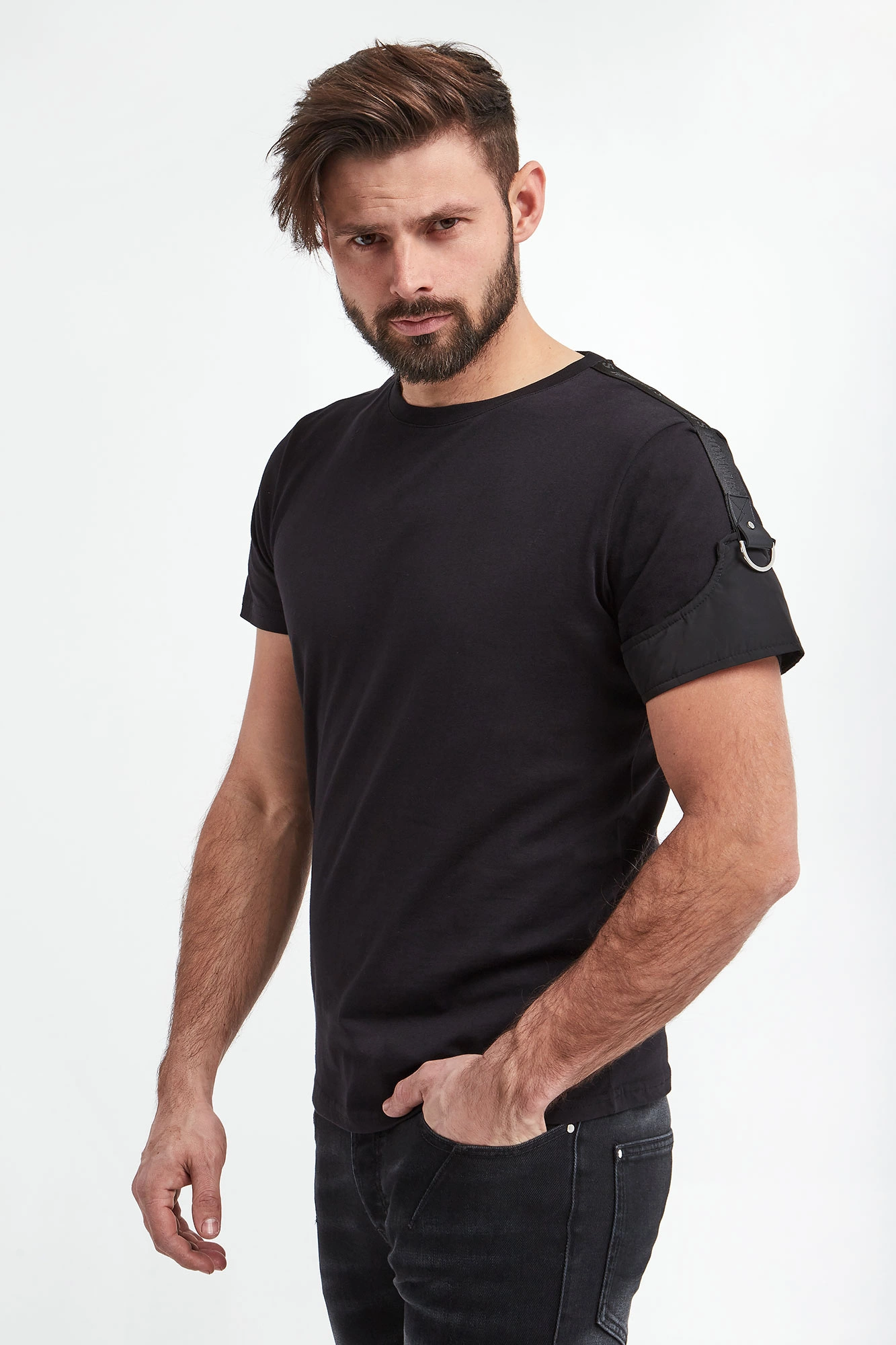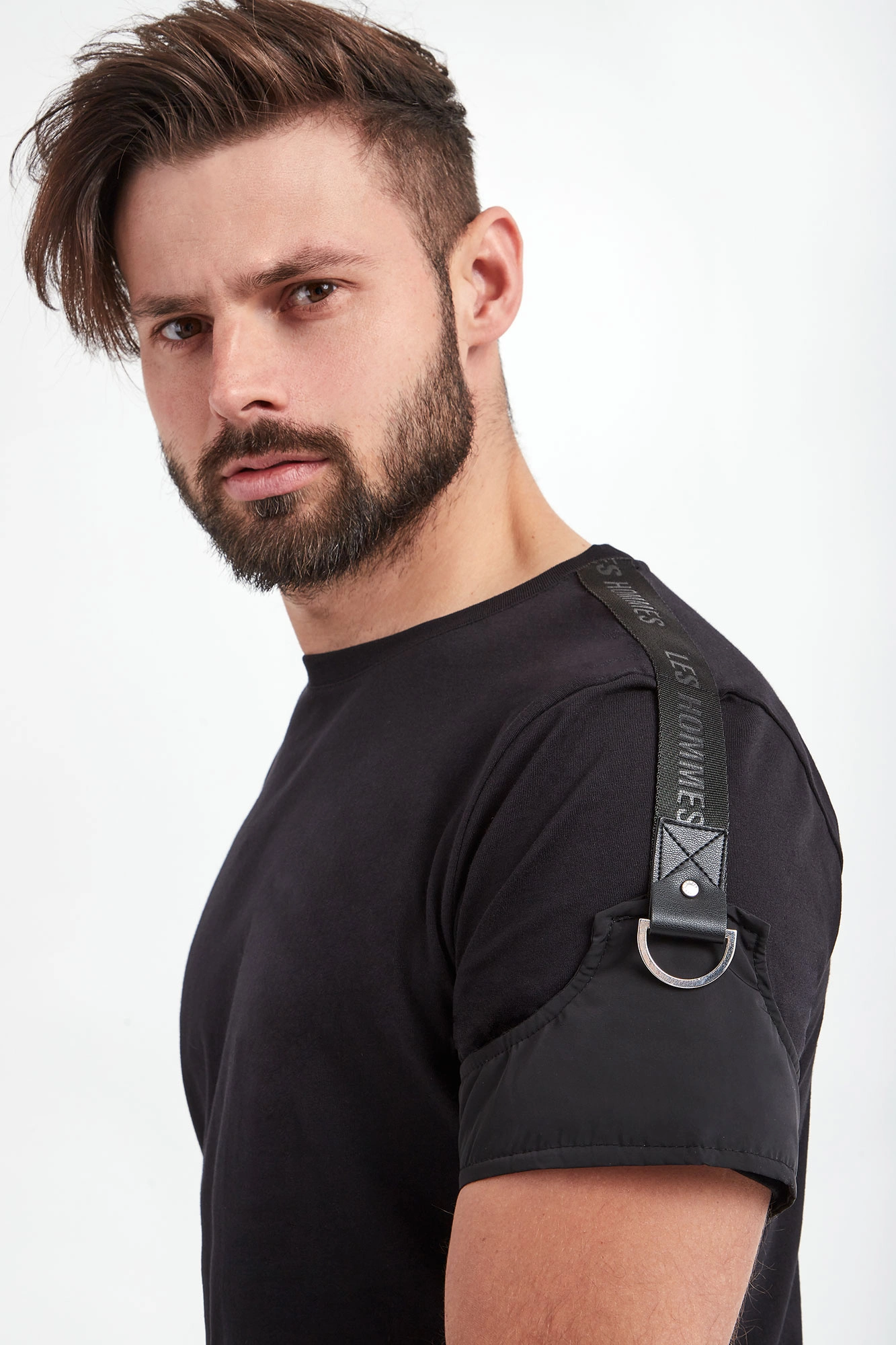 T-shirt marki Les Hommes w czarnym kolorze. Wykonany ze stuprocentowej, bawełnianej dzianiny. Na ramionach naszywany lampas z tłoczona nazwa marki, zakończony na lewym rękawie skórzanym paskiem ze sprzączką i ozdobną opaską. Dekolt typu o-neck wykończony ściągaczem. Fason typu regular.