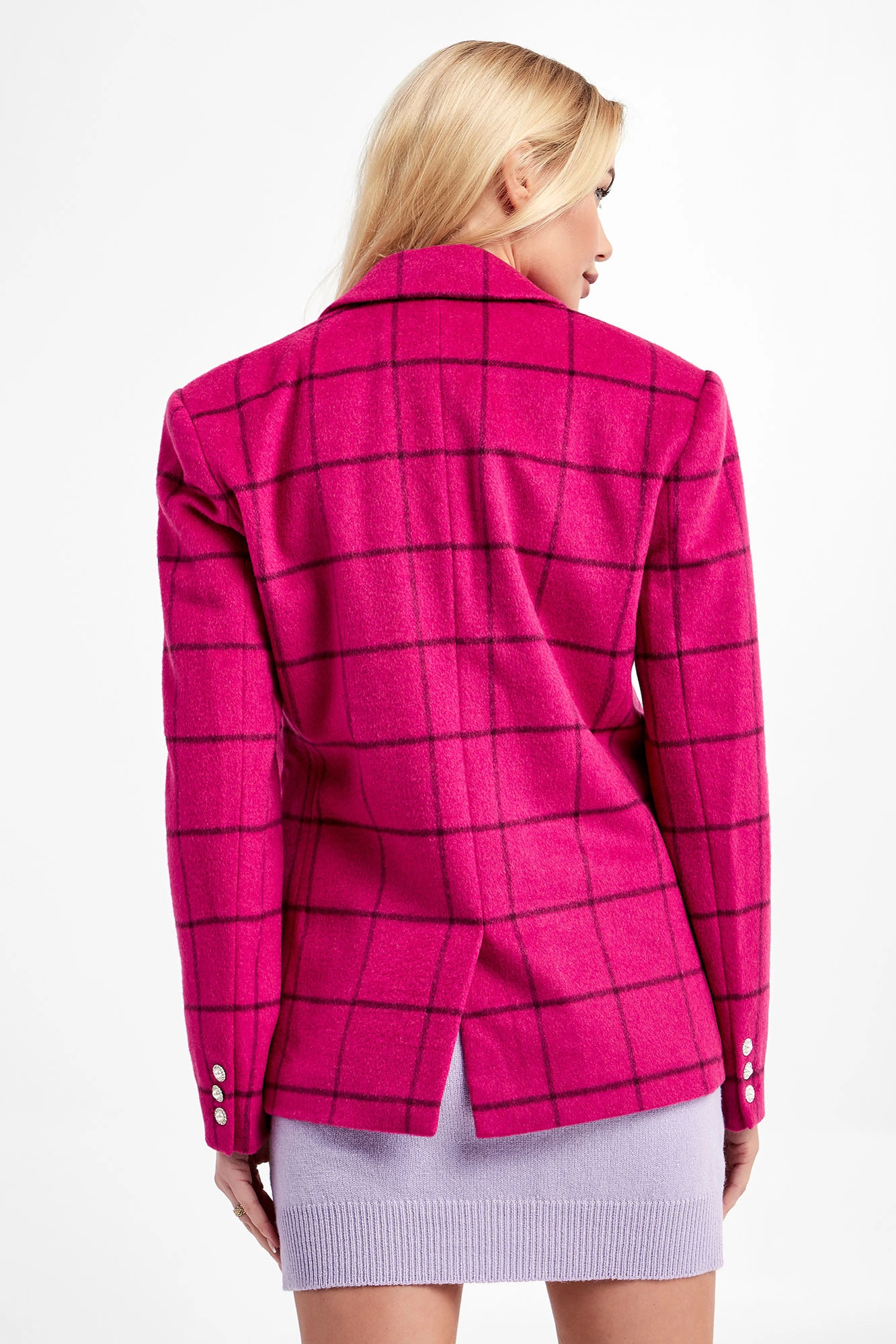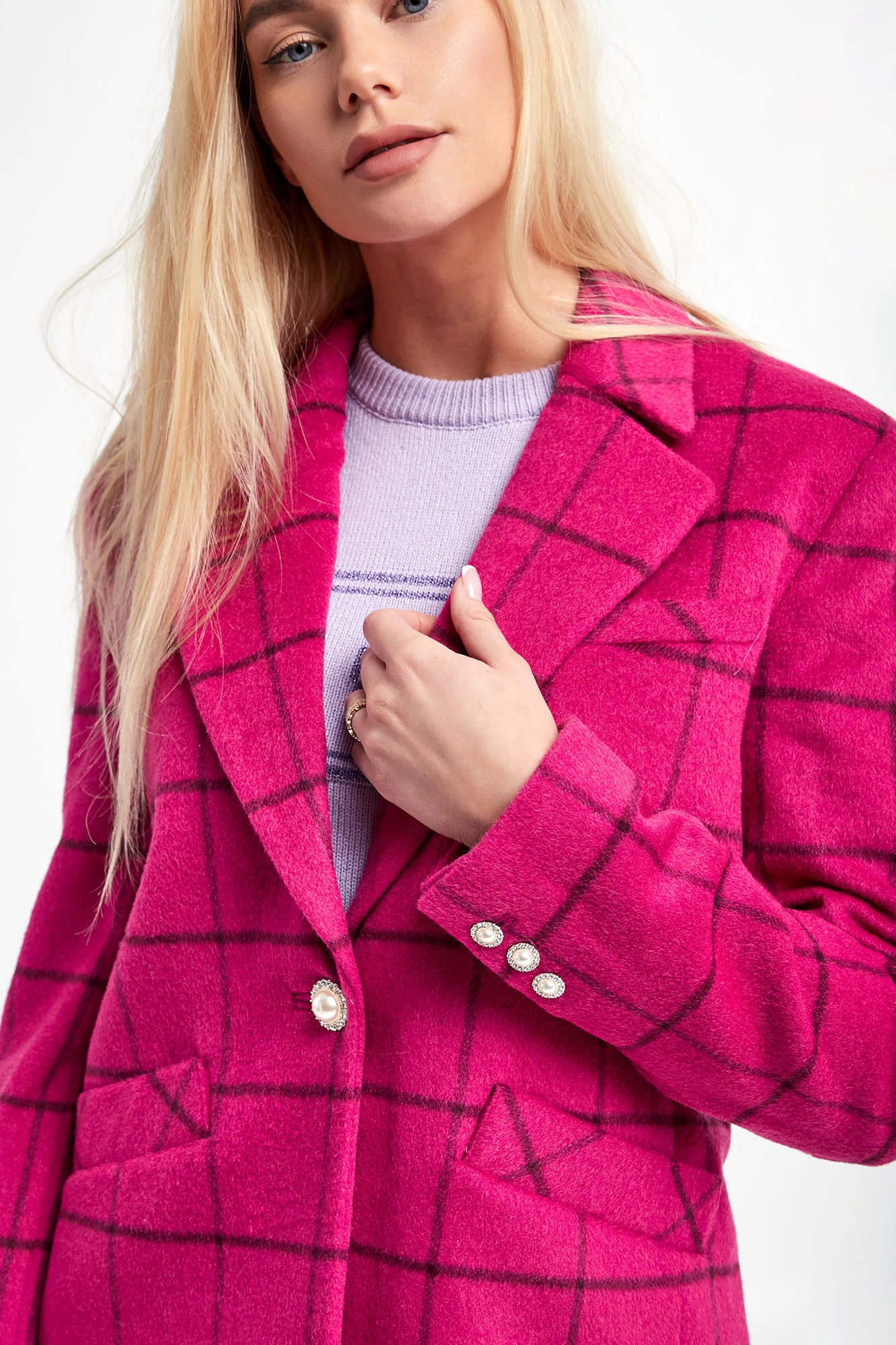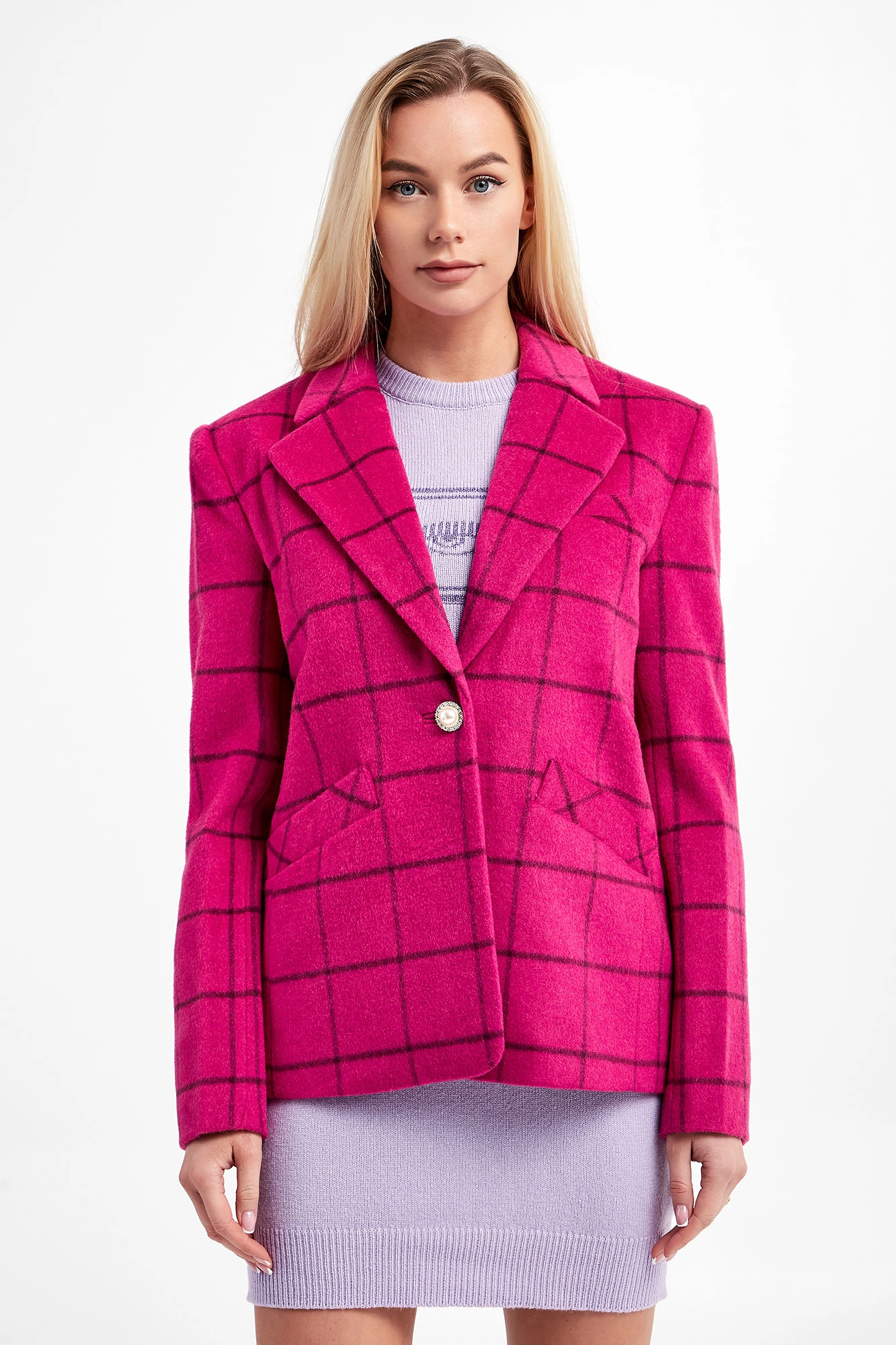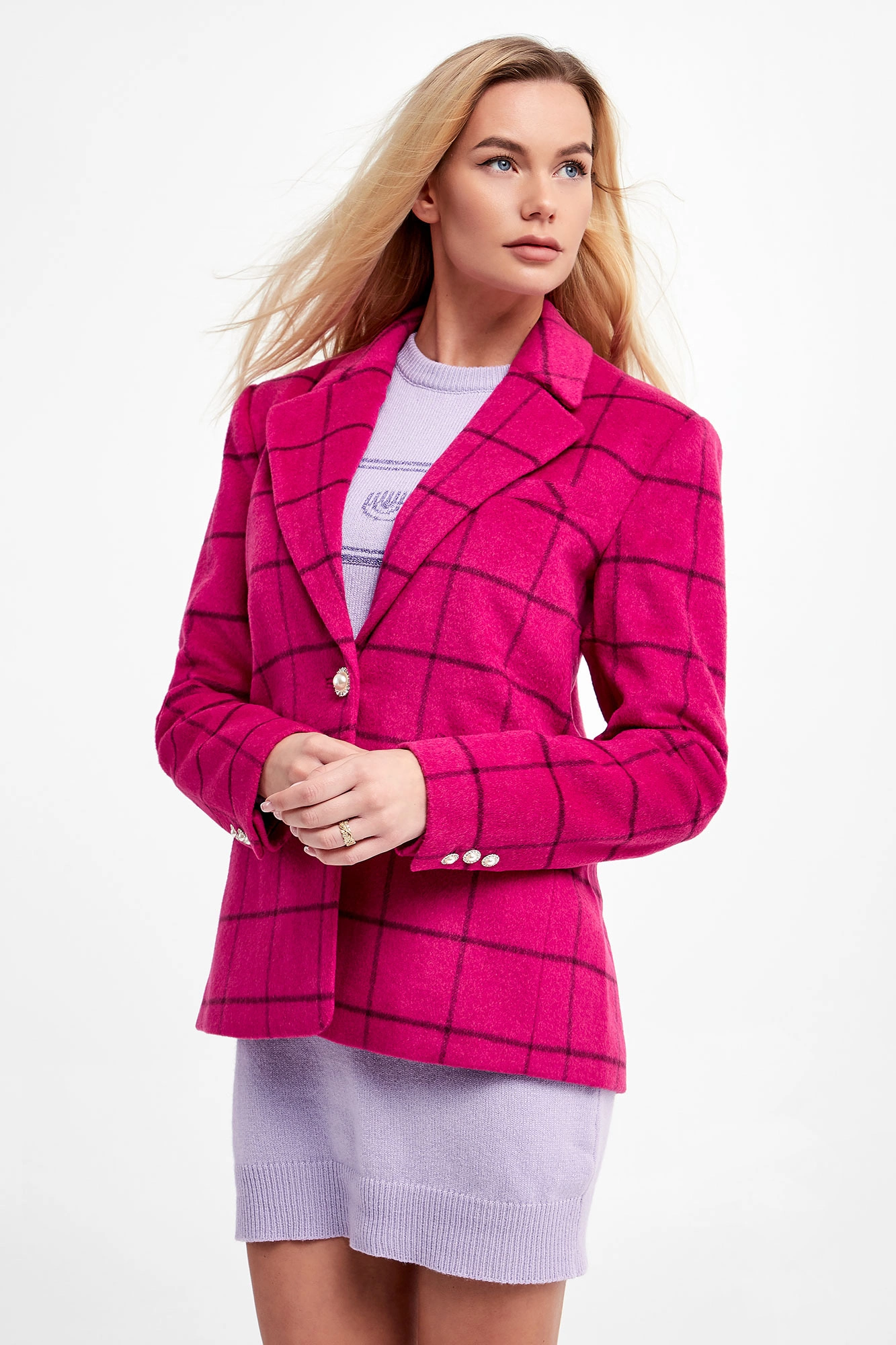 Marynarka wełniana marki Custommade w różowym kolorze. Na całości wzór w postaci kraty. Z klasyczną klapą. Zapinana za pomocą ozdobnego, perłowego guzika. Model z dwoma wpuszczanymi kieszeniami. Długie rękawy wykończone niewielkimi, ozdobnymi guzikami. Fason typu regular.