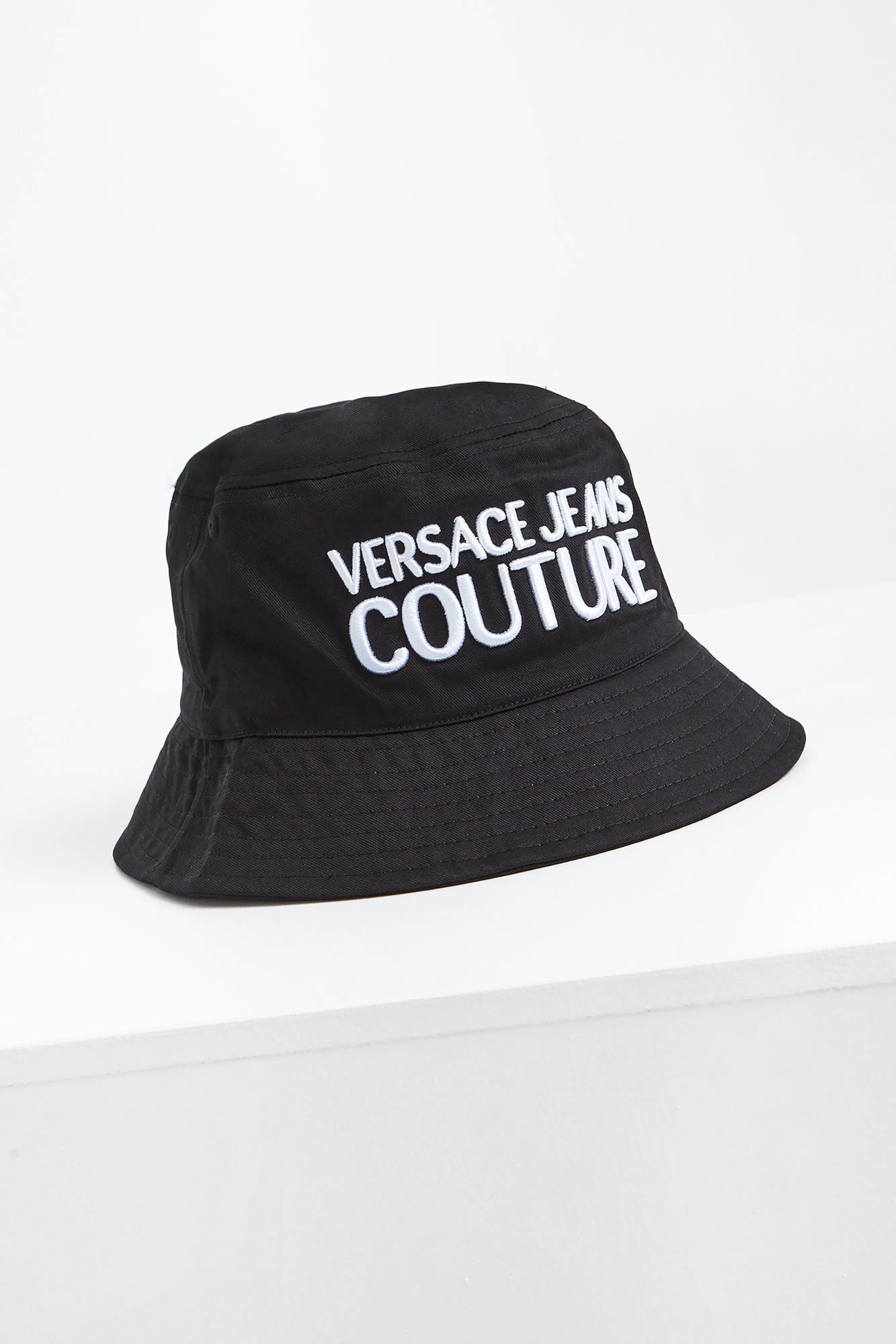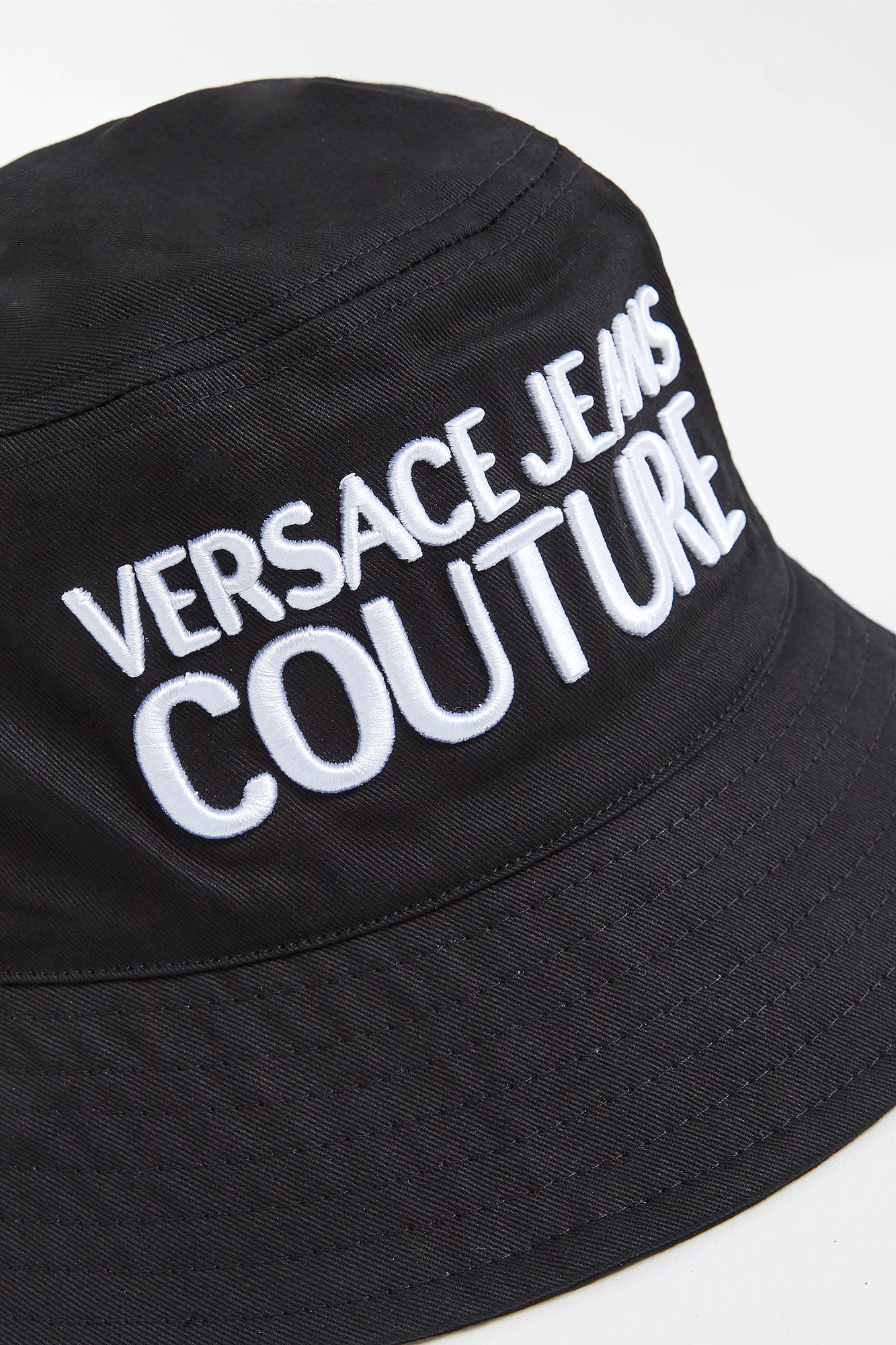 Bucket hat marki Versace Jeans Couture w czarnym kolorze. Na przodzie gruby kontrastowy haft z nazwą marki w białym kolorze. Model z wywietrznikami i przeszyciami. Wykonany z czystej bawełny.