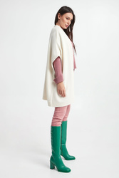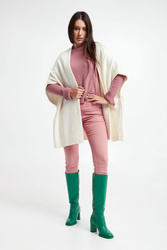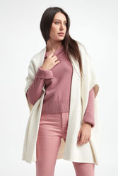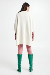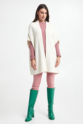 Ponczo marki Marella Monochrome w kolorze ecru. Obniżona linia ramion Dół wykończony prążkowanym ściągaczem. Fason typu oversize. Wykonane z wełnianej tkaniny z domieszką wiskozy, kaszmiru oraz elastycznych włókien.
