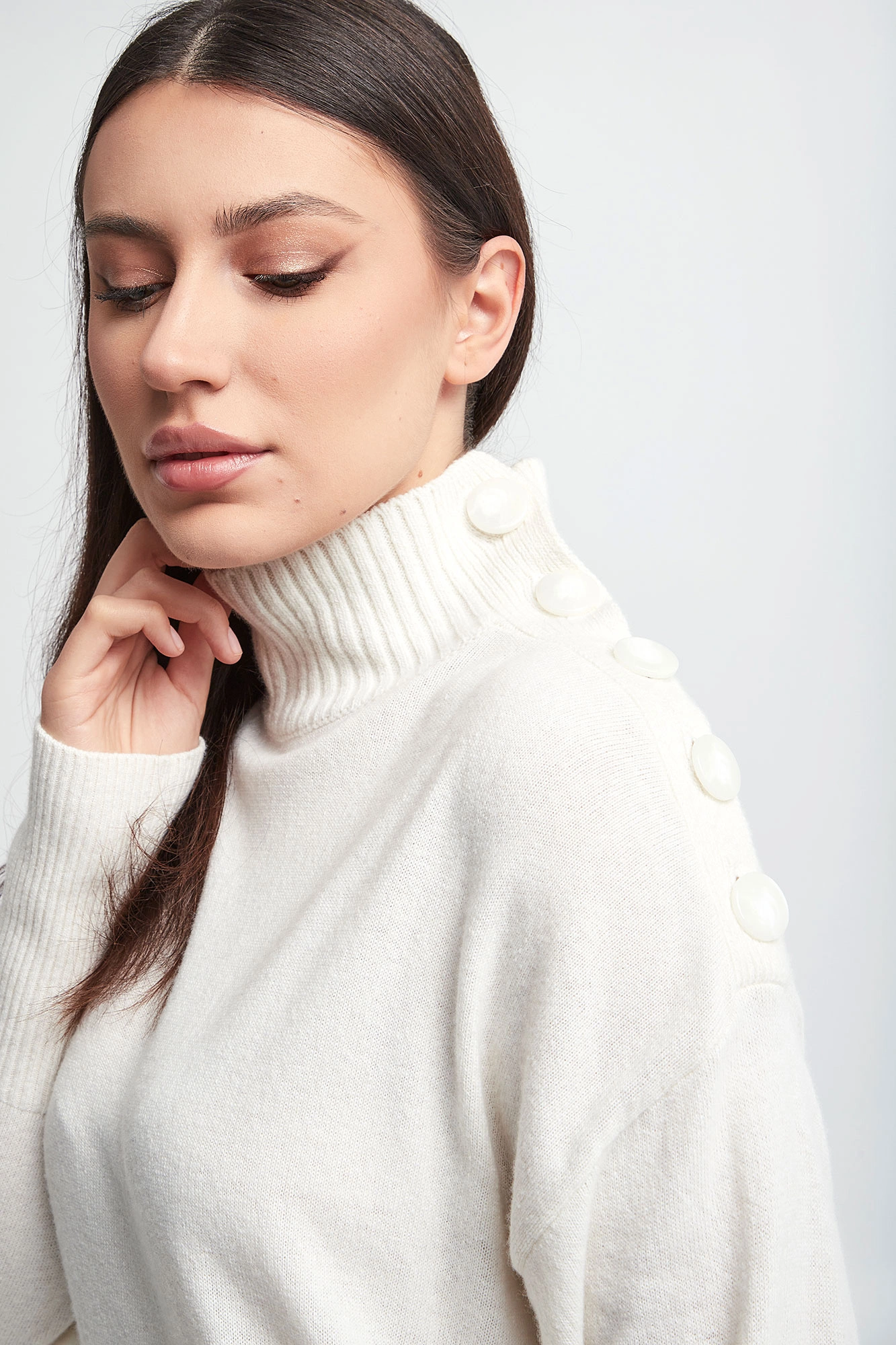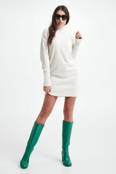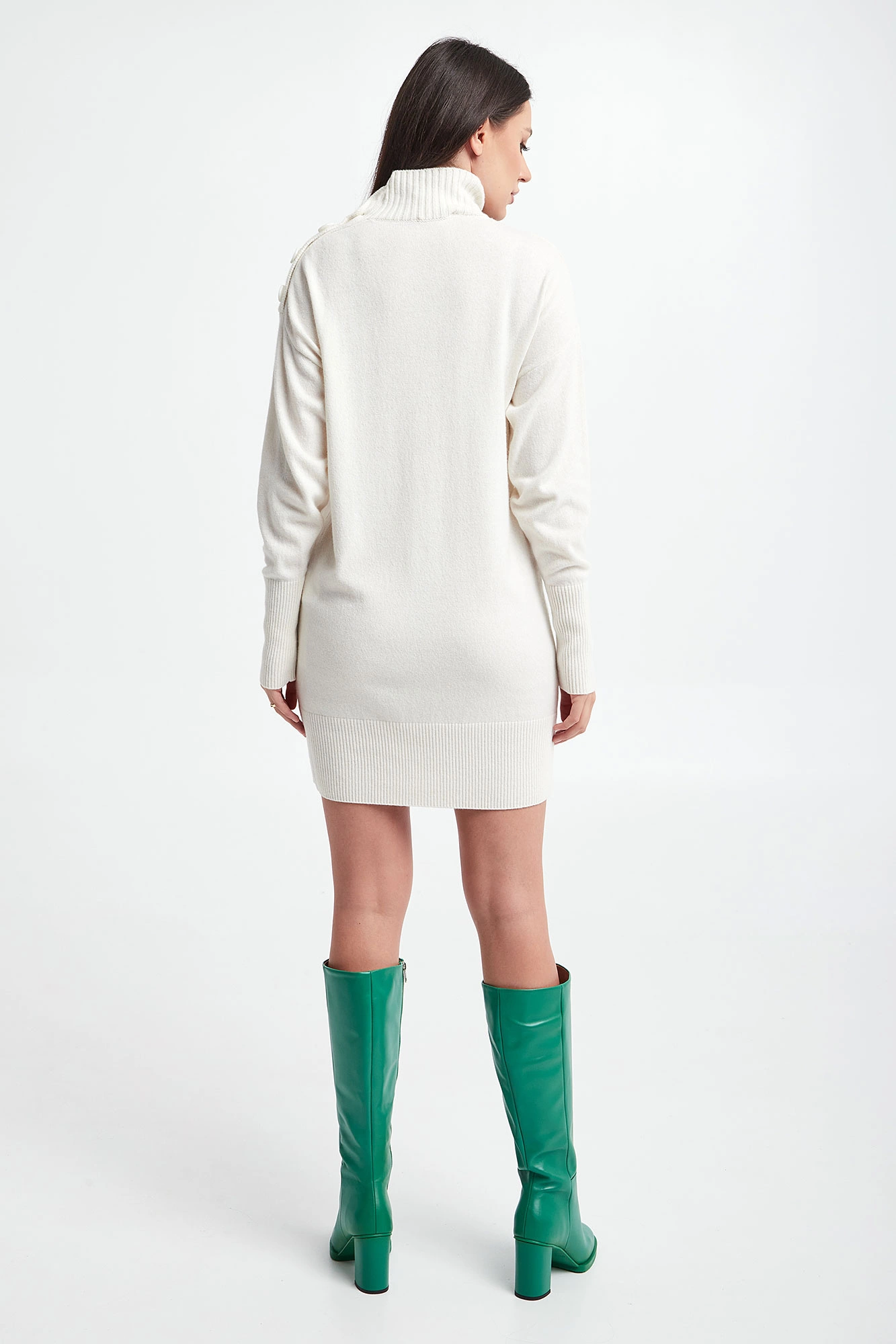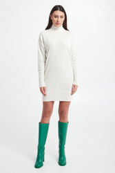 Dzianinowa sukienka marki Marella Monochrome w kolorze ecru. Wykonana z dzianiny z wełną i kaszmirem. Dekolt wykończony szerokim, prążkowanym półgolfem. Model z obniżoną linią ramion. Długie rękawy i dół zakończone szerokim ściągaczem. Na lewym ramieniu zapinana na guziki. Fason relaxed. Długość mini.