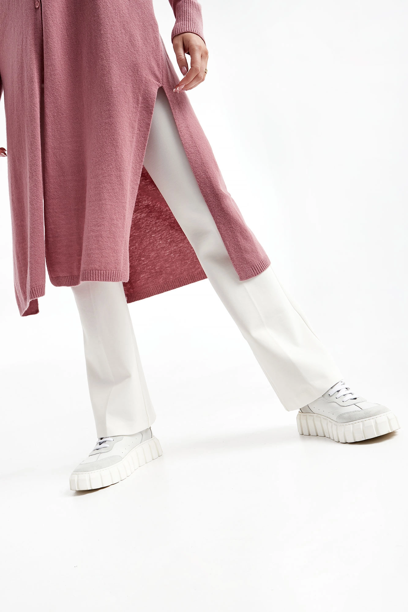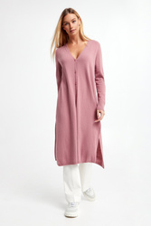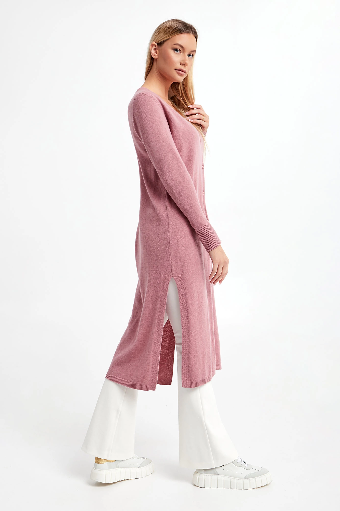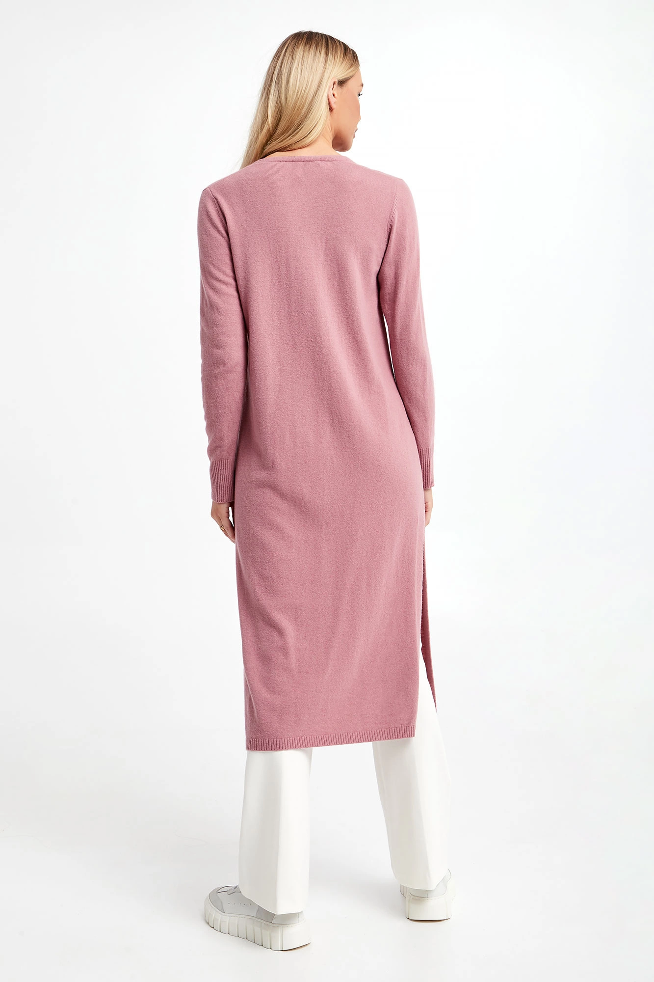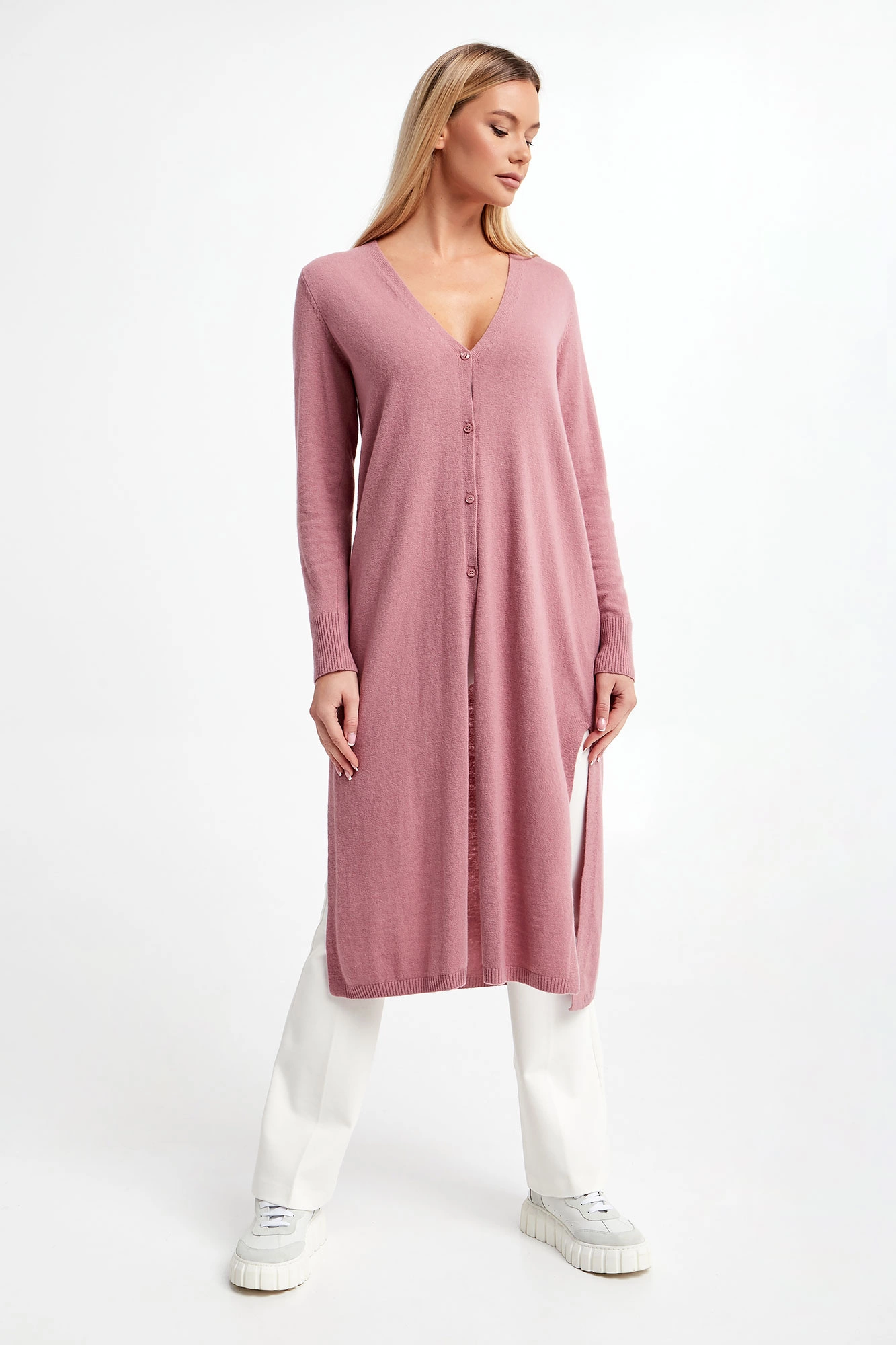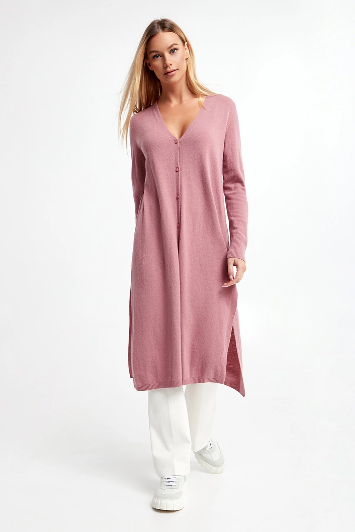 Długi kardigan marki Marella Monochrome w kolorze brudnego różu. Zapinany z przodu na cztery delikatne, sygnowane guziki. Z przodu i po bokach rozcięcia. Dekolt typu V-neck. Długie rękawy i dół wykończone ściągaczem prążkowanym. Fason typu relaxed.