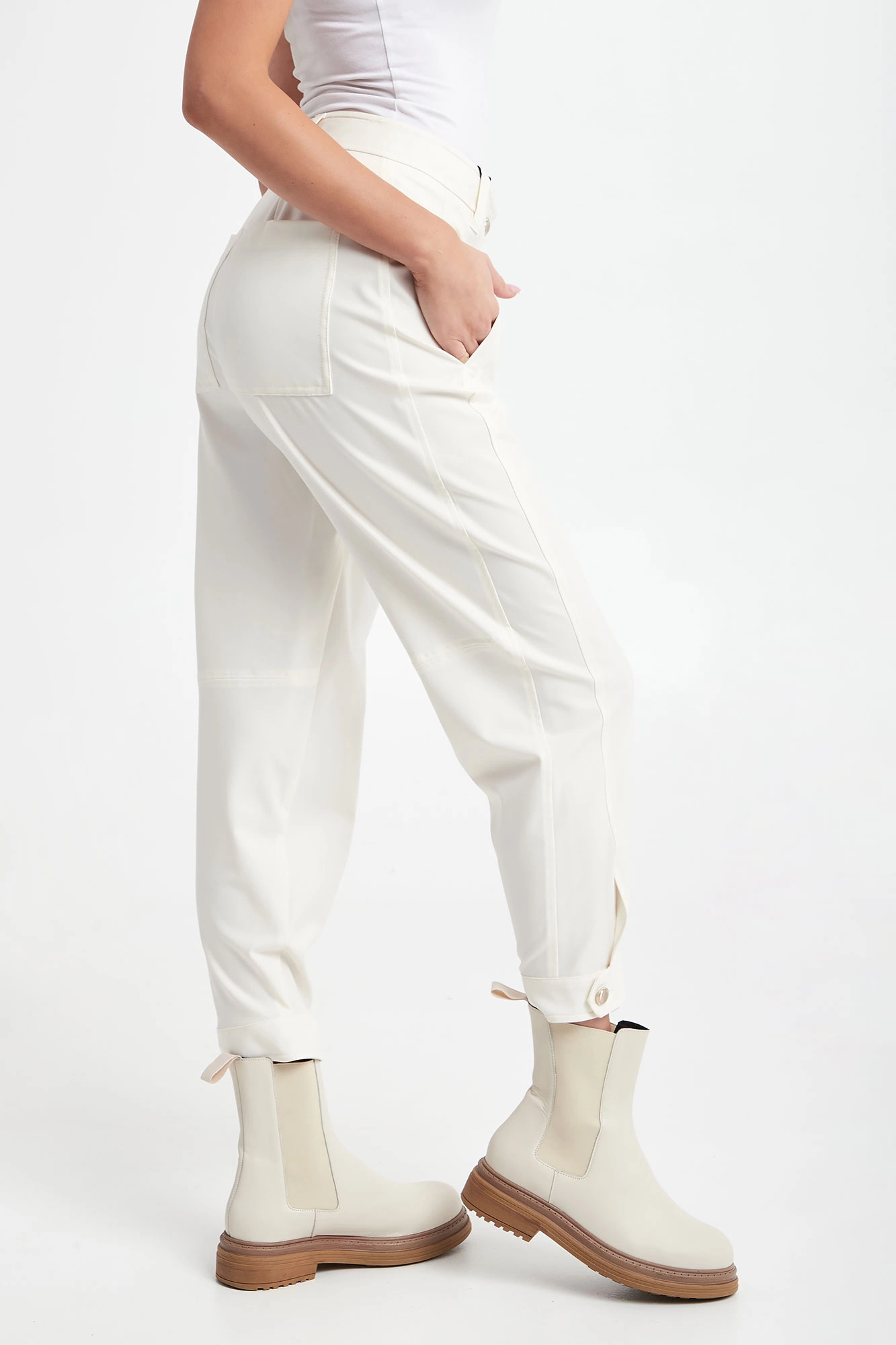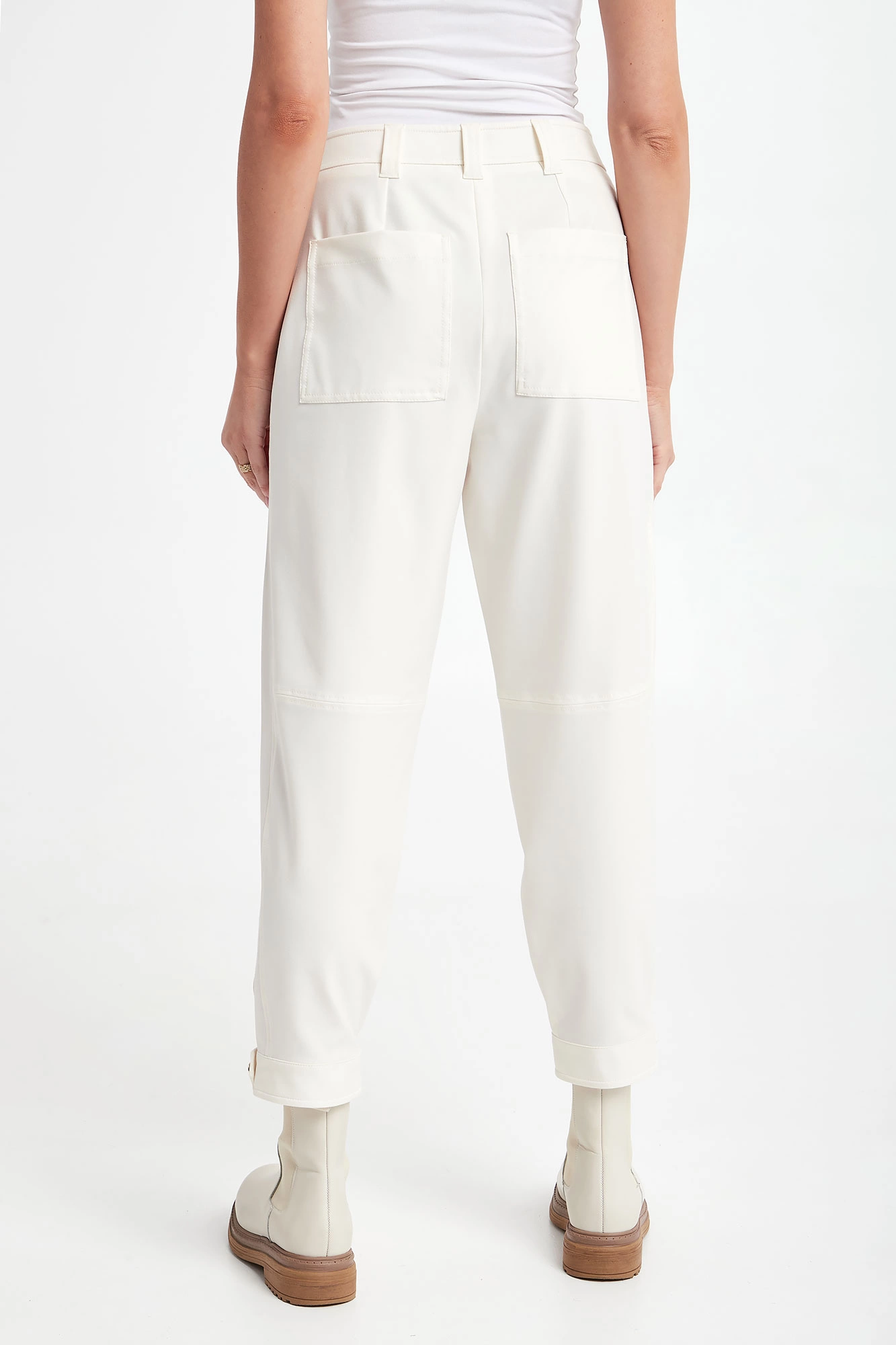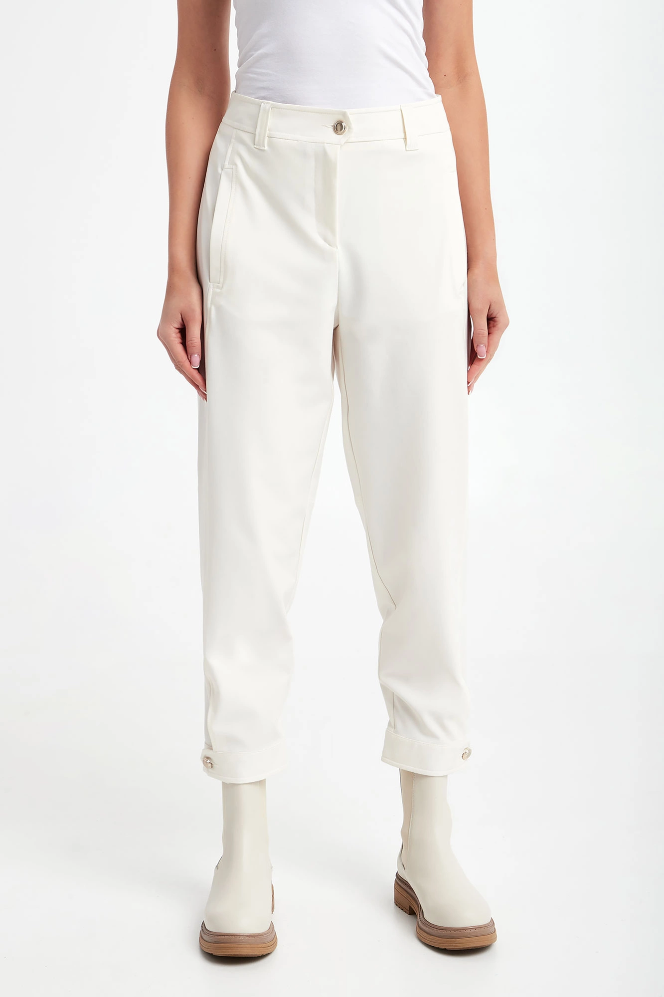 Spodnie marki Marella w kolorze ecru. Kieszenie wpuszczane na przodzie i naszywane z tyłu. Zapinane na kryty suwak i guzik. Ozdobne przeszycia na tyle. Nogawki wykończone mankietami zapinanymi na guzik w srebrnym kolorze. Wykonane z elastycznego materiału. Fason typu regular.