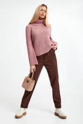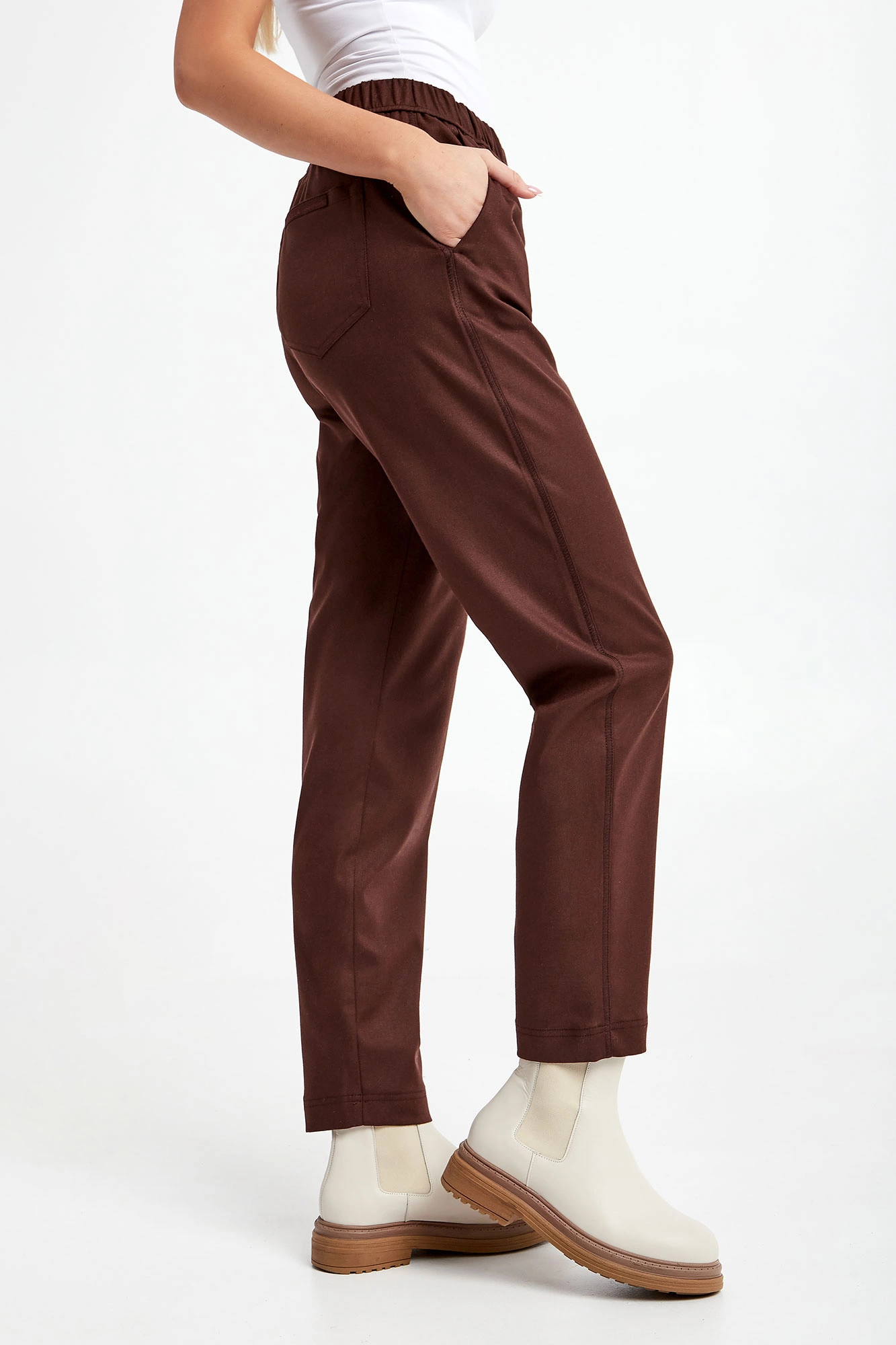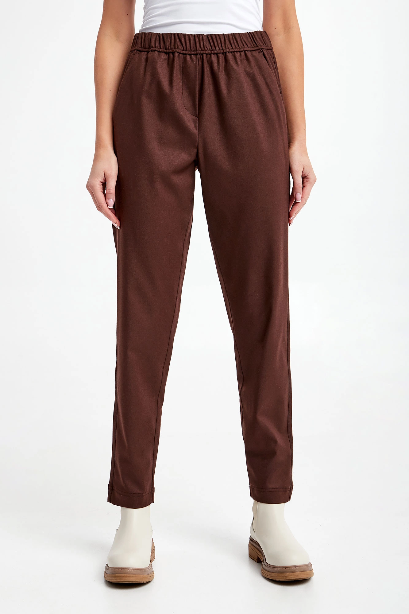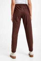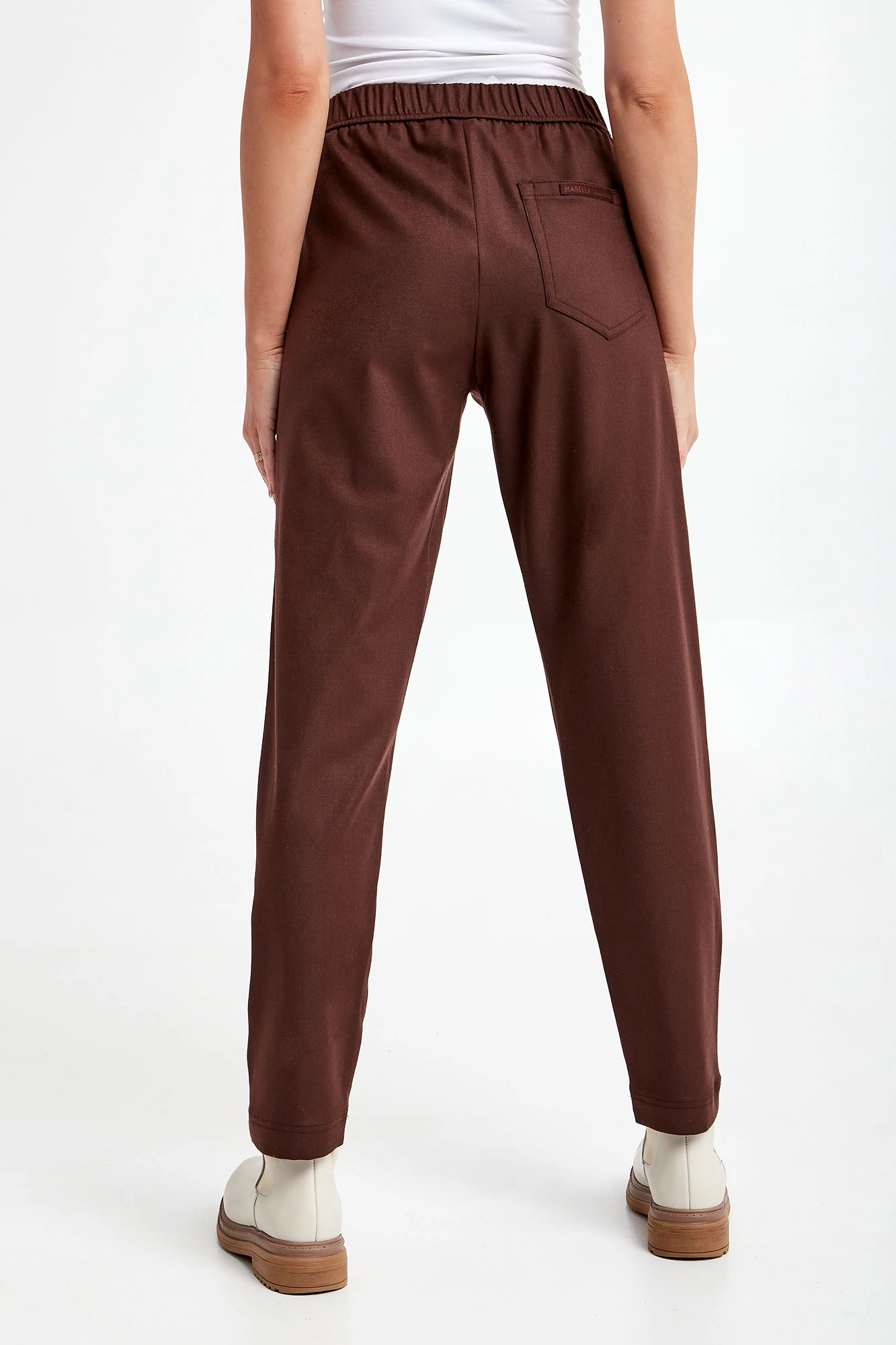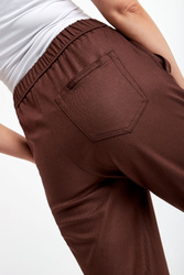 Spodnie marki Marella Monochrome w brązowym kolorze. Fason typu loose. W pasie elastyczny ściągacz. Model z trzema wpuszczanymi kieszeniami. Na tylnej logowana zawieszka. Nogawki ozdobione po bokach przeszyciami wykończone lamówką. Wykonane z wiskozowej tkaniny z dodatkiem wełny oraz włókien elastycznych.