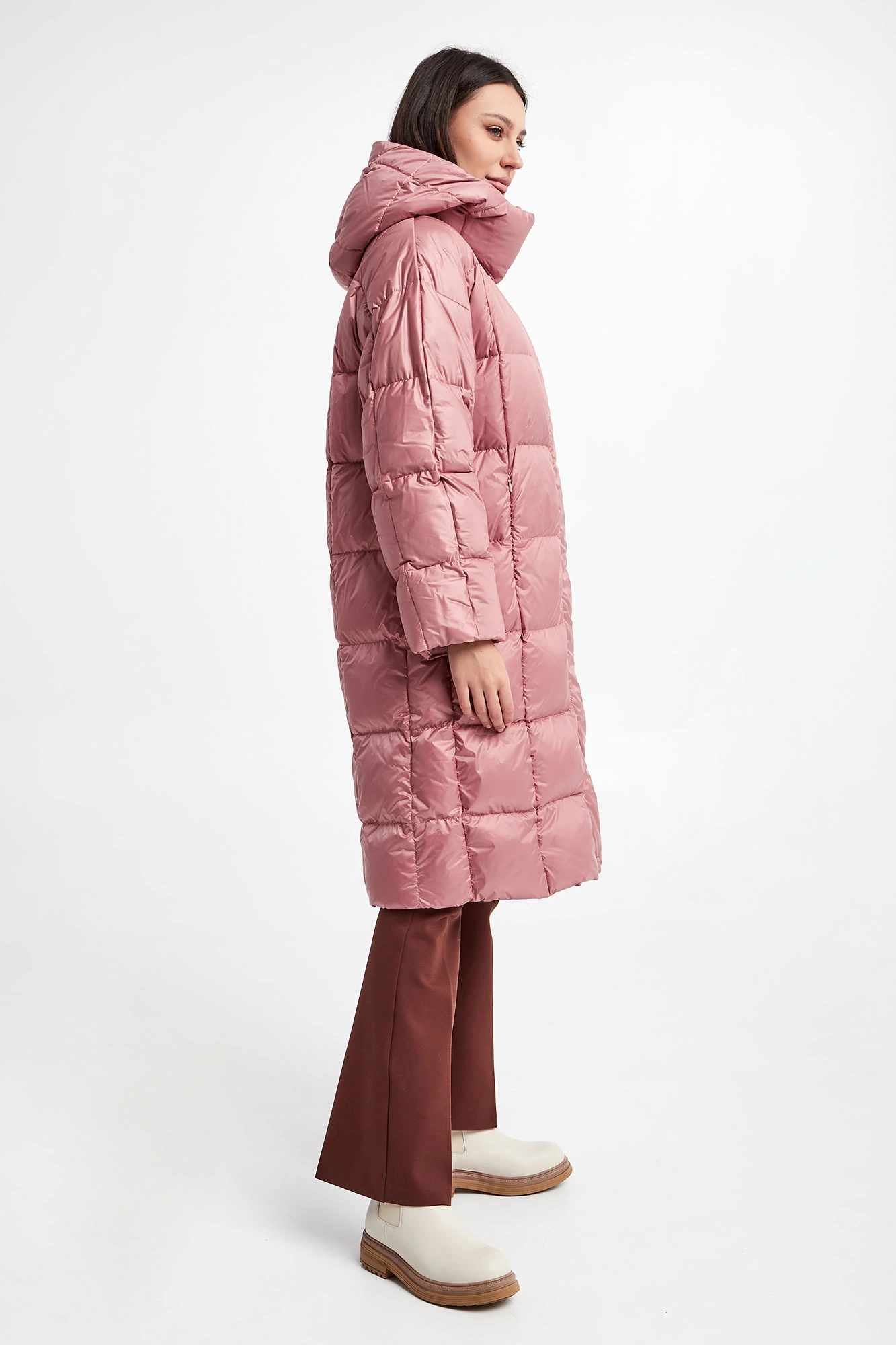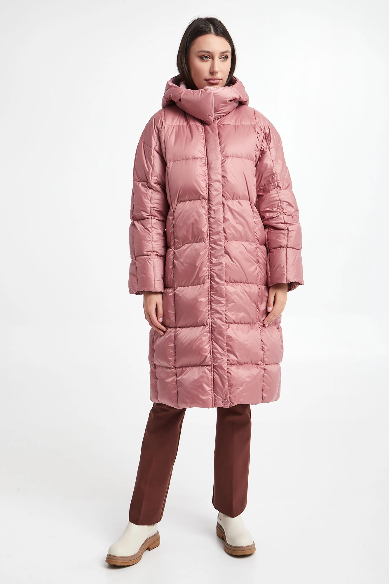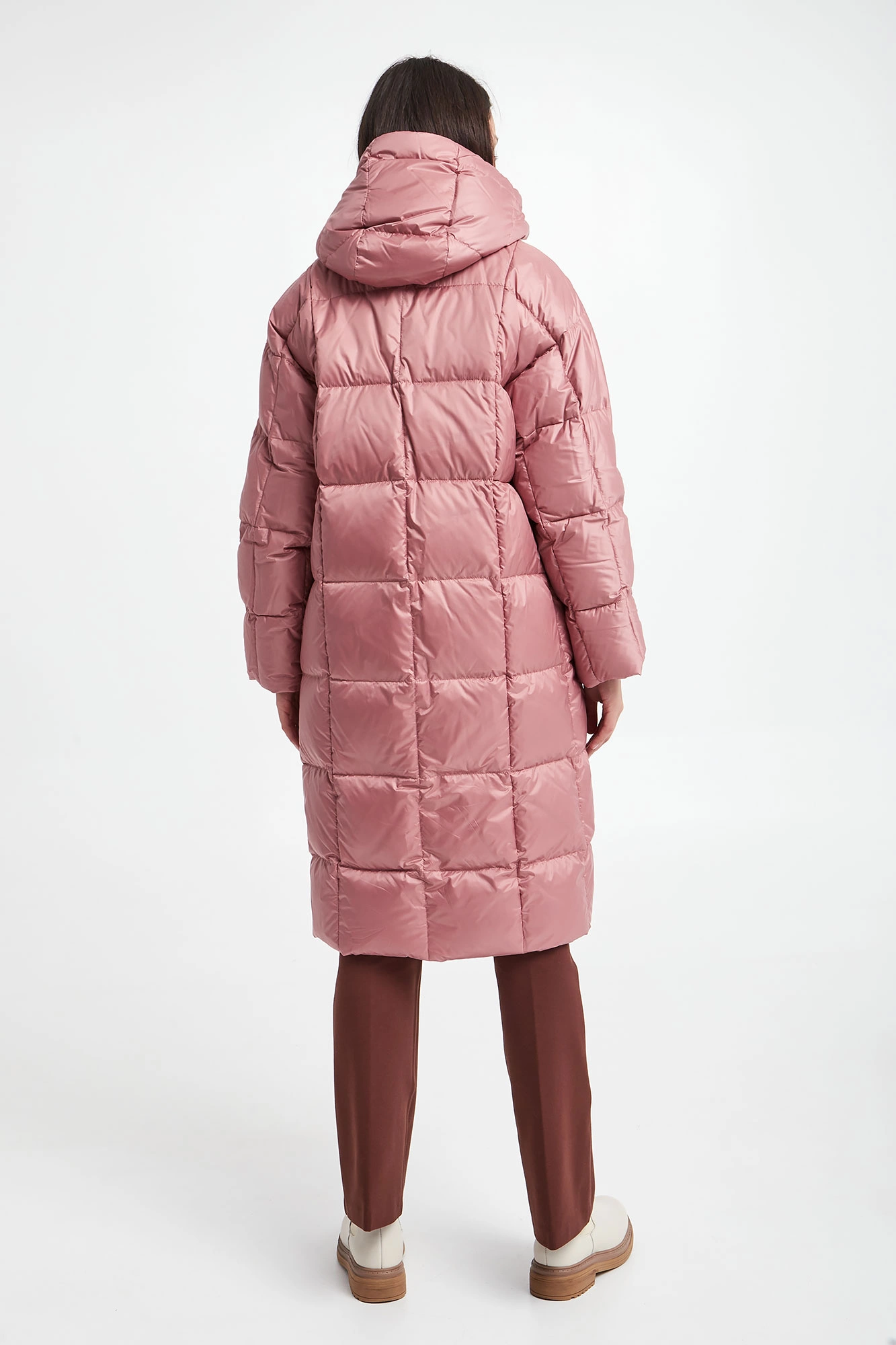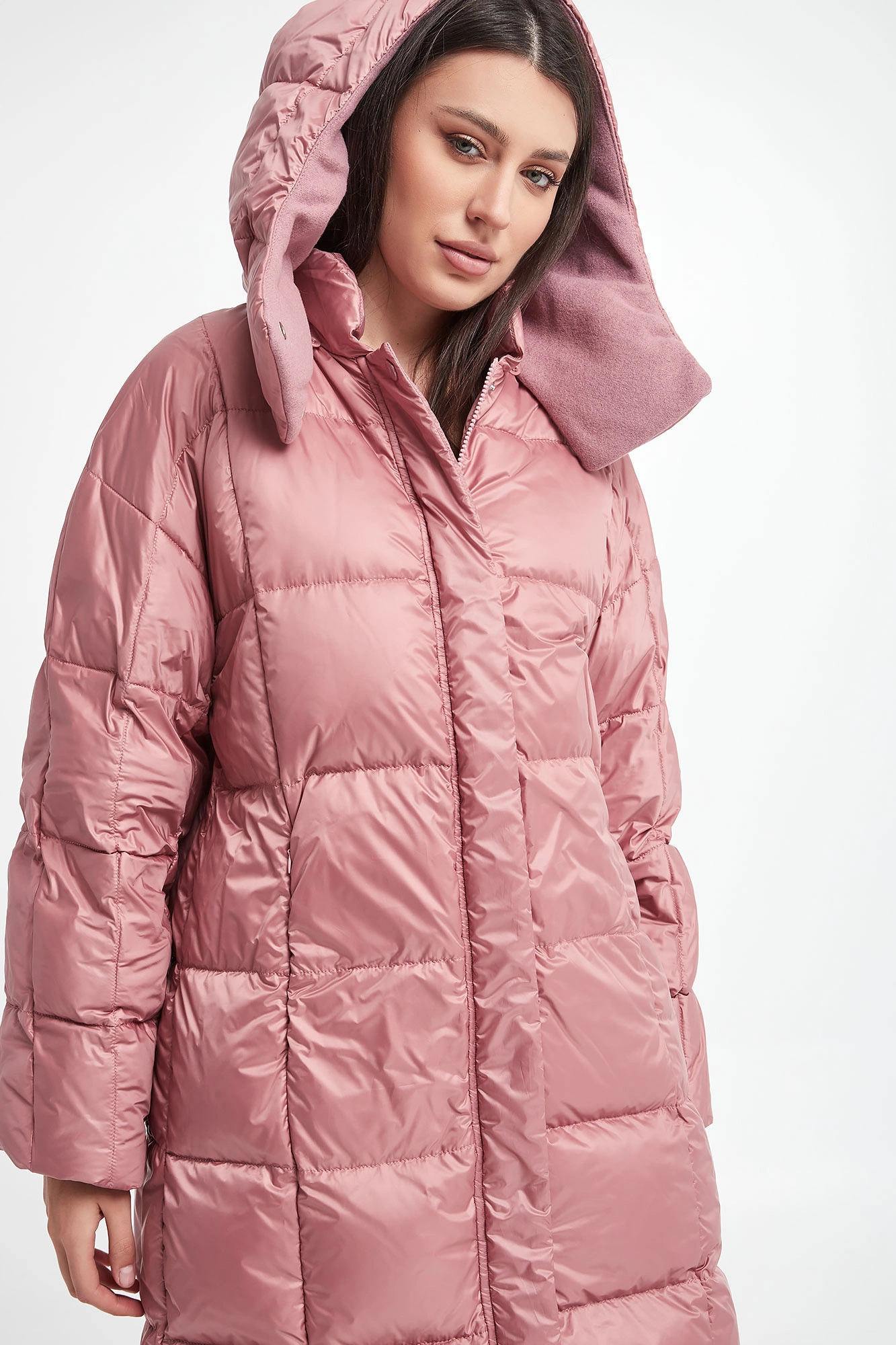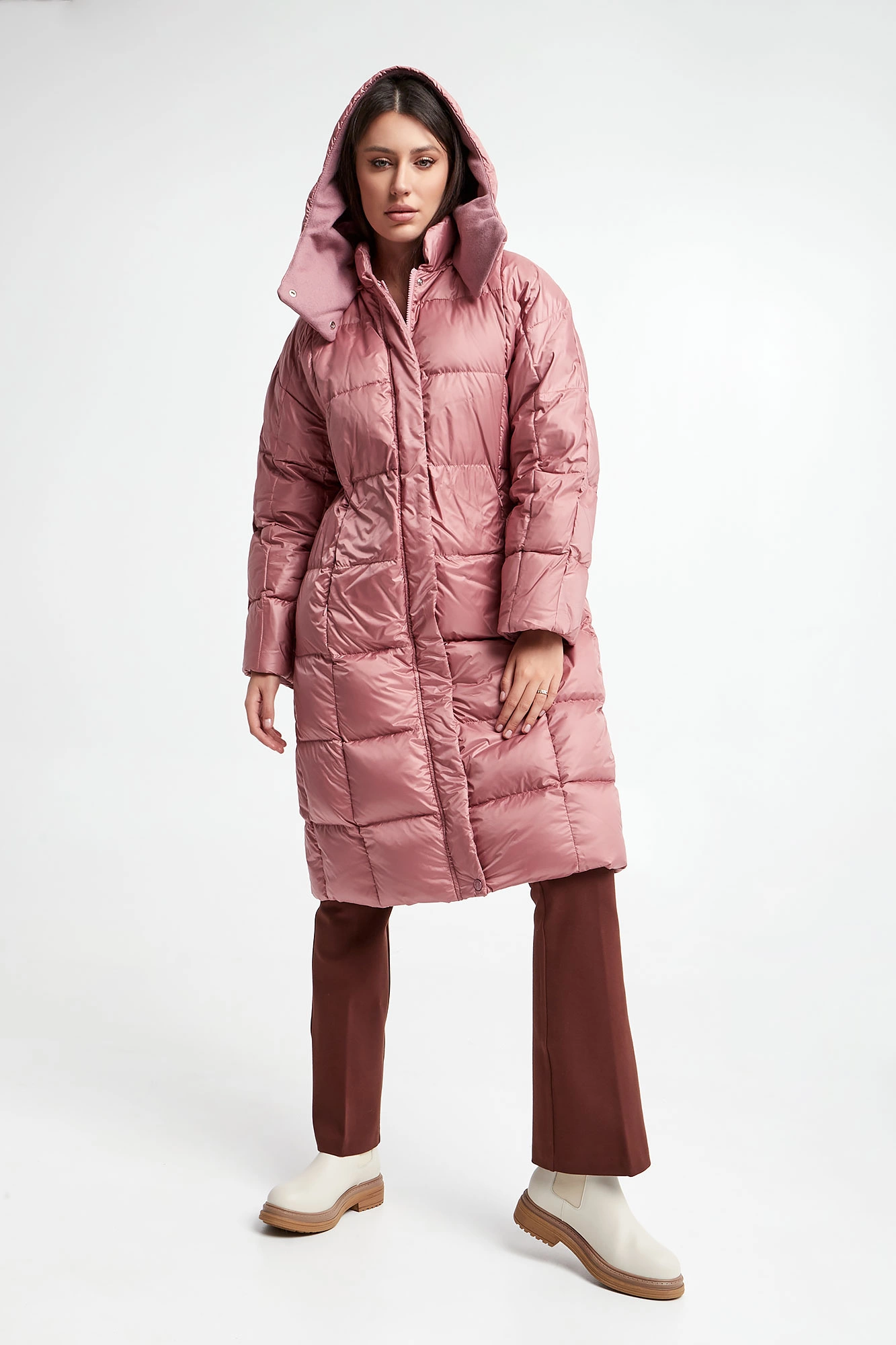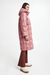 Pikowany płaszcz marki Marella w różowym kolorze. Z odpinanym kapturem na guziki. Na przodzie dwie kieszenie na suwak. Model zapinany za pomocą dwukierunkowego zamka pokrytego tasiemką zapinaną na napy. Obniżona linia ramion. Fason typu relaxed. Wykonany z materiałów z recyklingu.