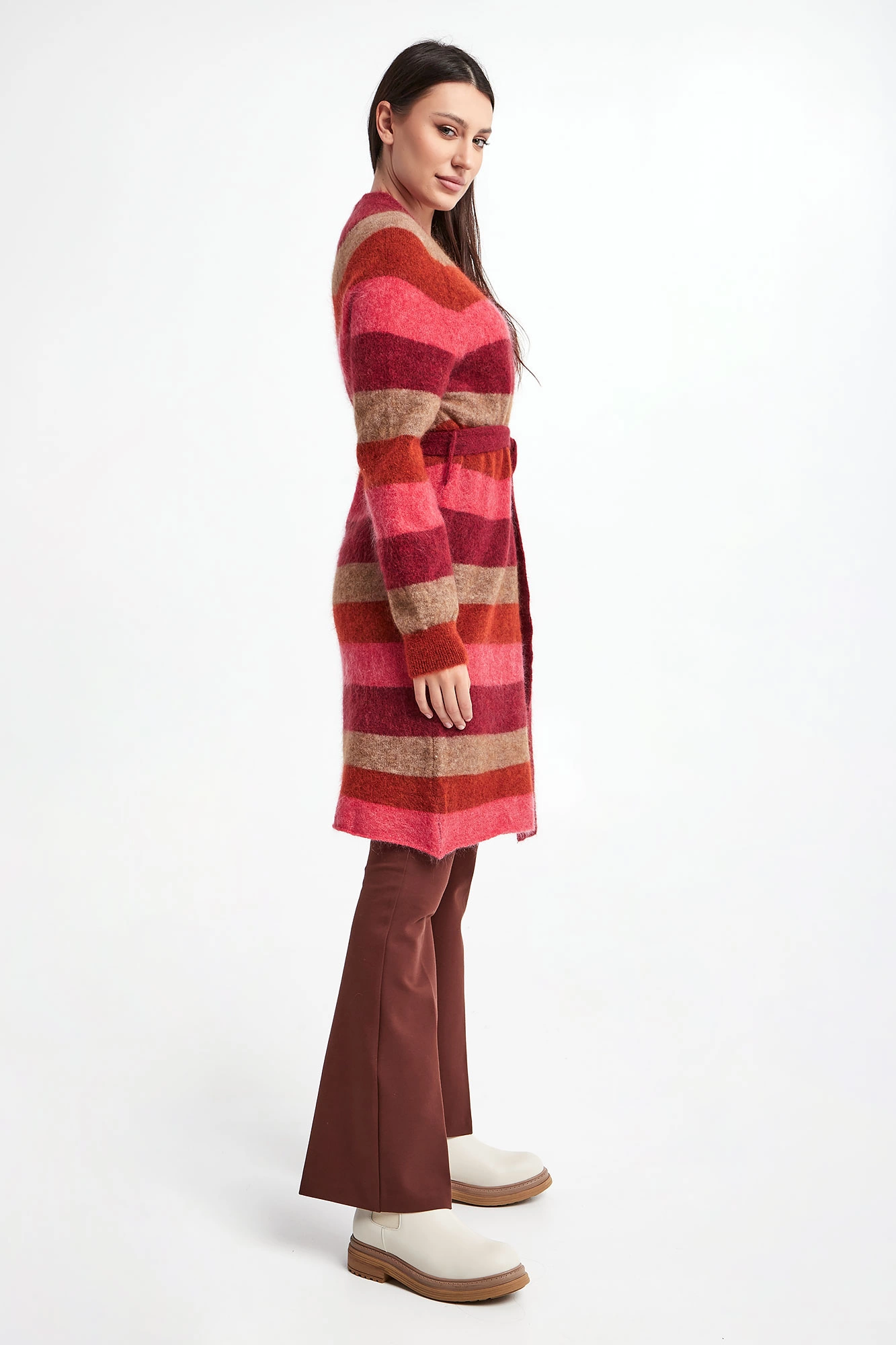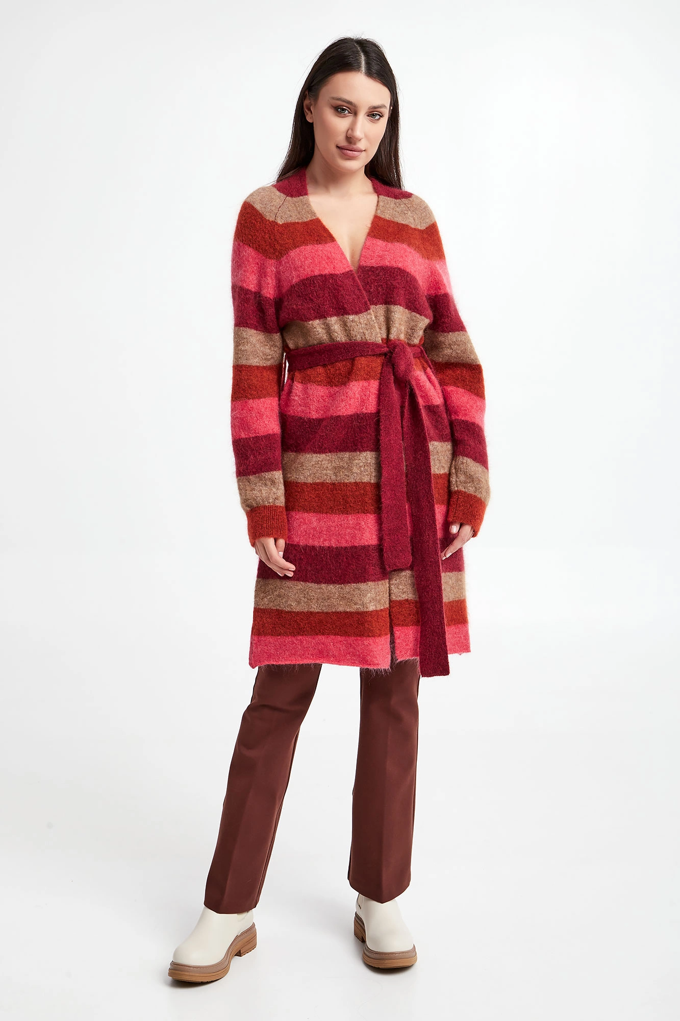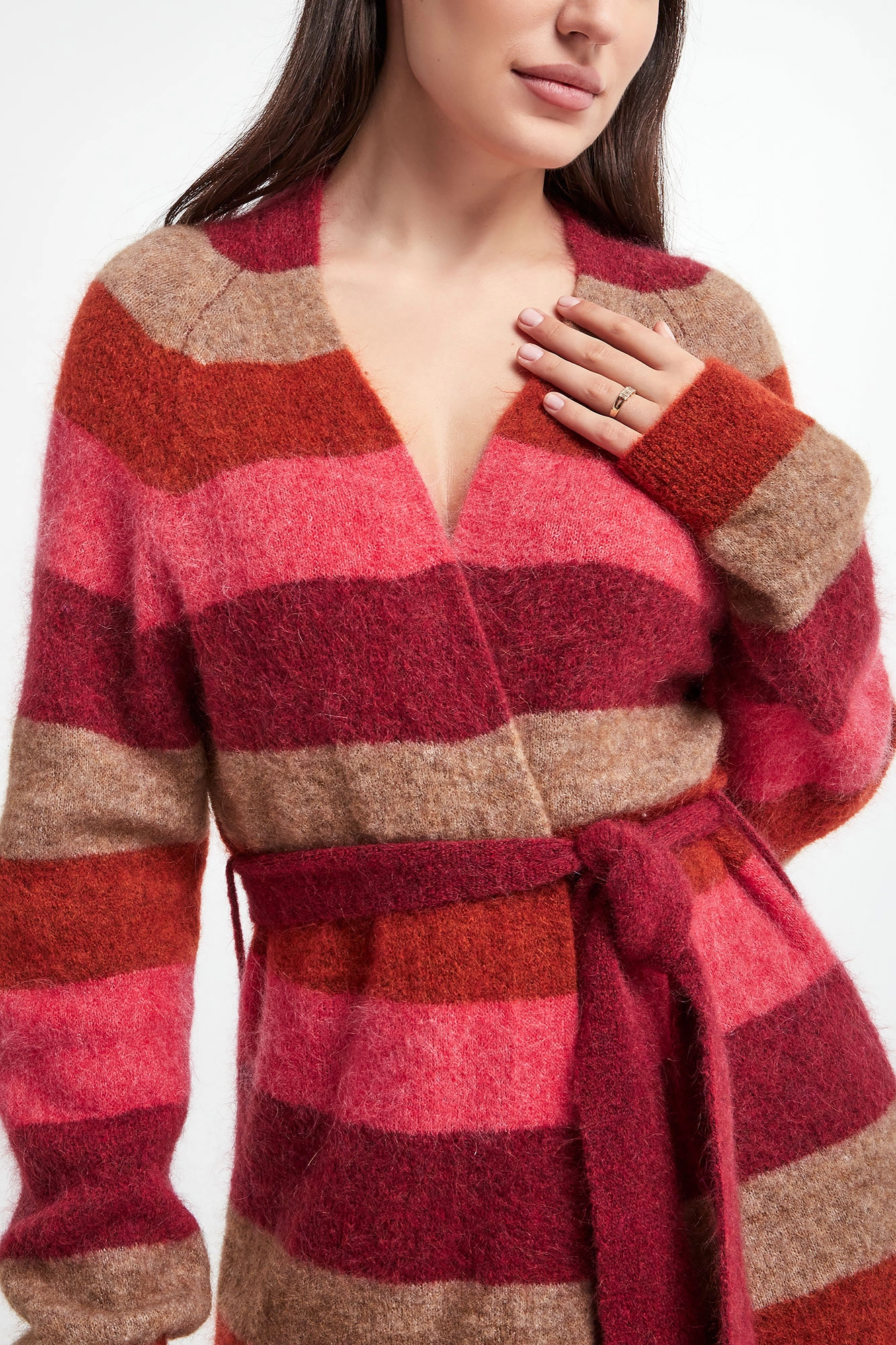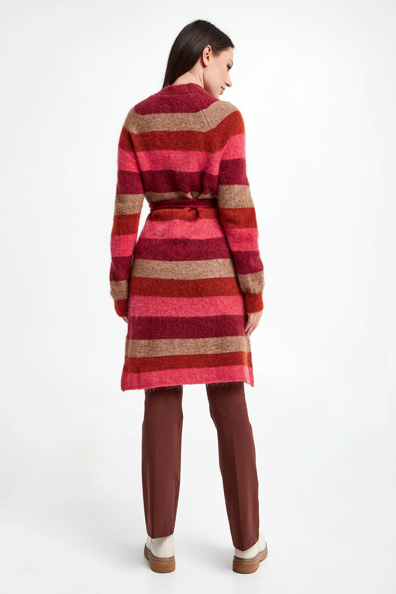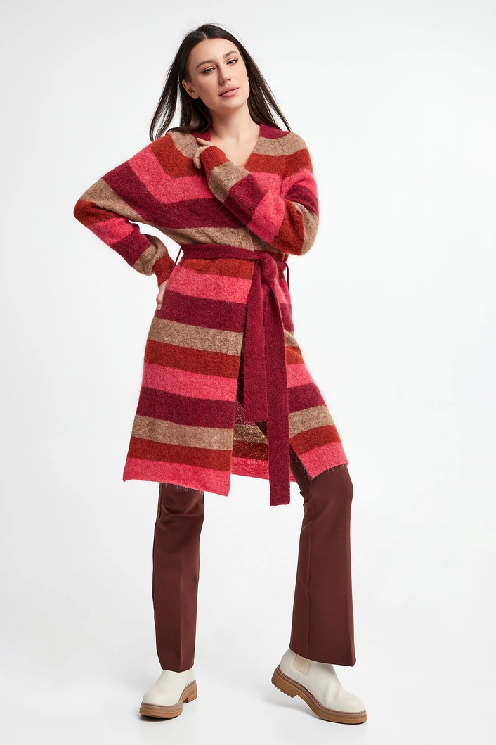 Moherowy kardigan marki Marella. Wykonany z miękkiego, elastycznego, wełnianego materiału. Na całości wielokolorowe poziome pasy. W talii szlufki i pasek w buraczkowym kolorze. Fason typu relaxed.