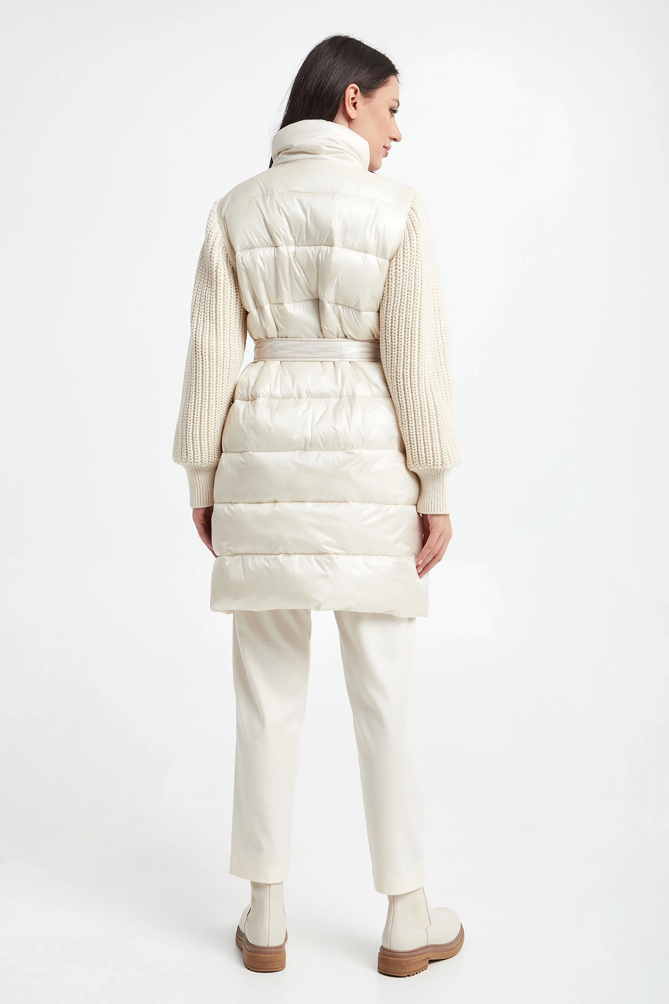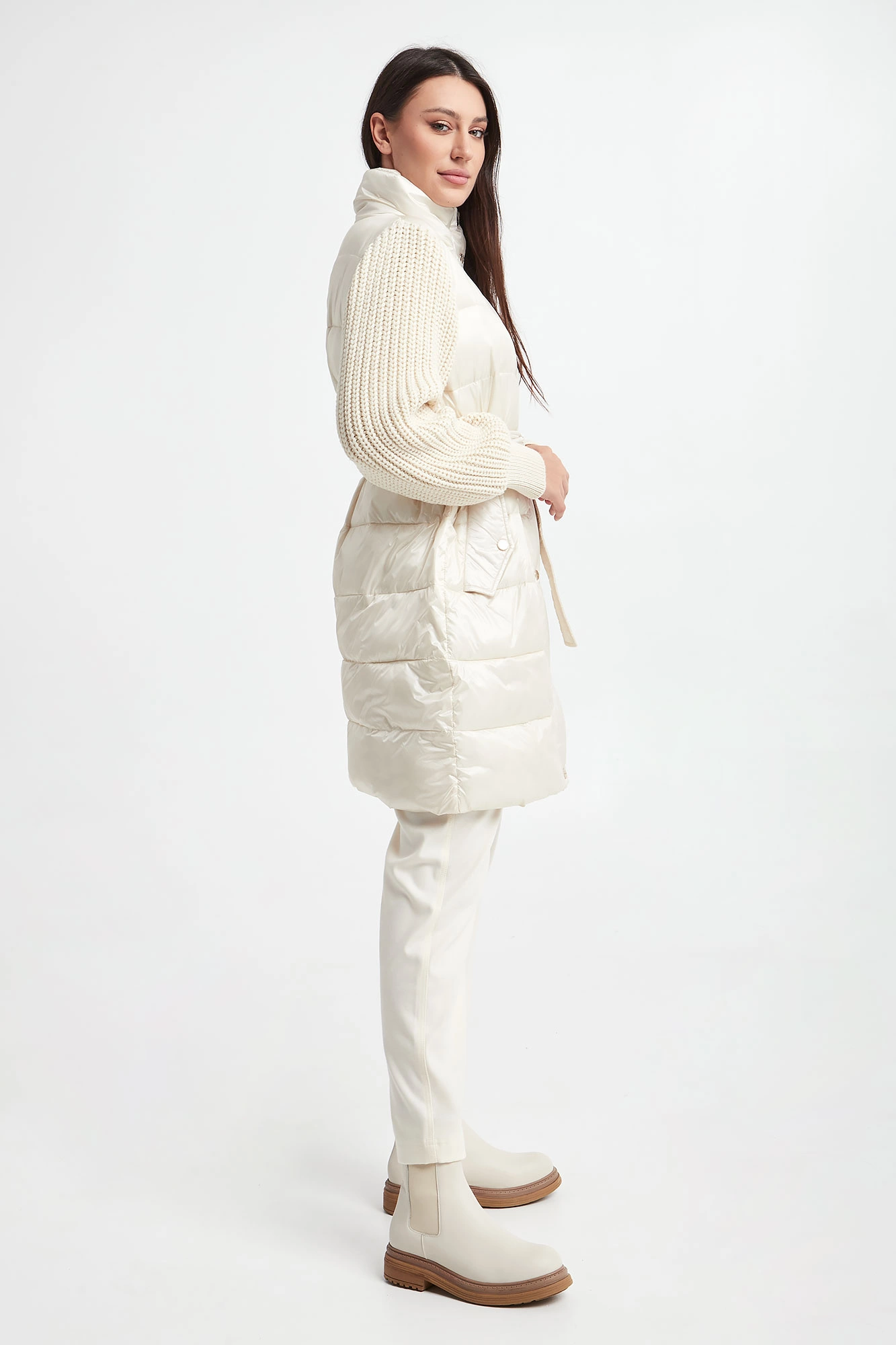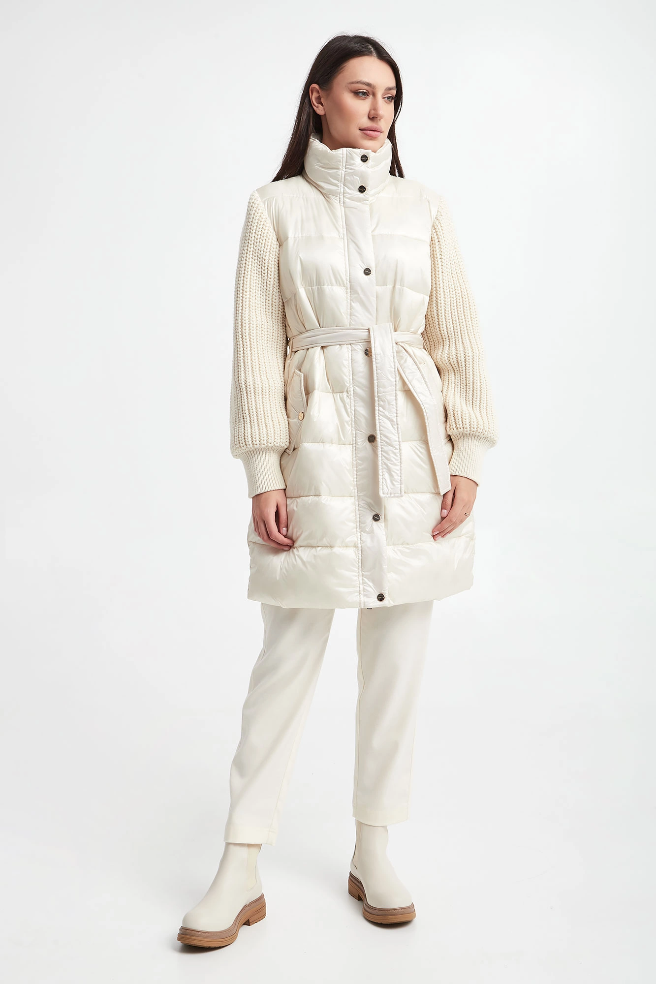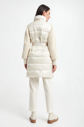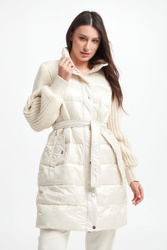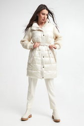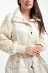 Płaszcz pikowany marki Marella Sport w kolorze złamanej bieli. Z kołnierzem. Na przodzie dwie kieszenie zapinane na zatrzask. Swetrowe rękawy z warkoczowym splotem, wykończone ściągaczami. W tali wiązany pas. Zapinany za pomocą krytego, dwukierunkowego zamka oraz nap. Fason typu regular.