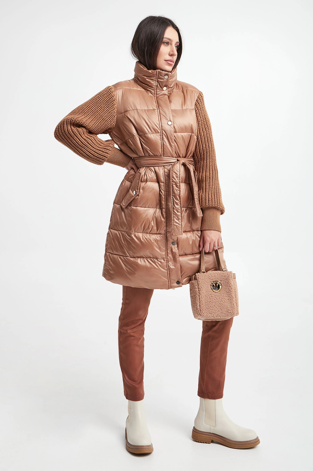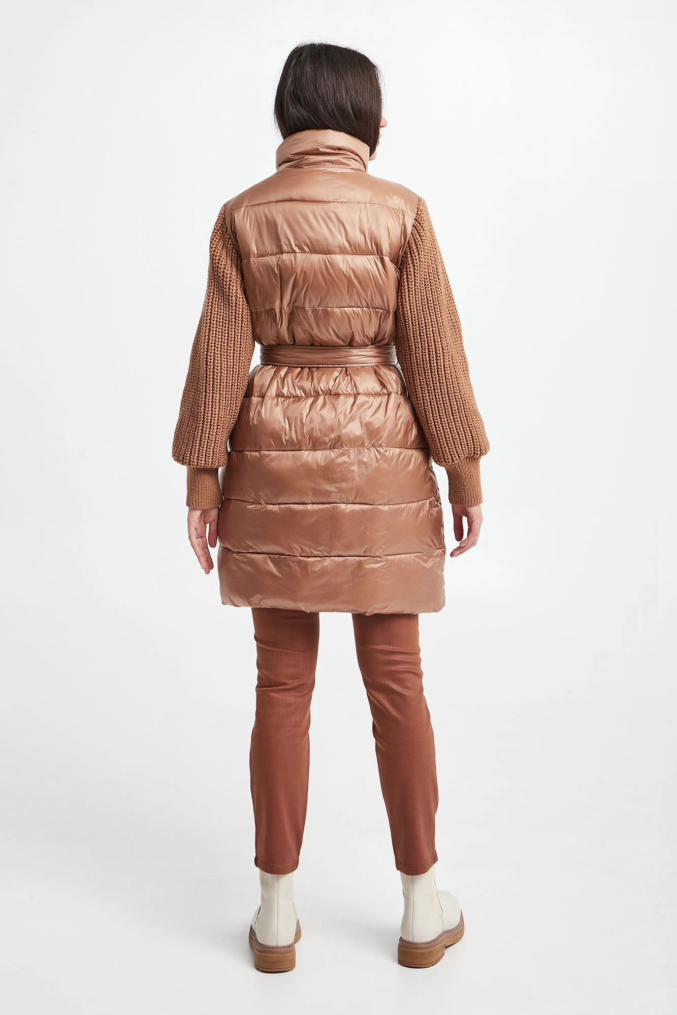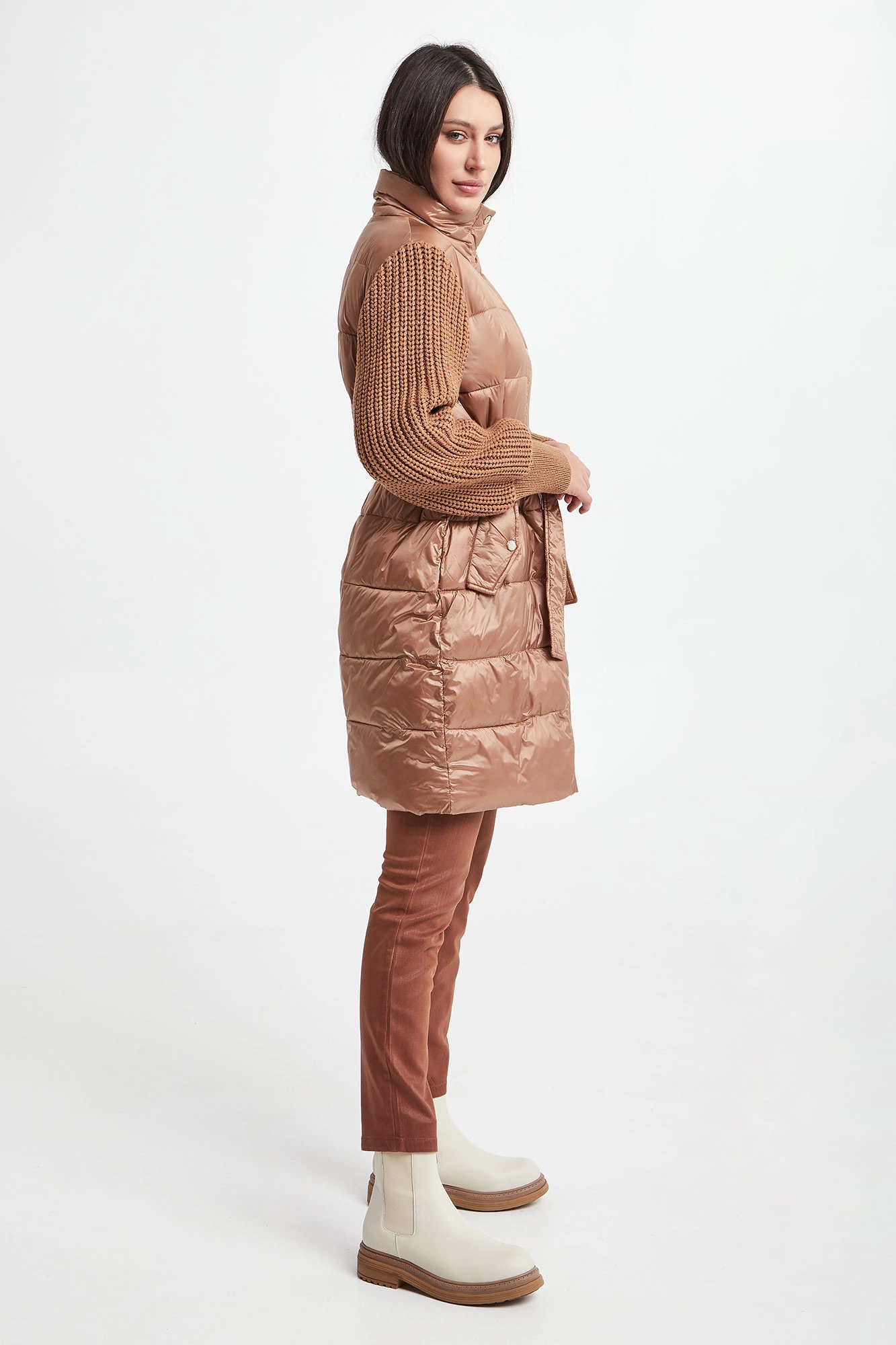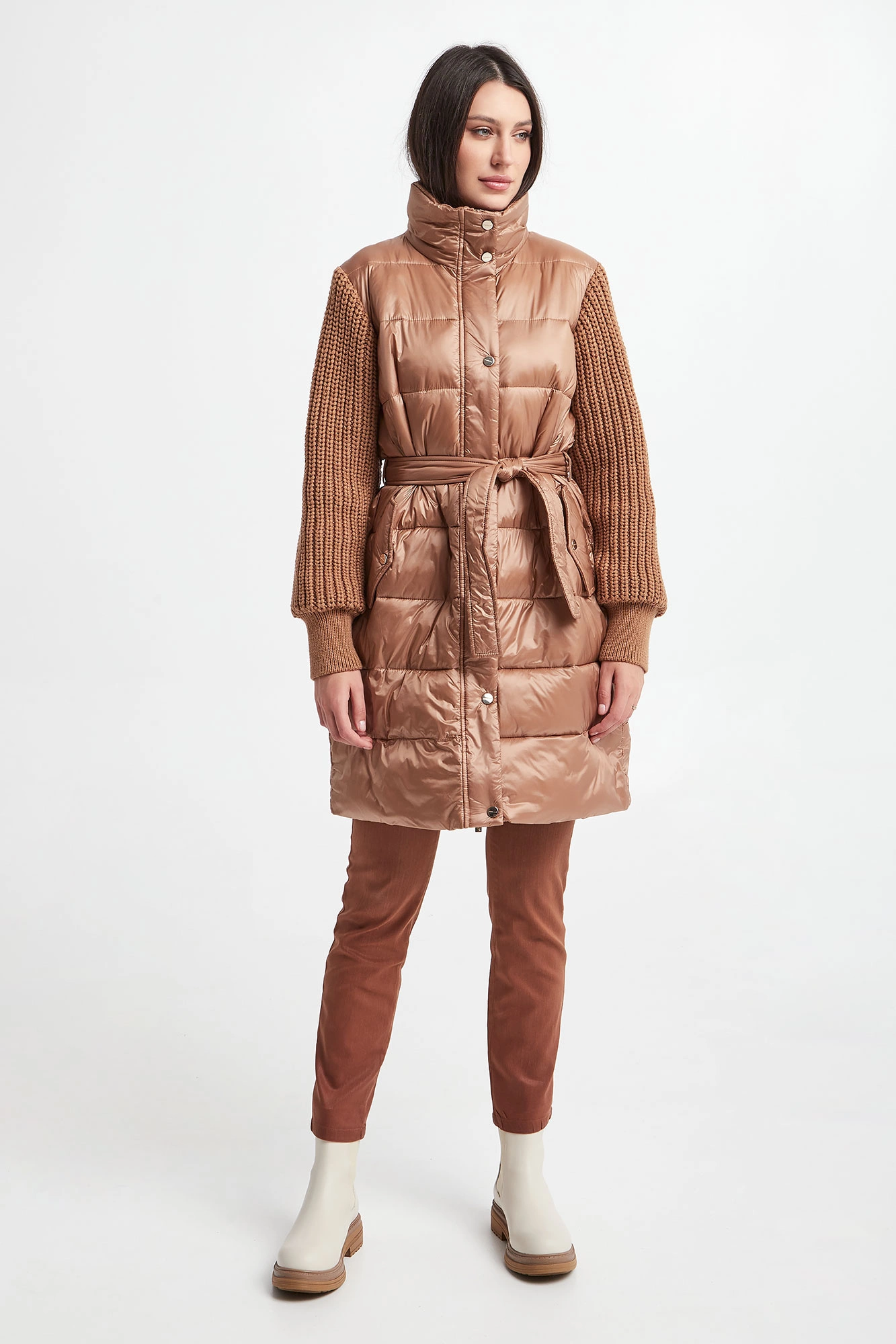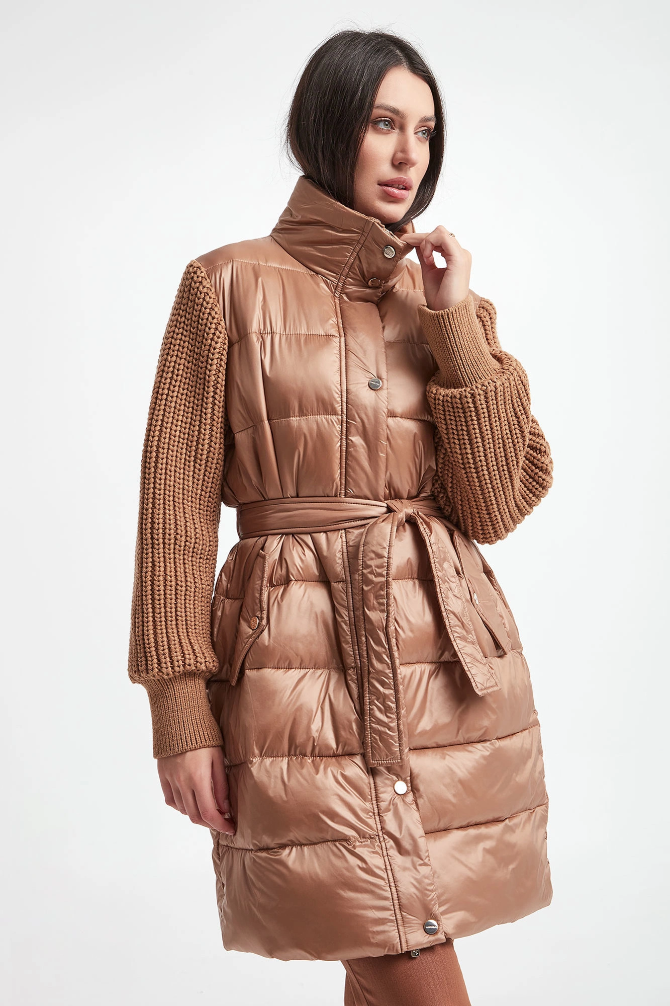 Płaszcz pikowany marki Marella Sport w beżowym kolorze. Z kołnierzem. Na przodzie dwie kieszenie zapinane na zatrzask. Swetrowe rękawy z warkoczowym splotem, wykończone ściągaczami. W tali wiązany pas. Zapinany za pomocą krytego, dwukierunkowego zamka oraz nap. Fason typu regular.