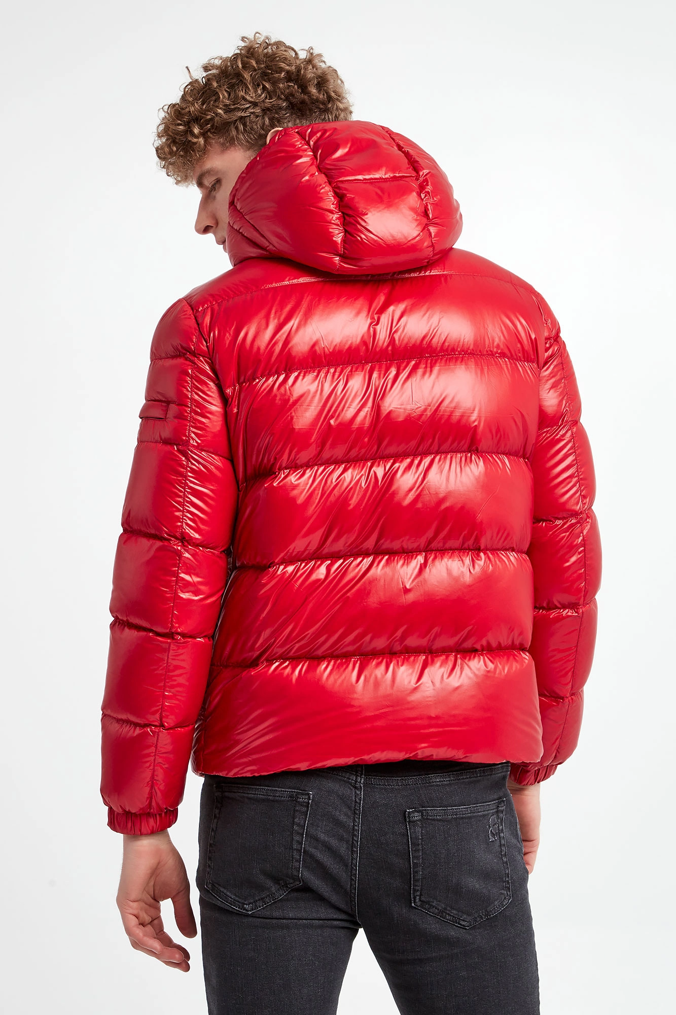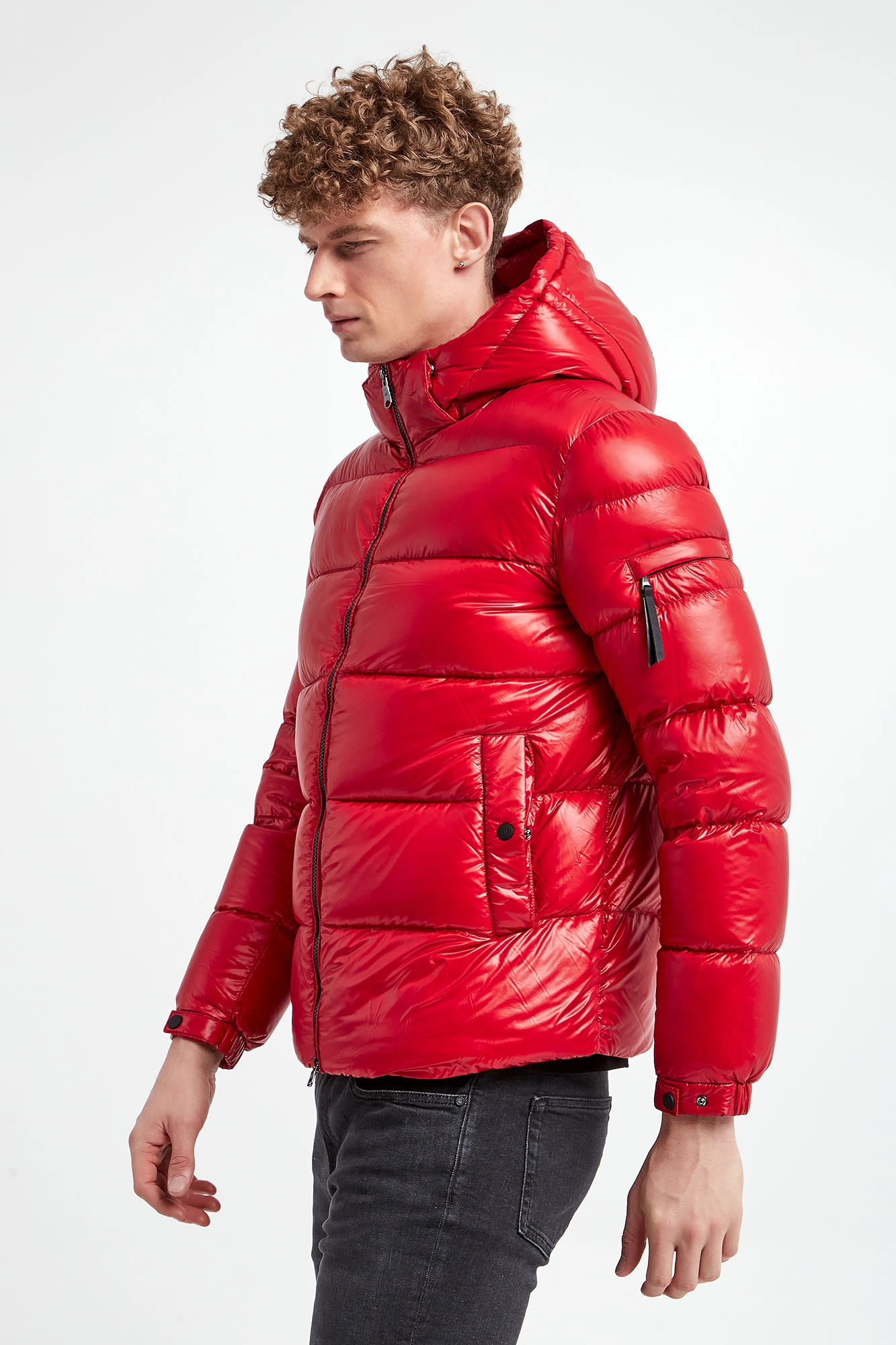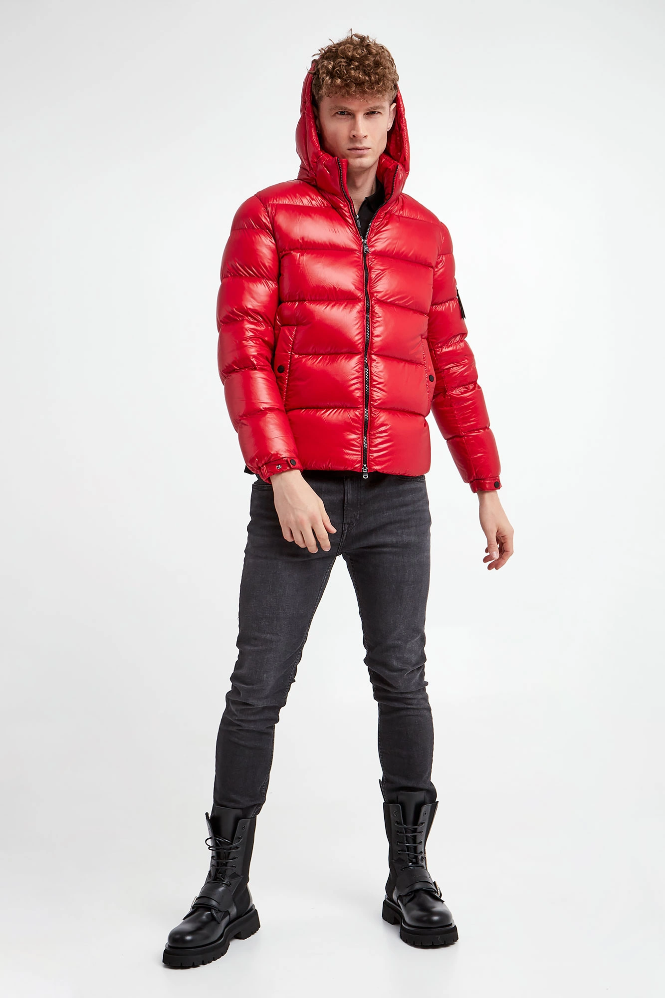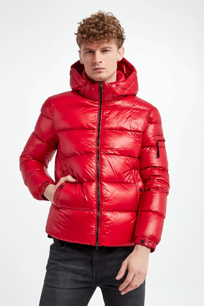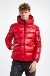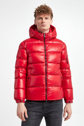 Kurtka puchowa marki Hetrego w czerwonym kolorze. Naturalne wypełnienie. Całość wykończona poziomym pikowaniem. Odpinany kaptur. Z przodu dwie kieszenie na zatrzask. Na lewym ramieniu kieszeń na suwak. Zapinana za pomocą dwukierunkowego zamka. Wewnątrz dodatkowe kieszenie. Fason typu regular.